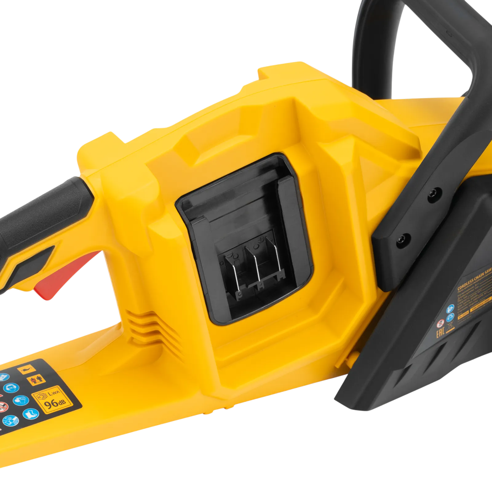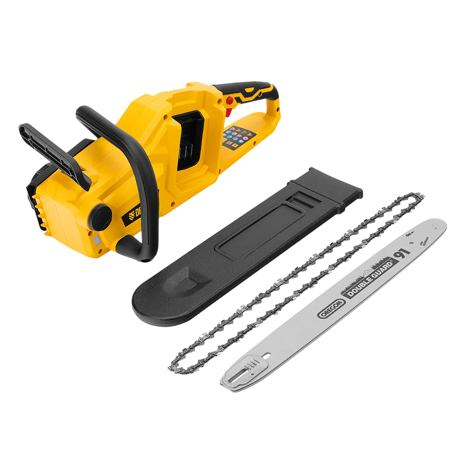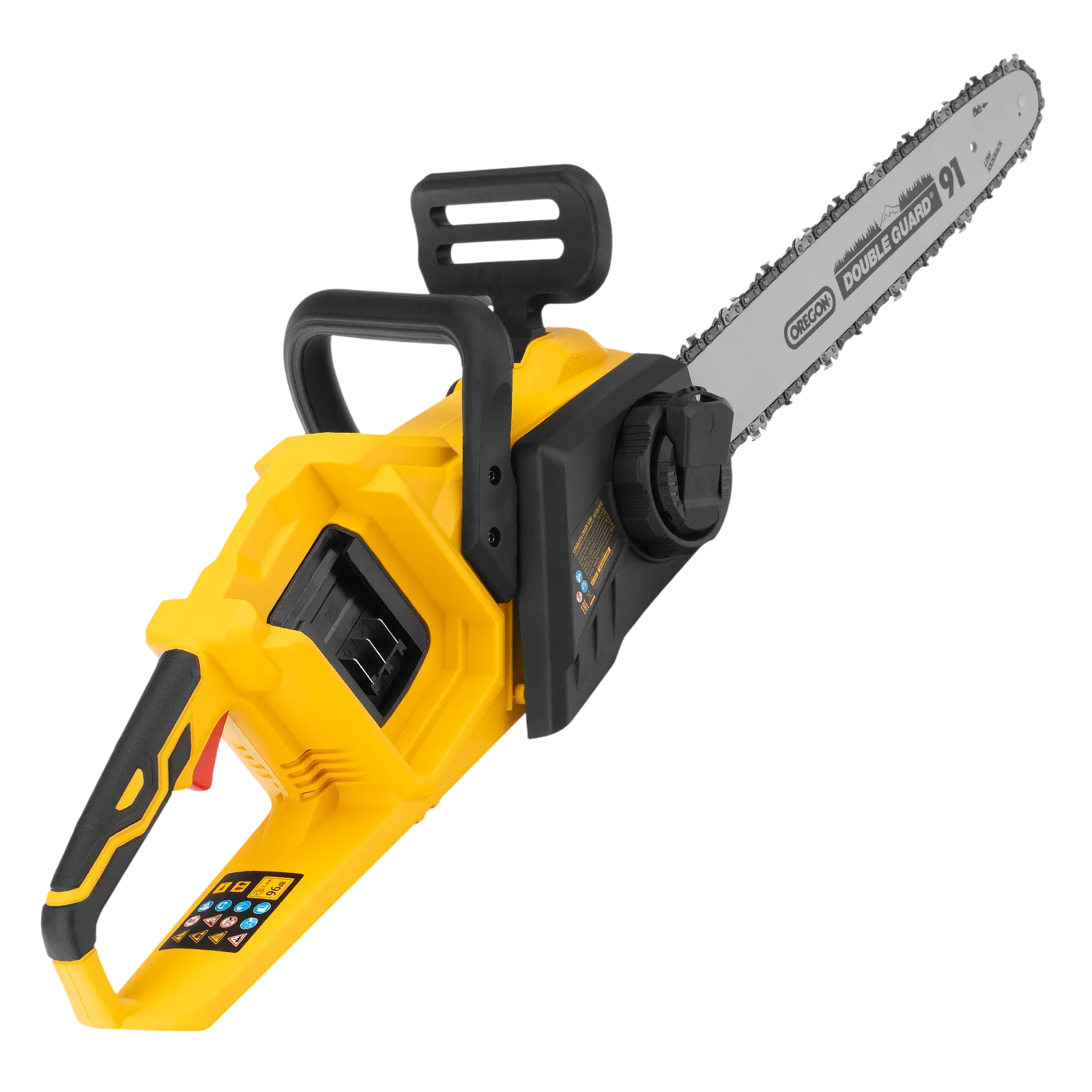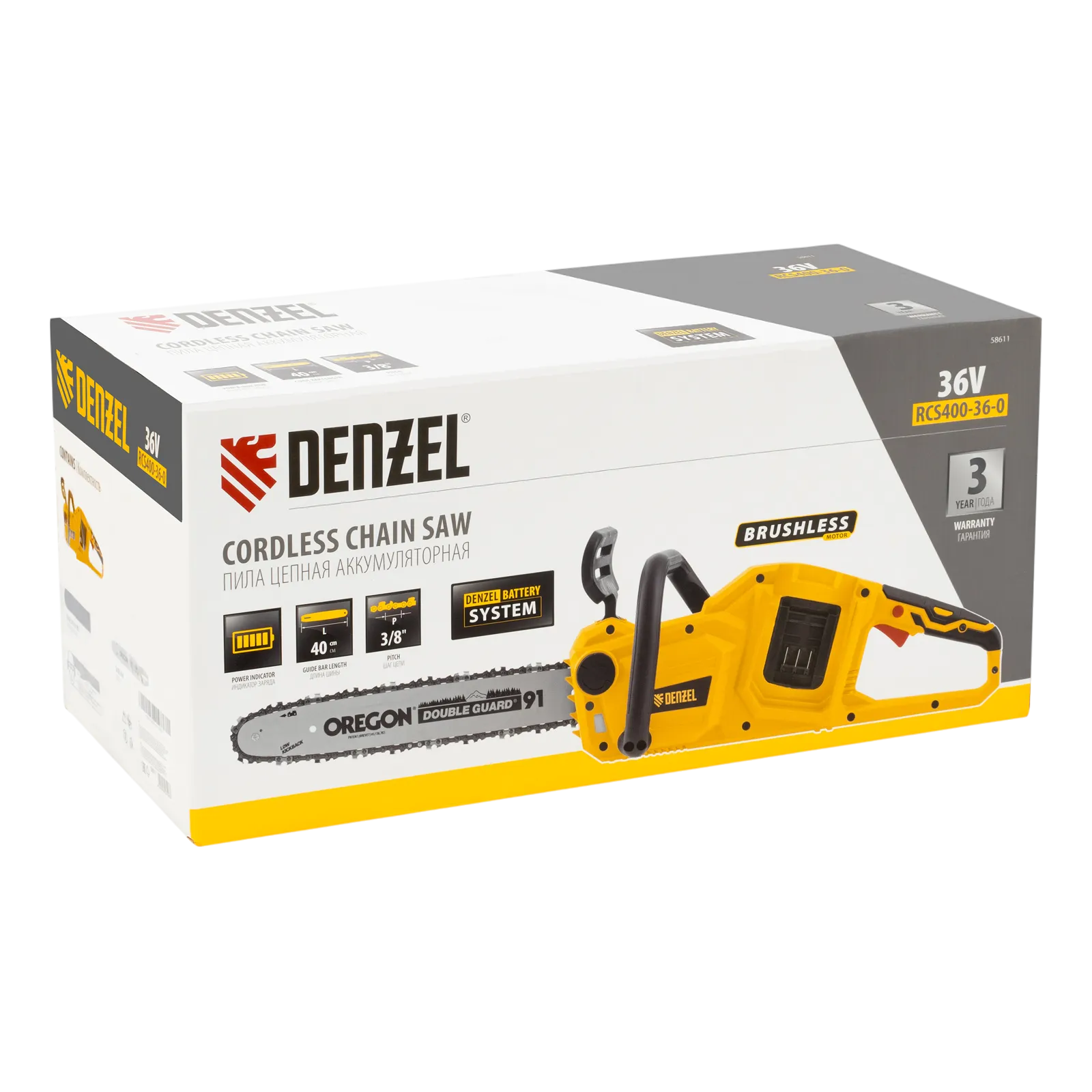 Пила работает на единой платформе Denzel battery system и совместима с аккумуляторами 18 В. Модель поставляется с прочной и легкой шиной OREGON длиной 40 см и цепью с шагом 3/8".