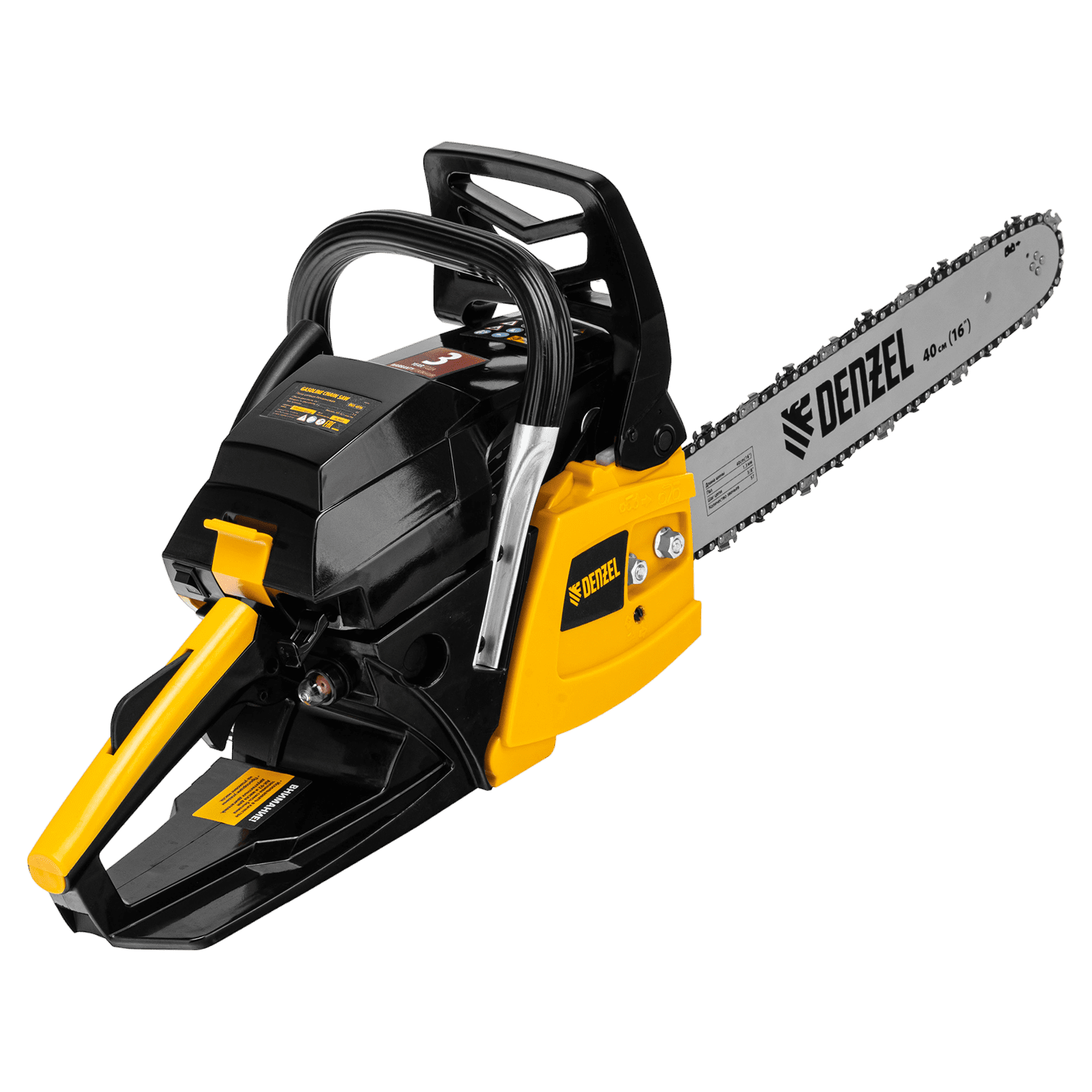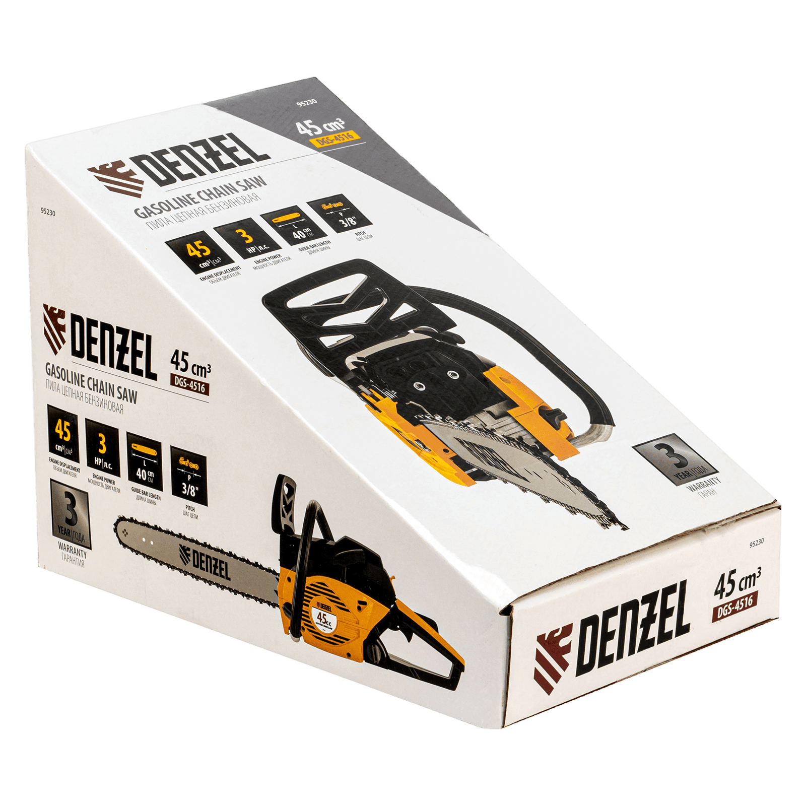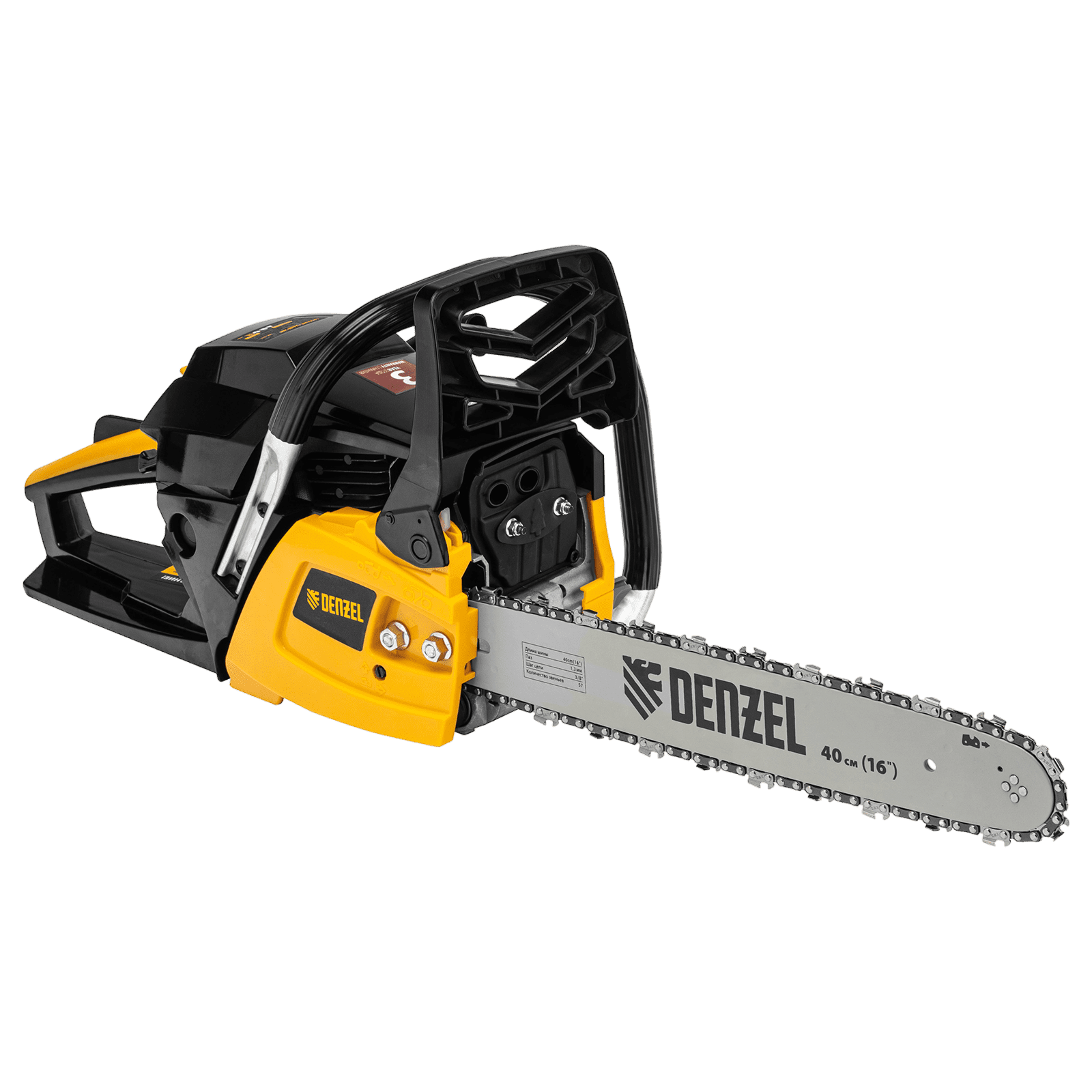 Пила цепная бензиновая Denzel DGS-4516 95230 с двигателем объемом 45 см3 и мощностью 3,0 л.с. поставляется с шиной длиной 40 см и цепью с 57 звеньями (шаг 3/8″, паз 1,3 мм). Это бытовой инструмент для заготовки дров, обрезки ветвей и сучьев в саду, распила древесины твердых и мягких пород. Пила выдерживает интенсивные нагрузки, используется во время строительных и ремонтных работ, будет полезна на дачном участке.