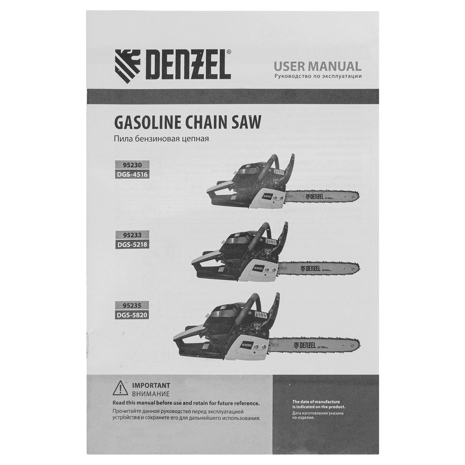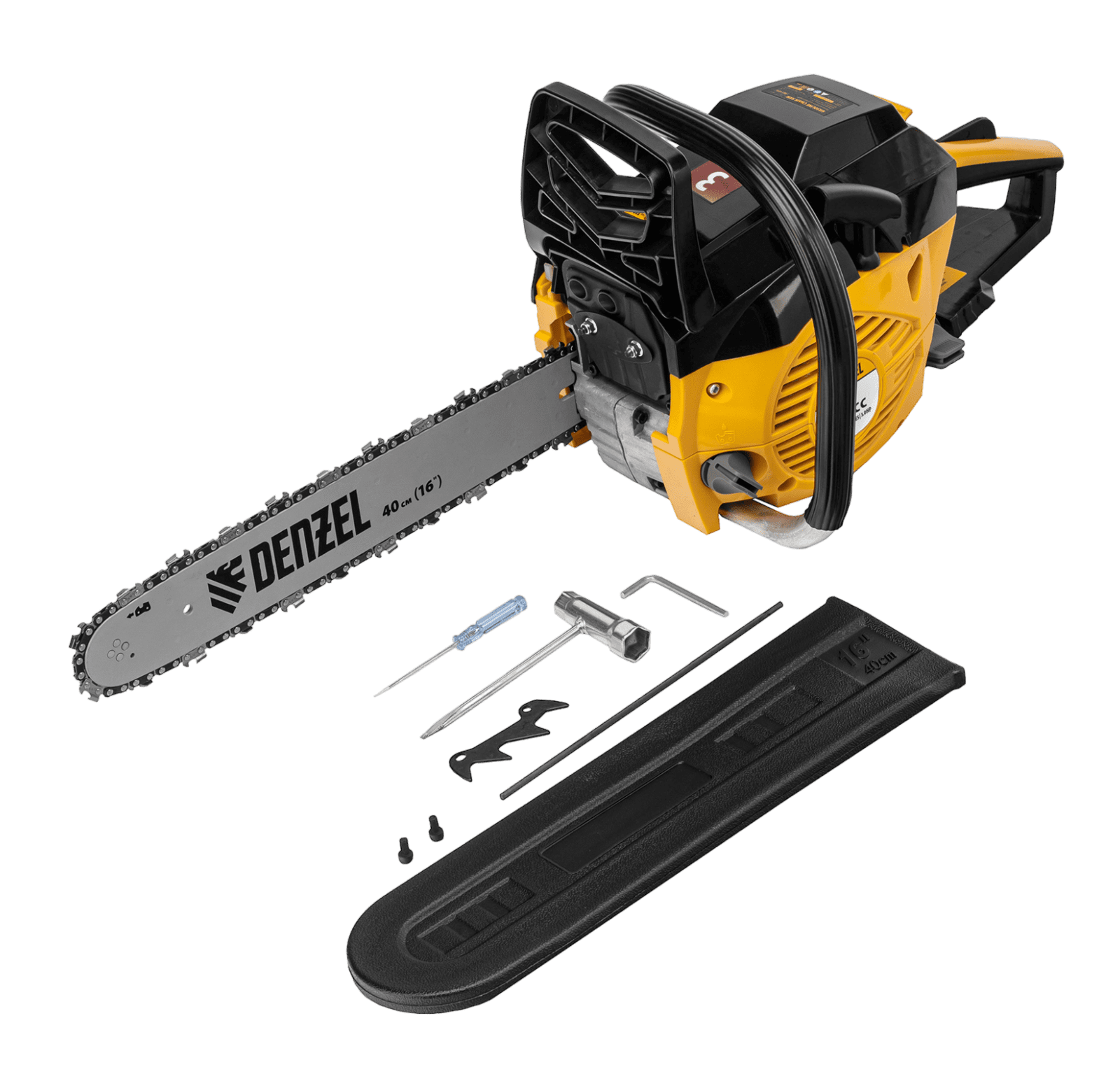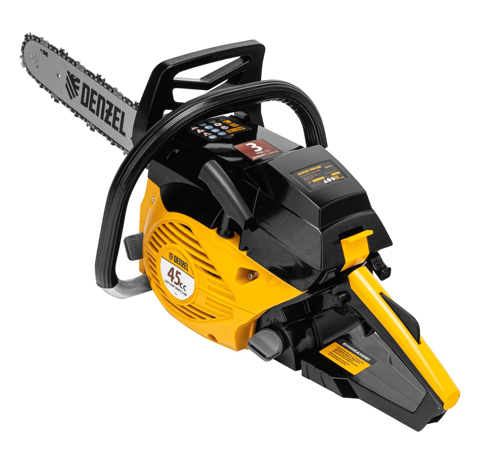 Пила цепная бензиновая Denzel DGS-4516 95230 с двигателем объемом 45 см3 и мощностью 3,0 л.с. поставляется с шиной длиной 40 см и цепью с 57 звеньями (шаг 3/8″, паз 1,3 мм). Это бытовой инструмент для заготовки дров, обрезки ветвей и сучьев в саду, распила древесины твердых и мягких пород. Пила выдерживает интенсивные нагрузки, используется во время строительных и ремонтных работ, будет полезна на дачном участке.