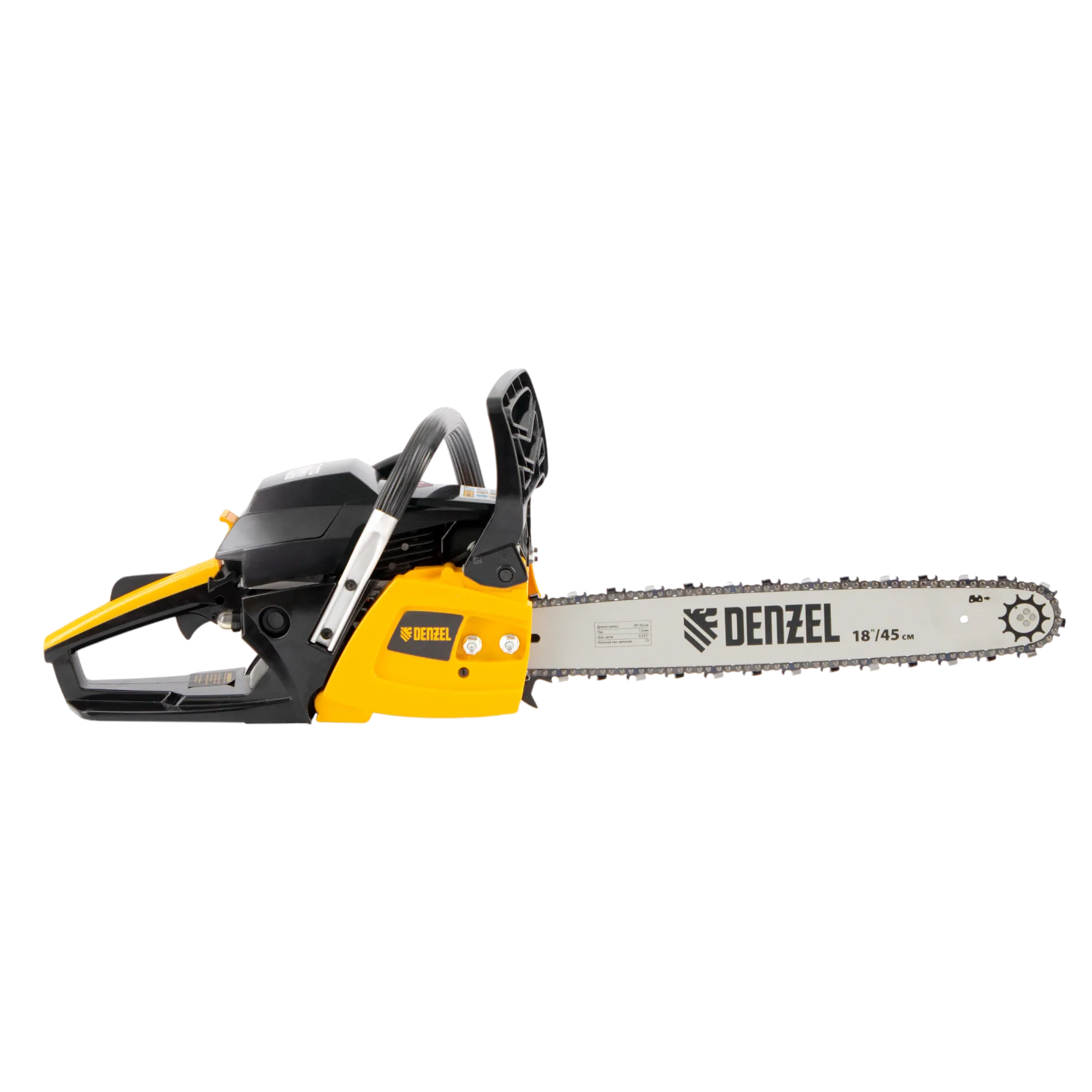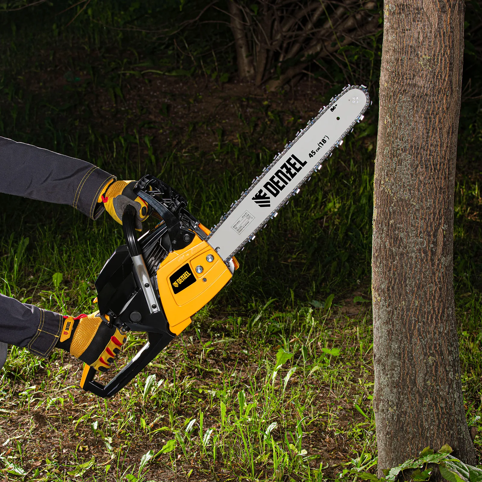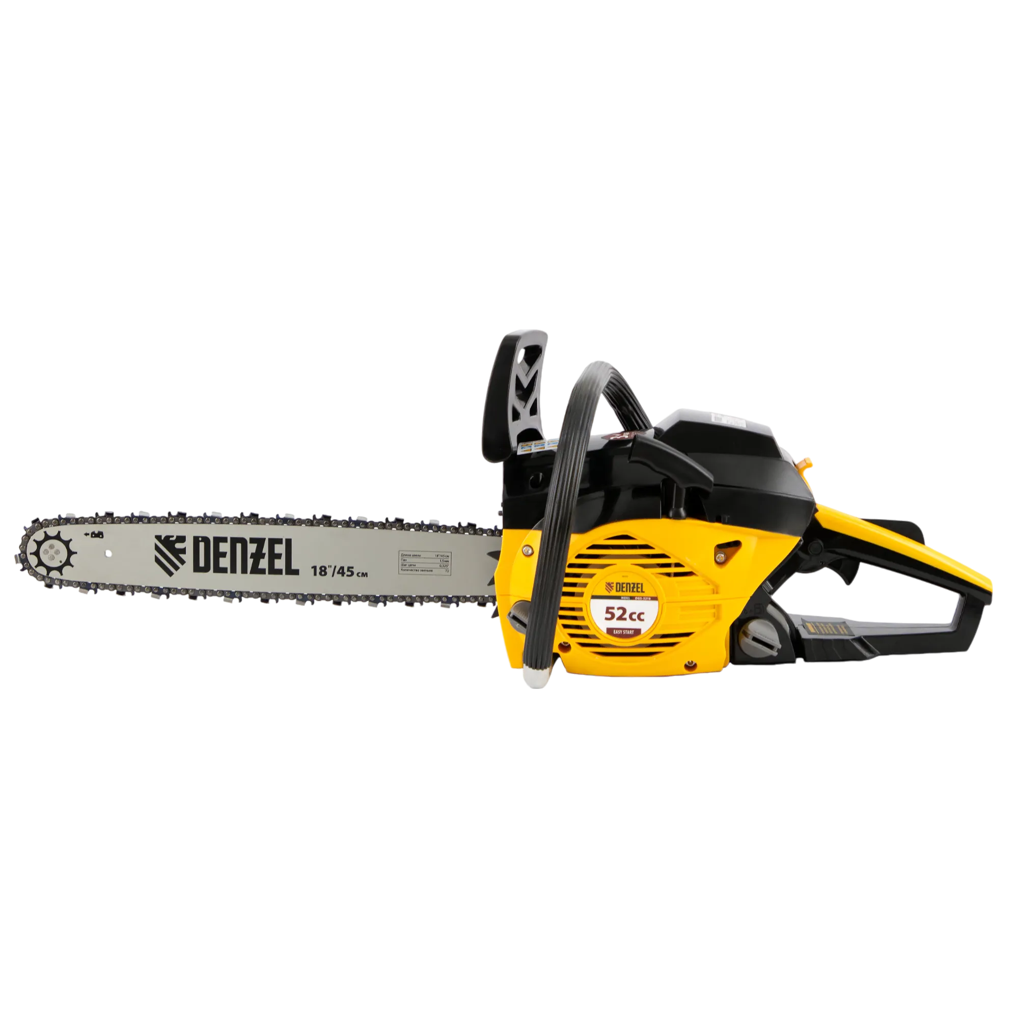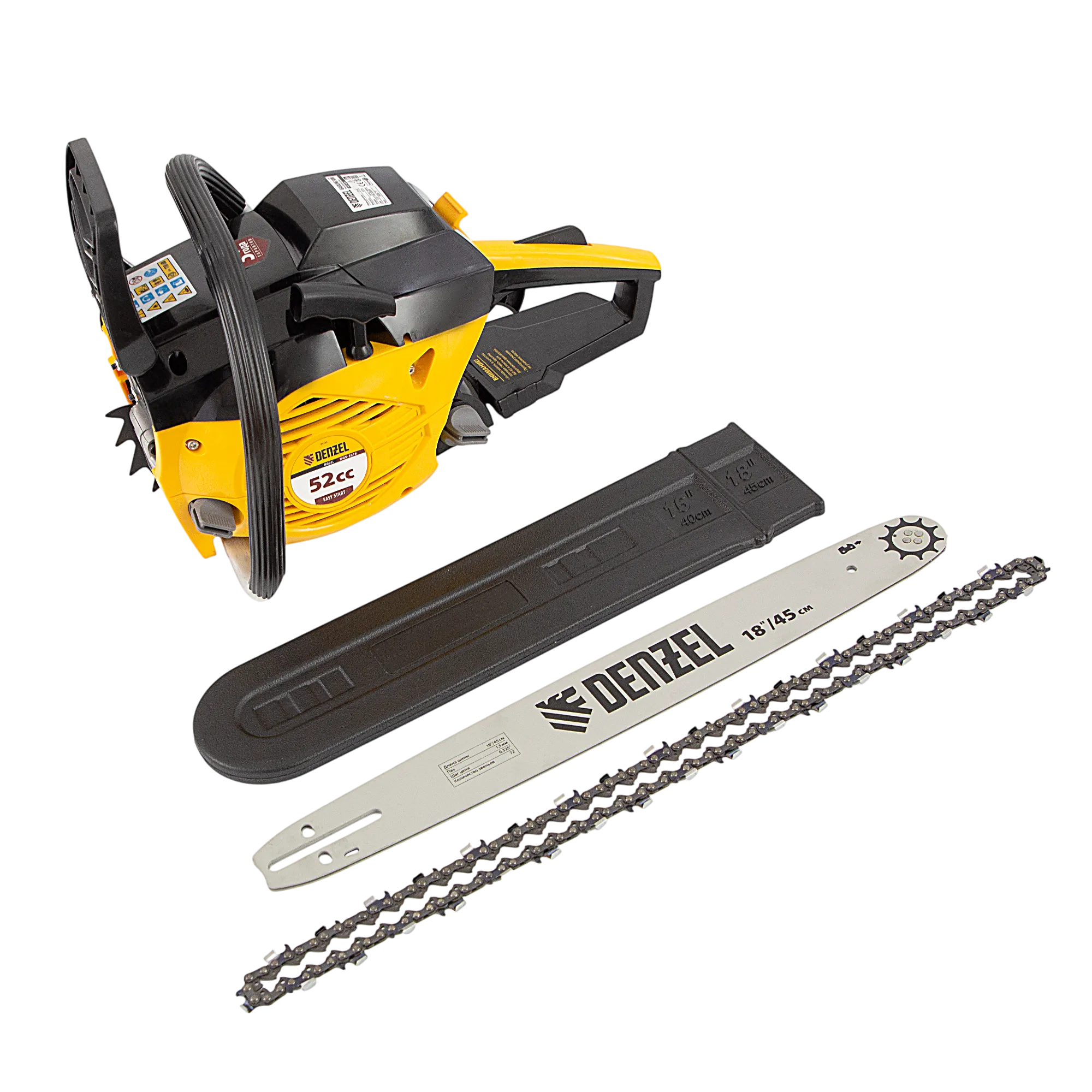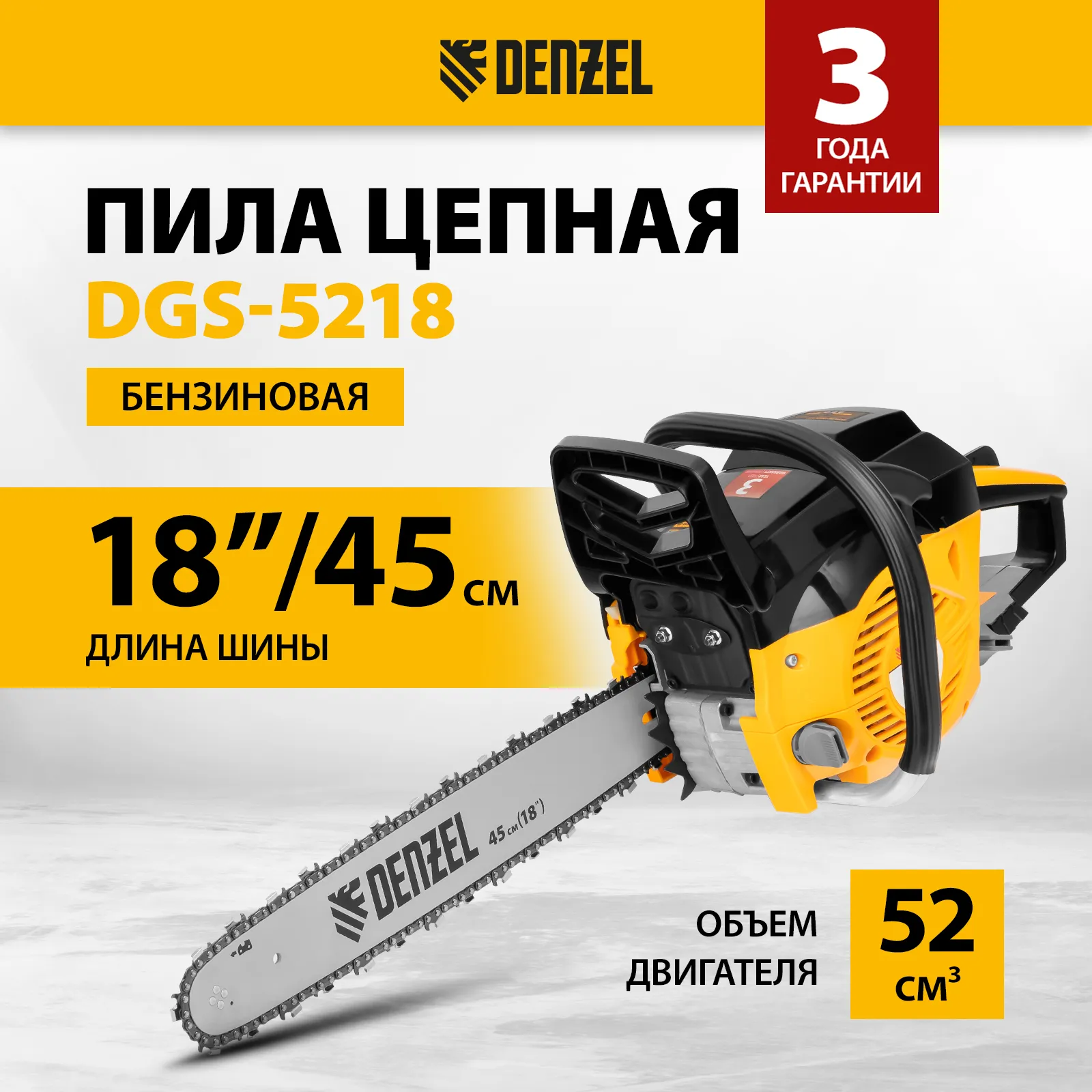 Пила цепная бензиновая Denzel DGS-5218 95233 с двигателем объемом 52 см3 и мощностью 3,5 л.с. поставляется с шиной длиной 45 см и цепью с 72 звеньями (шаг 0,325″, паз 1,5 мм). Инструмент предназначен для заготовки дров, обрезки ветвей и сучьев в саду, распила древесины твердых и мягких пород. Пила выдерживает интенсивные нагрузки, используется во время строительных и ремонтных работ, будет полезна на дачном участке.