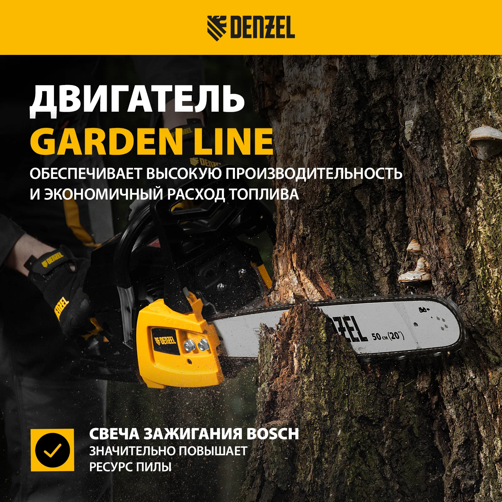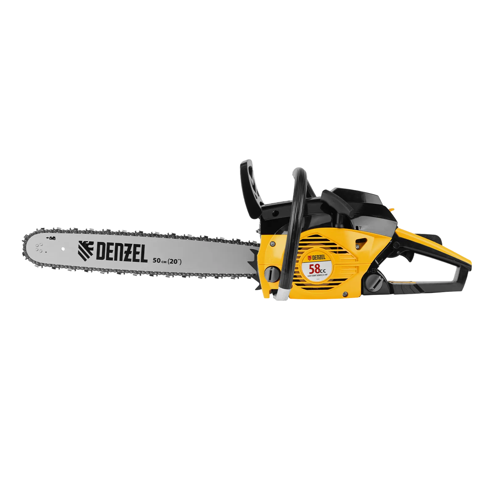 Пила цепная бензиновая Denzel DGS-5820 95235 с двигателем объемом 58 см3 и мощностью 4,1 л.с. поставляется с шиной длиной 50 см и цепью с 76 звеньями (шаг 0,325″, паз 1,5 мм). Это полупрофессиональный инструмент для заготовки дров, обрезки ветвей и сучьев в саду, распила древесины твердых и мягких пород. Пила выдерживает интенсивные нагрузки, используется во время строительных и ремонтных работ, будет полезна на дачном участке.