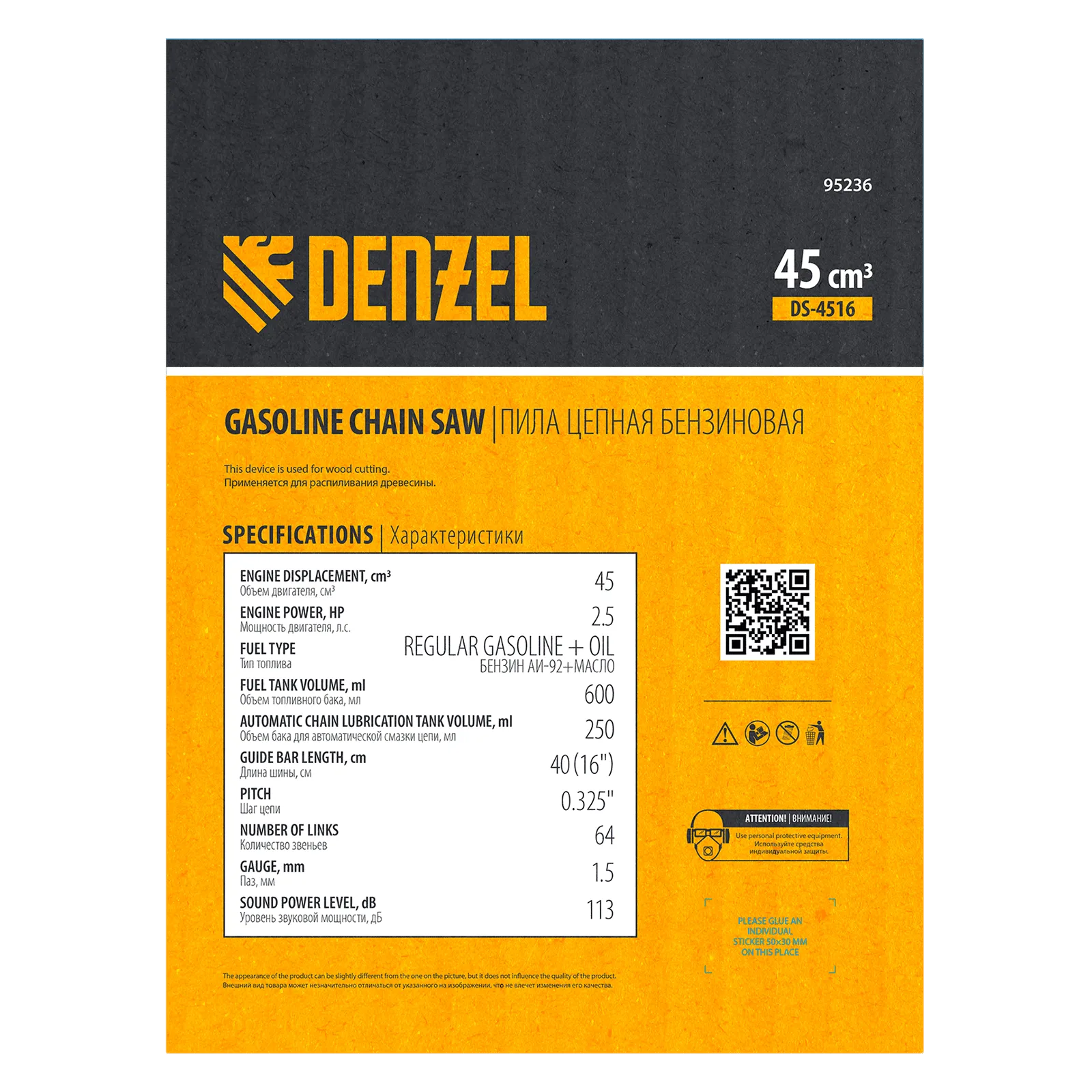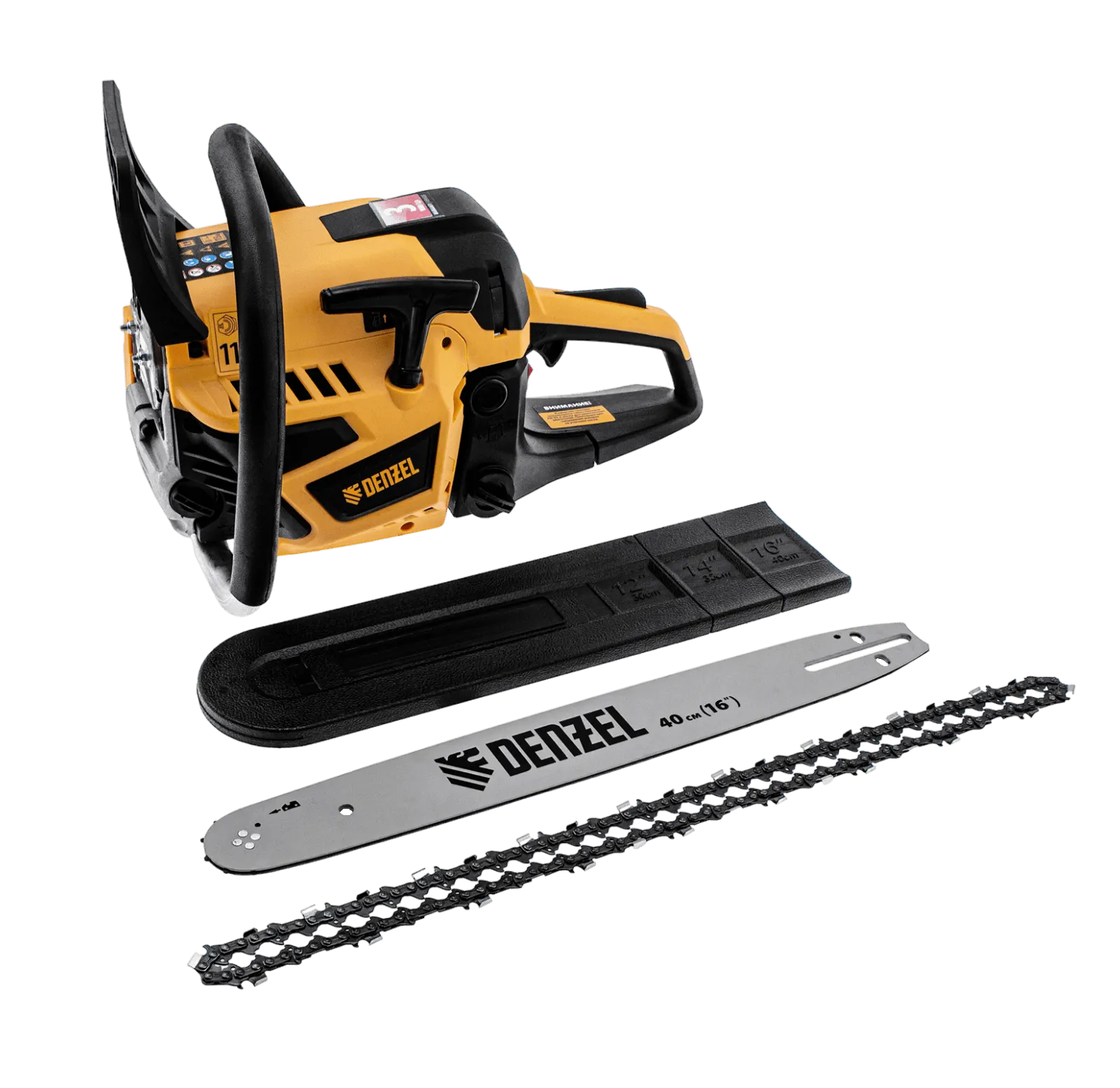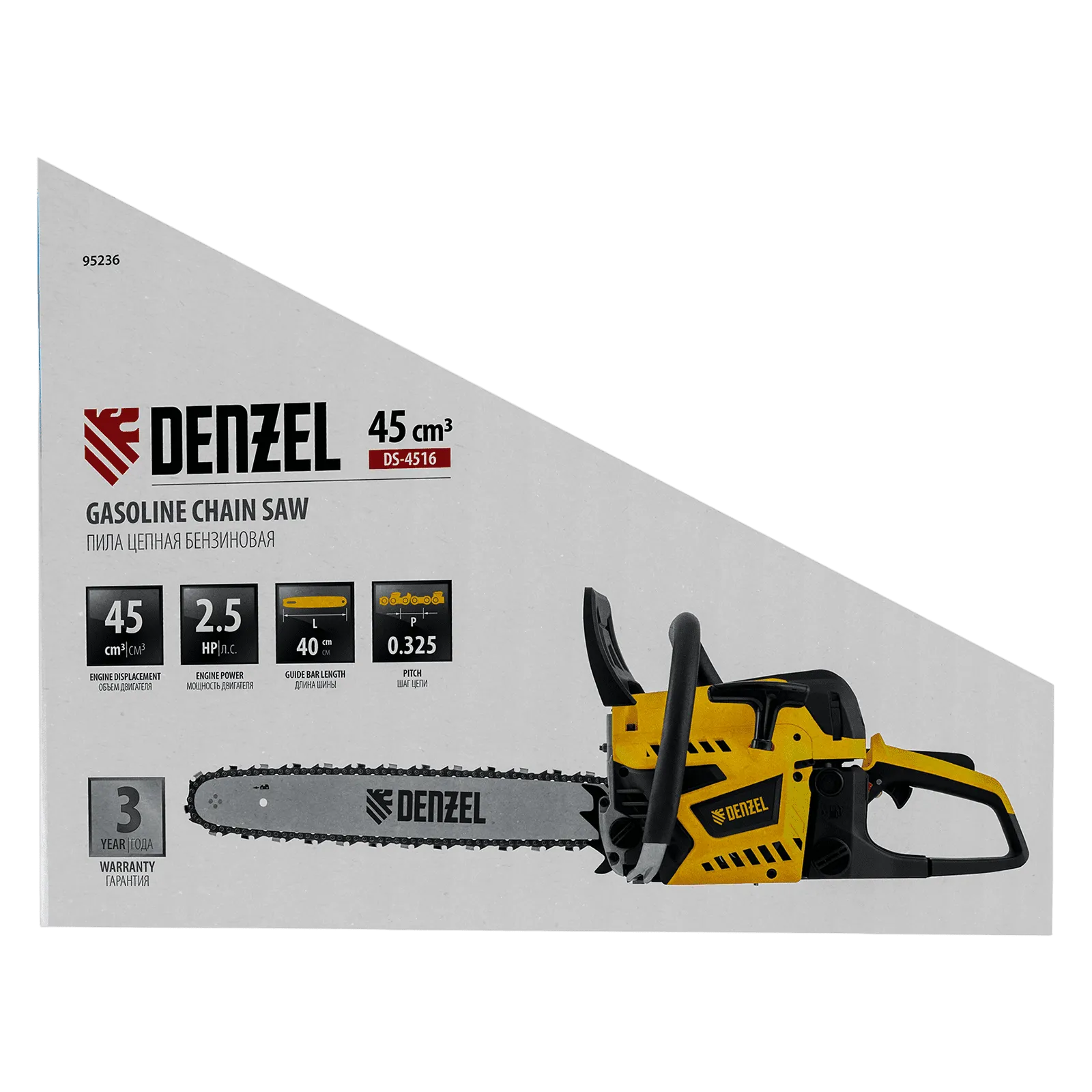 Пила цепная бензиновая Denzel DS-4516 95236 мощностью 2,5 л.с. оснащена двигателем объемом 45 см3 и поставляется с высокопроизводительной пильной гарнитурой: шиной длиной 40 см, цепью с 64 звеньями шагом 0,325" и пазом 1,5 мм. Используется для заготовки дров, распиловки древесины, при проведении ремонтных, строительных и садовых работ. Мощный и экономичный двухтактный двигатель позволяет эффективно и быстро решать поставленные задачи.