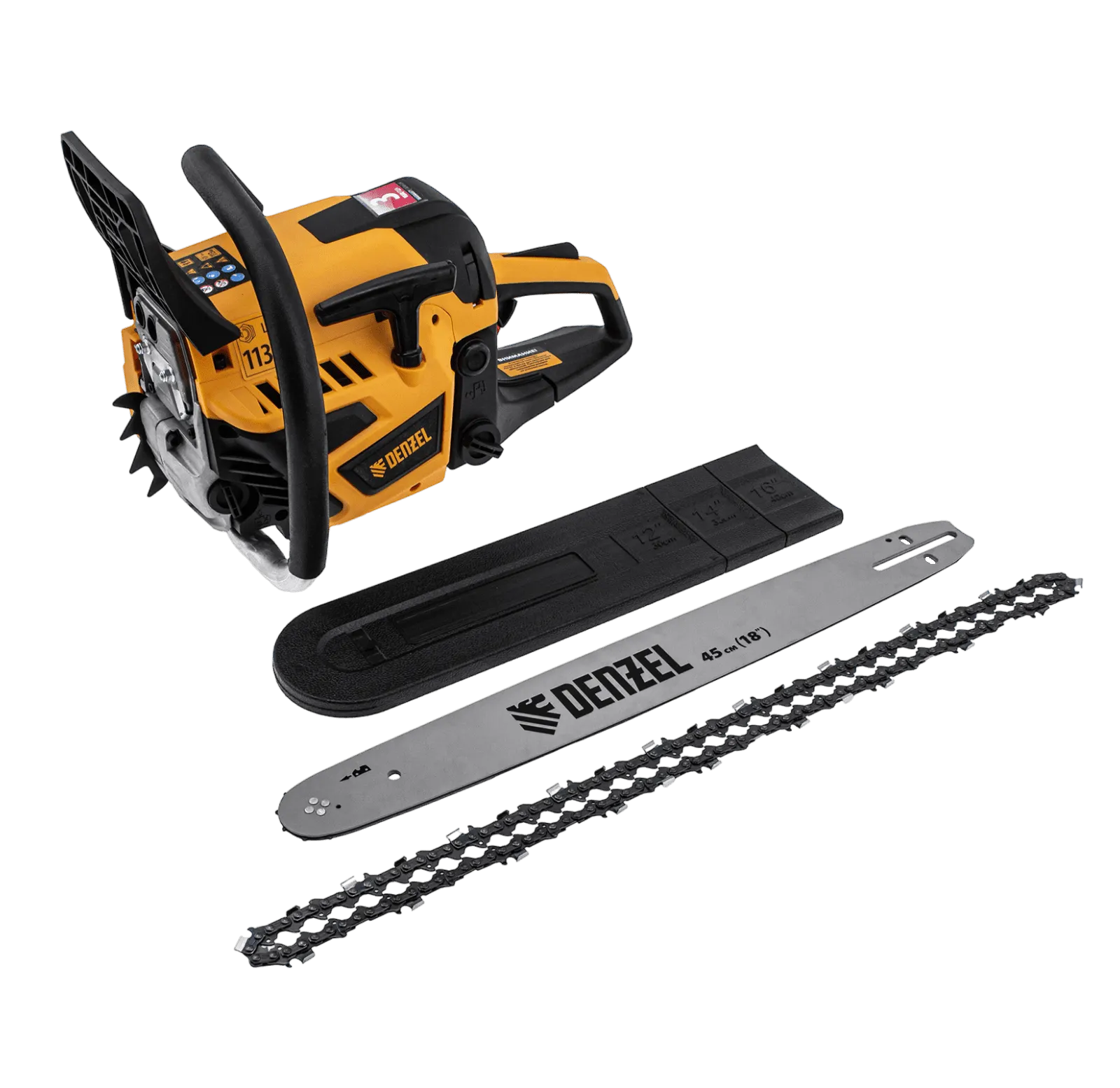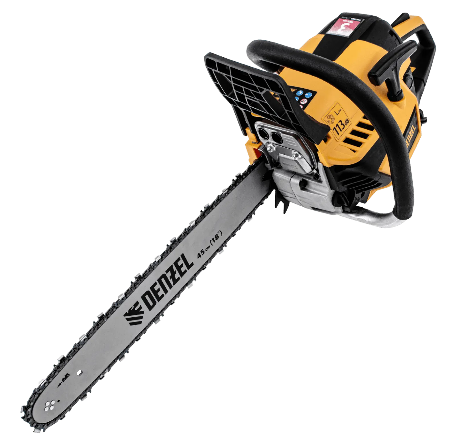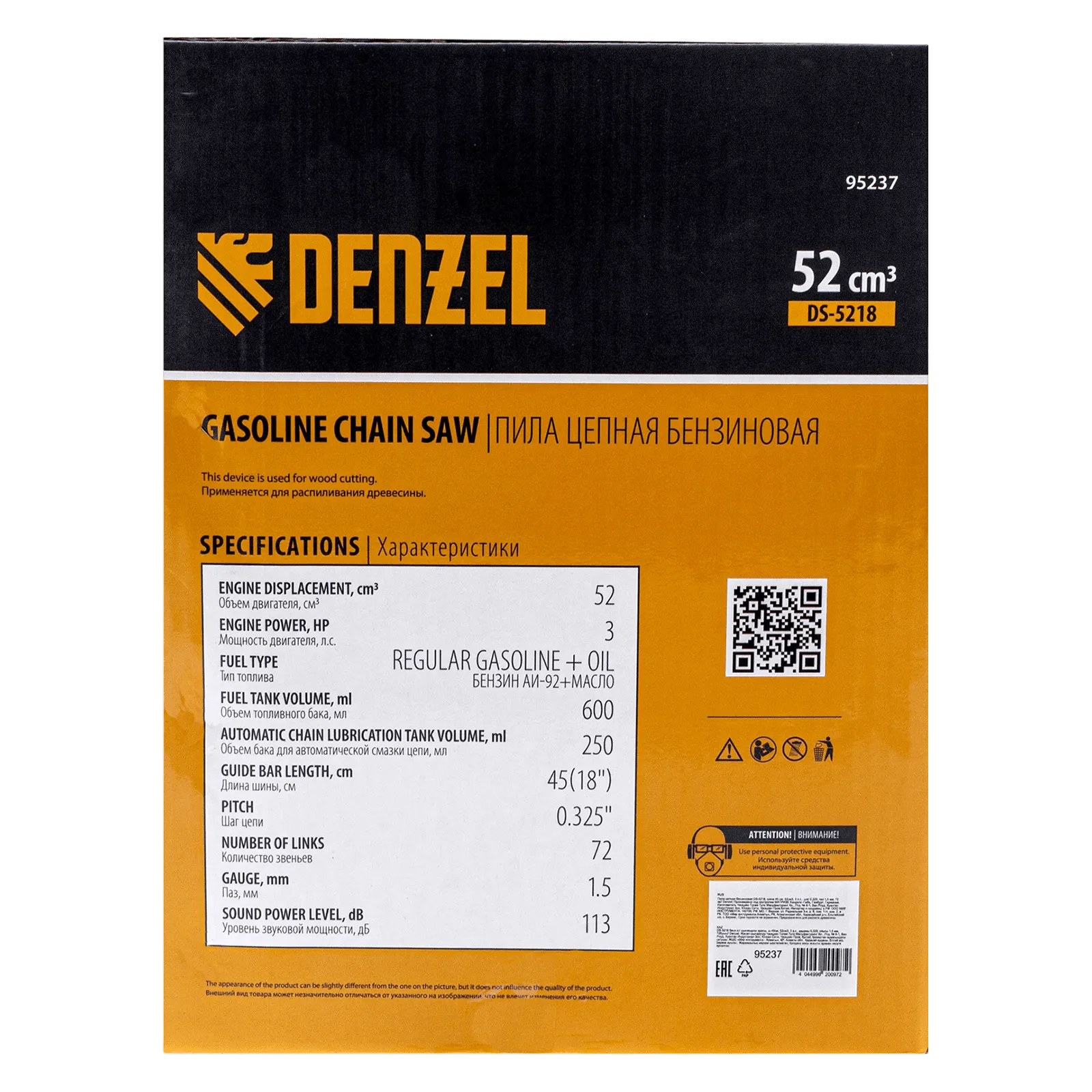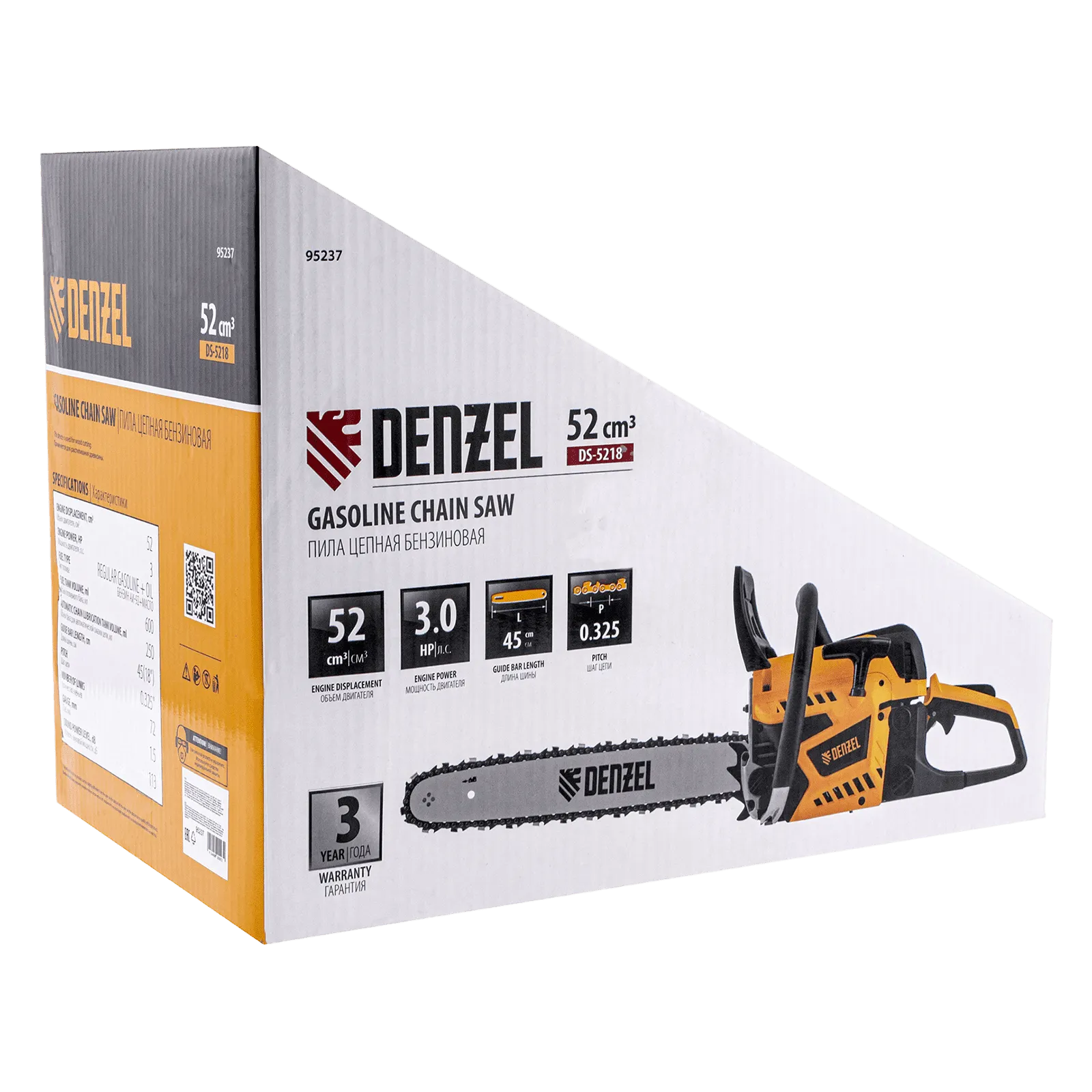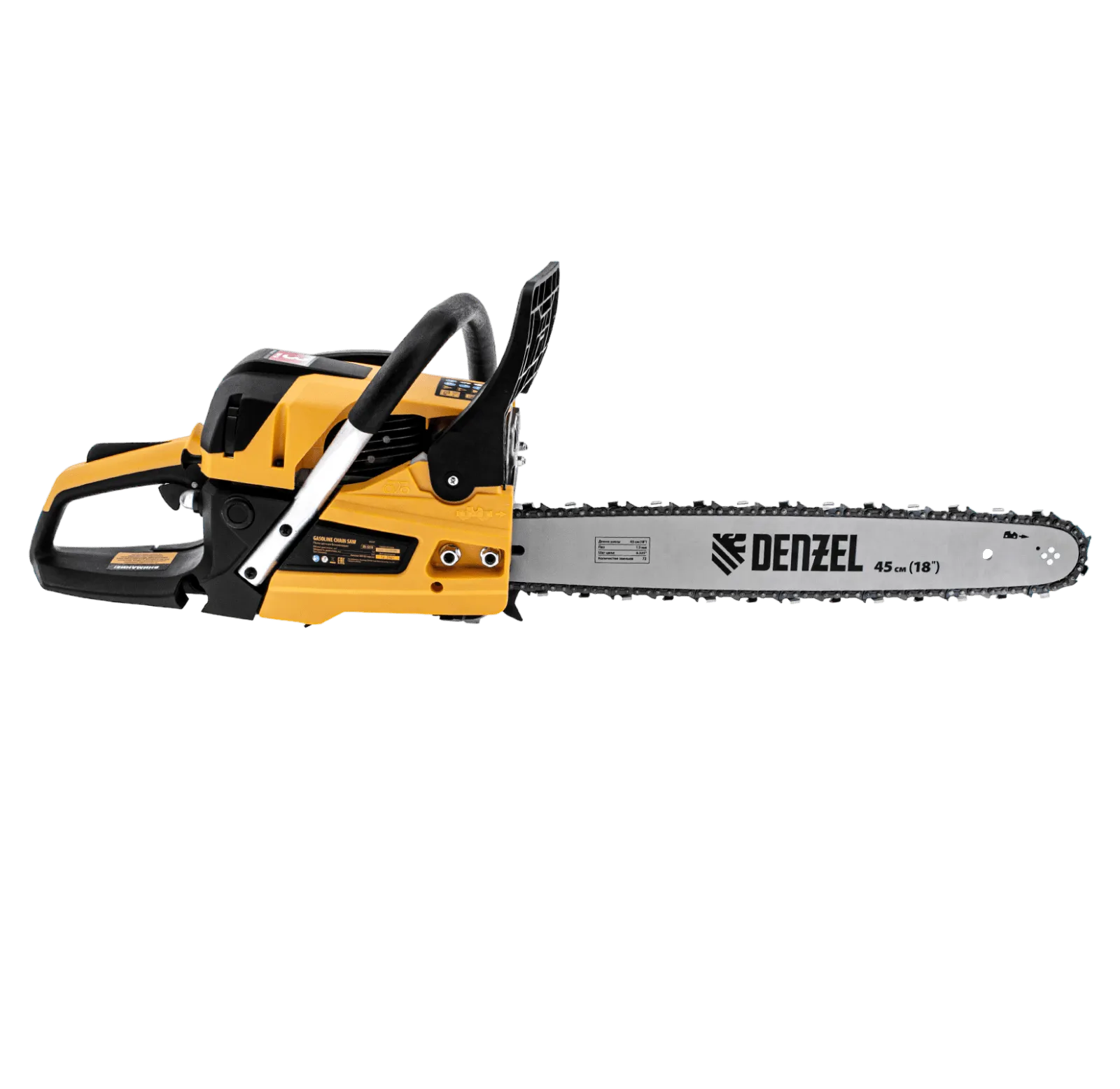 Пила цепная бензиновая Denzel DS-5218 95237 мощностью 3 л.с. оснащена двигателем объемом 52 см3 и поставляется с высокопроизводительной пильной гарнитурой: шиной длиной 45 см, цепью с 72 звеньями шагом 0,325" и пазом 1,5 мм. Используется для заготовки дров, распиловки древесины, при проведении ремонтных, строительных и садовых работ. Мощный и экономичный двухтактный двигатель позволяет эффективно и быстро решать поставленные задачи.