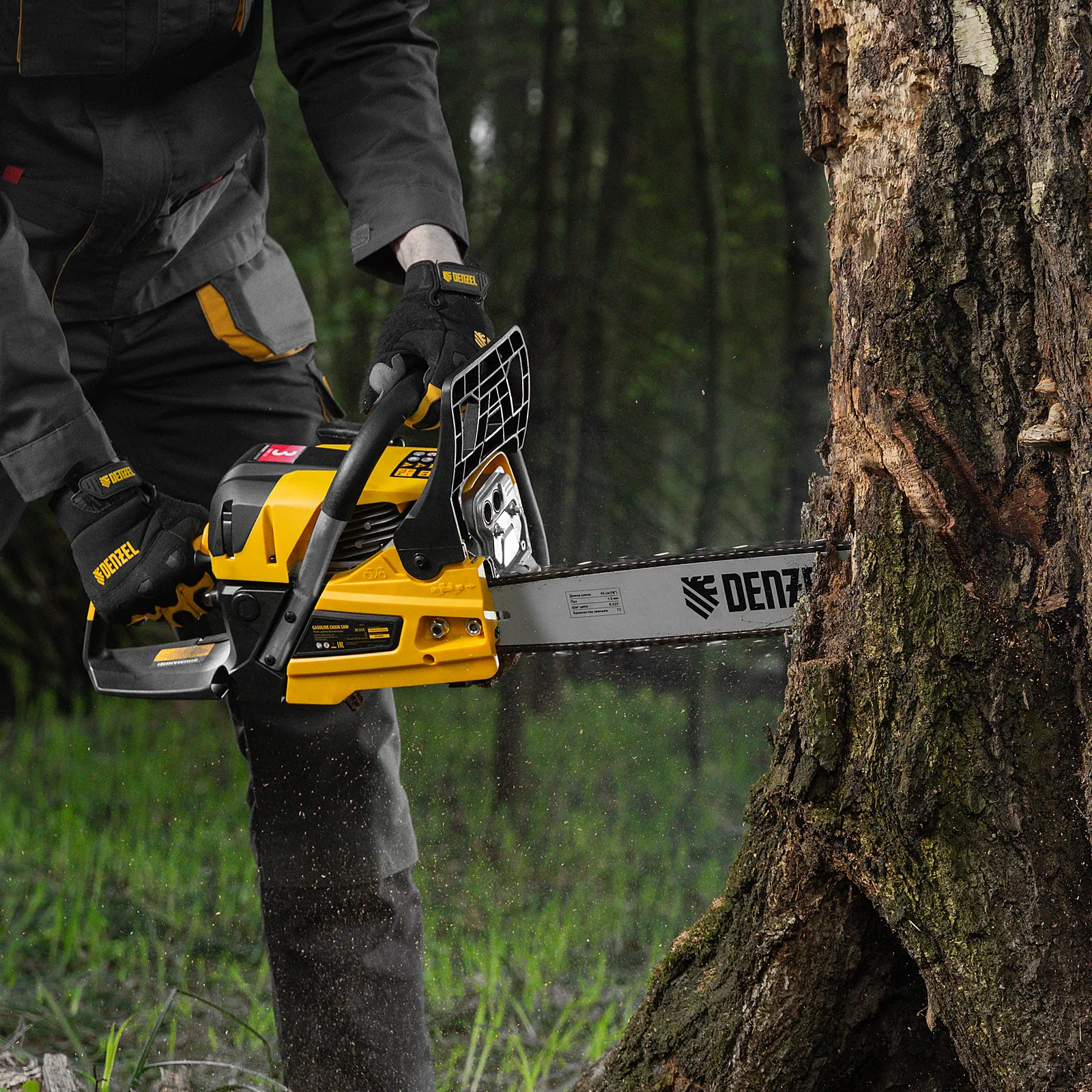 - Безопасная работа — блокировка от случайного запуска и моментальное срабатывание тормоза цепи при отскоке пилы снижают вероятность получения травм.