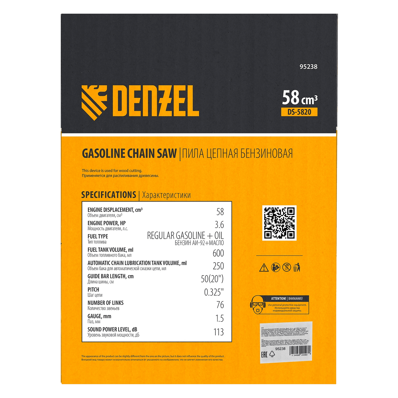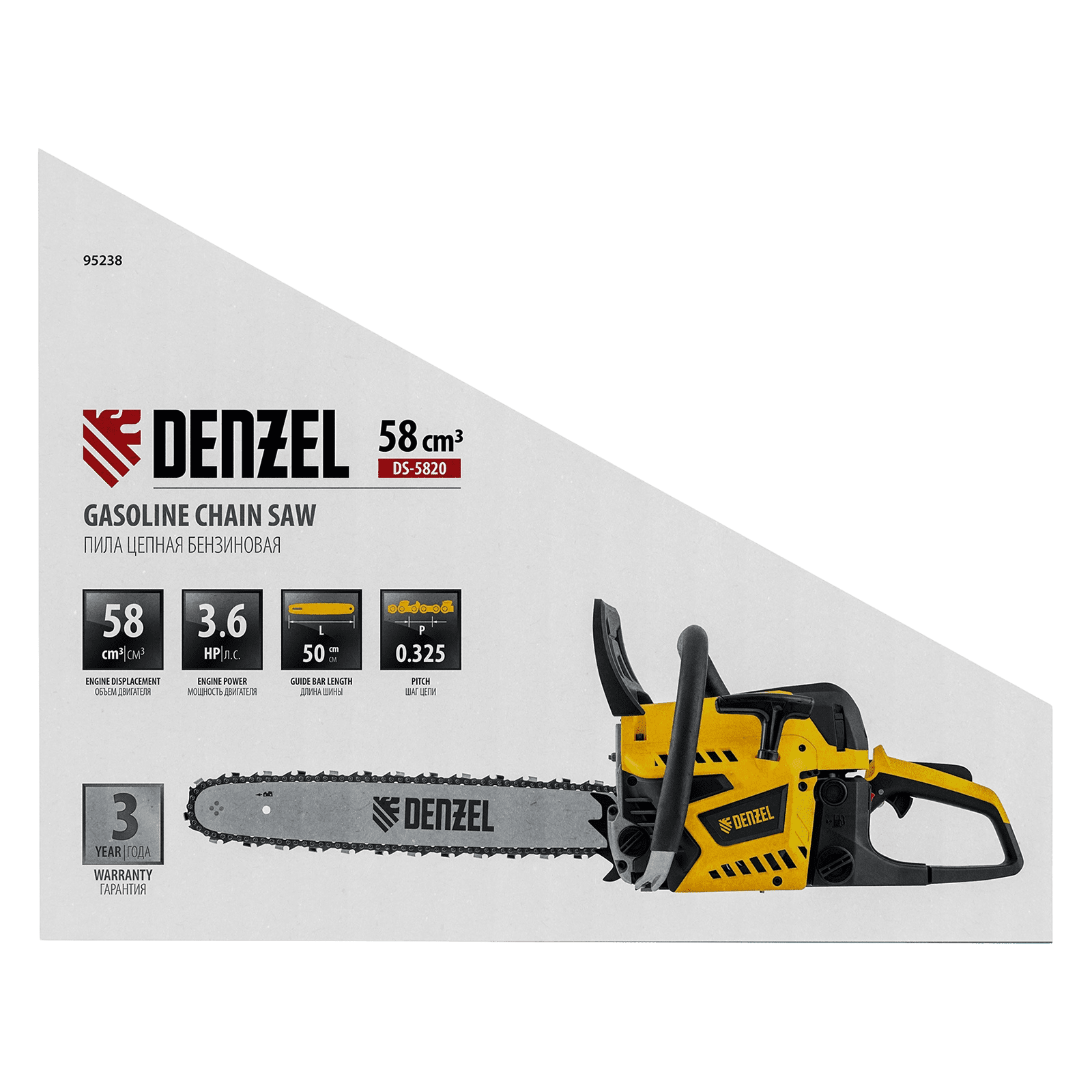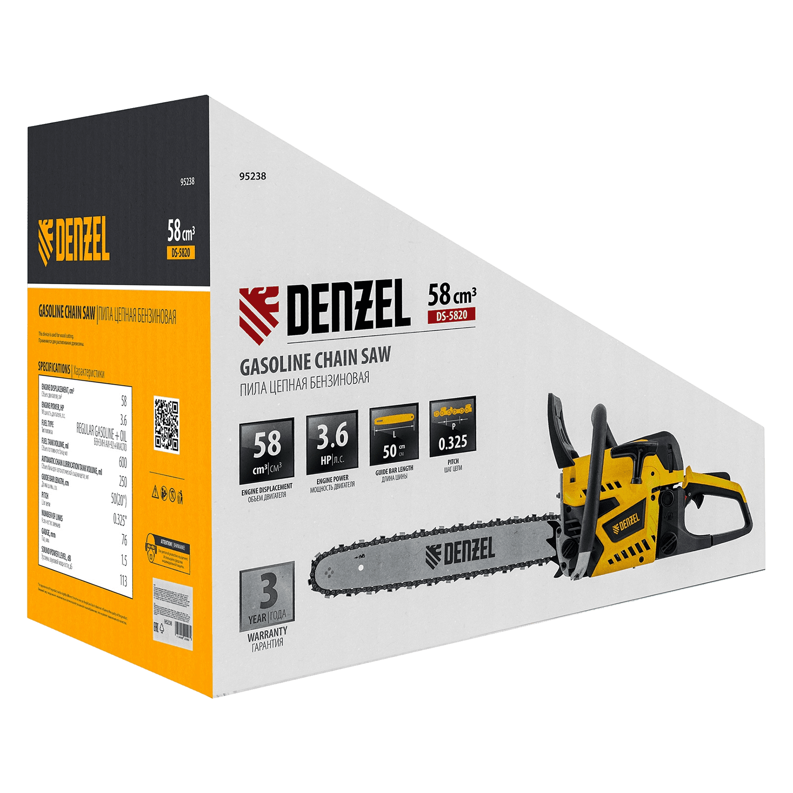 Пила цепная бензиновая Denzel DS-5820 95238 мощностью 3,6 л.с. оснащена двигателем объемом 58 см3 и поставляется с высокопроизводительной пильной гарнитурой: шиной длиной 50 см, цепью с 76 звеньями шагом 0,325" и пазом 1,5 мм. Используется для заготовки дров, распиловки древесины, при проведении ремонтных, строительных и садовых работ. Мощный и экономичный двухтактный двигатель позволяет эффективно и быстро решать поставленные задачи.