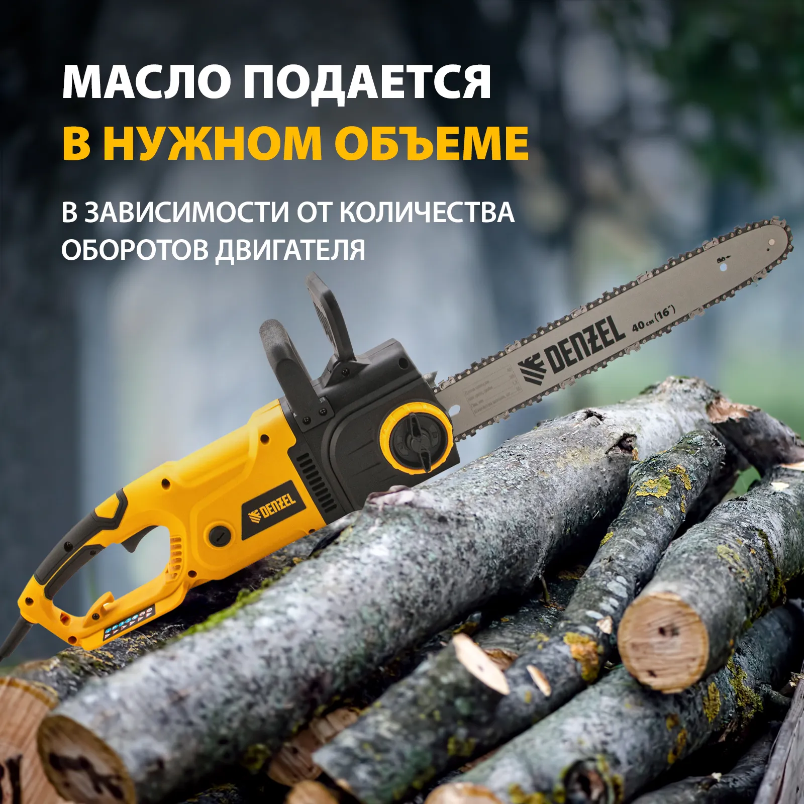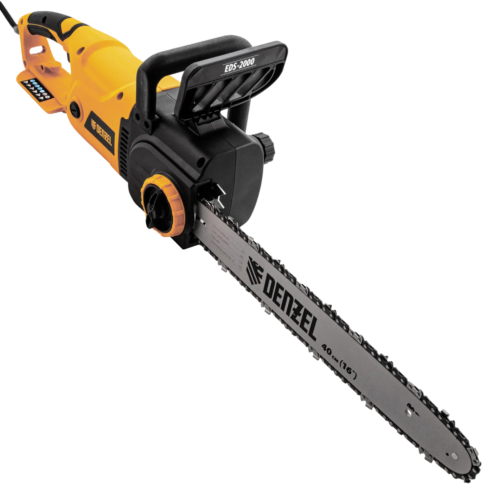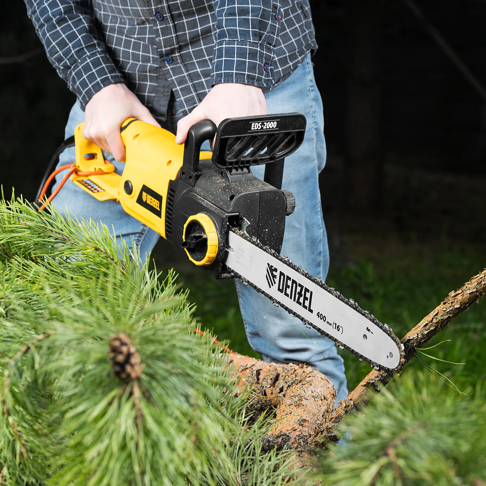 Электрическая цепная пила Denzel EDS-2000 95618 оснащена двигателем мощностью 2 кВт, поставляется вместе с шиной длиной 40 см (шаг 3/8", паз 1,3 мм, 56 звеньев). Инструмент обеспечивает выполнение таких задач, как ремонт, строительство, заготовка дров, облагораживание придомовой территории, работа в небольшой мастерской.