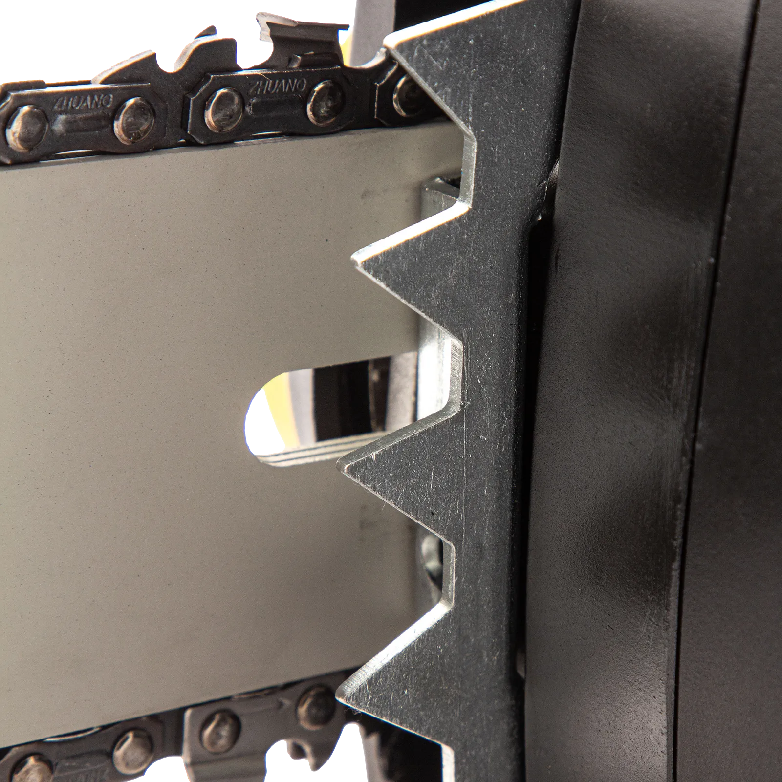- Стальной зубчатый упор — электропила устойчиво фиксируется для распила бревен или деревьев, а мастер не устает и с легкостью может добиться аккуратной линии среза.