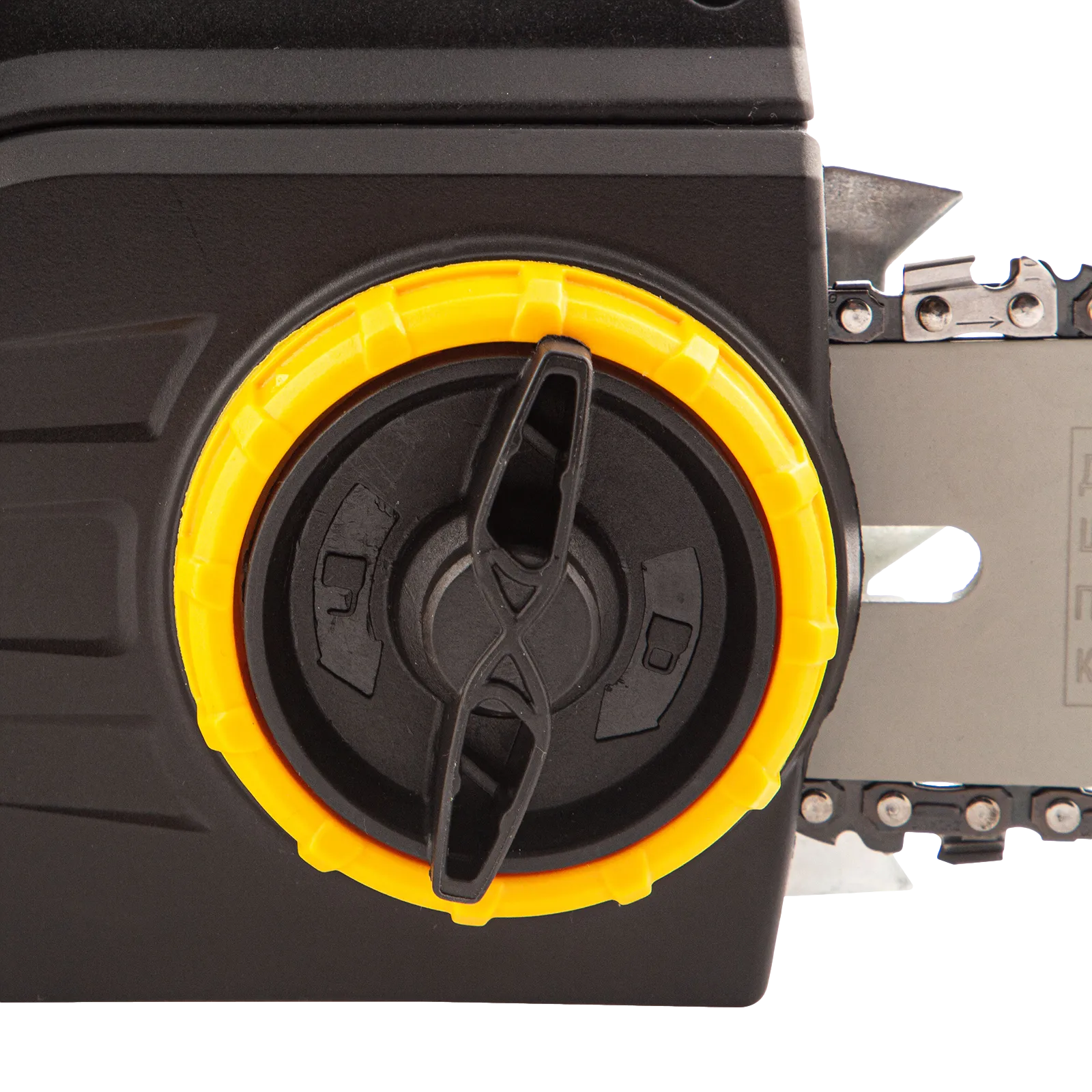 - Блокиратор пуска — дети или посторонние лица не смогут случайно включить пилу, нажав на основной выключатель (запуск возможен только при одновременном удержании выключателя и кнопки блокировки).