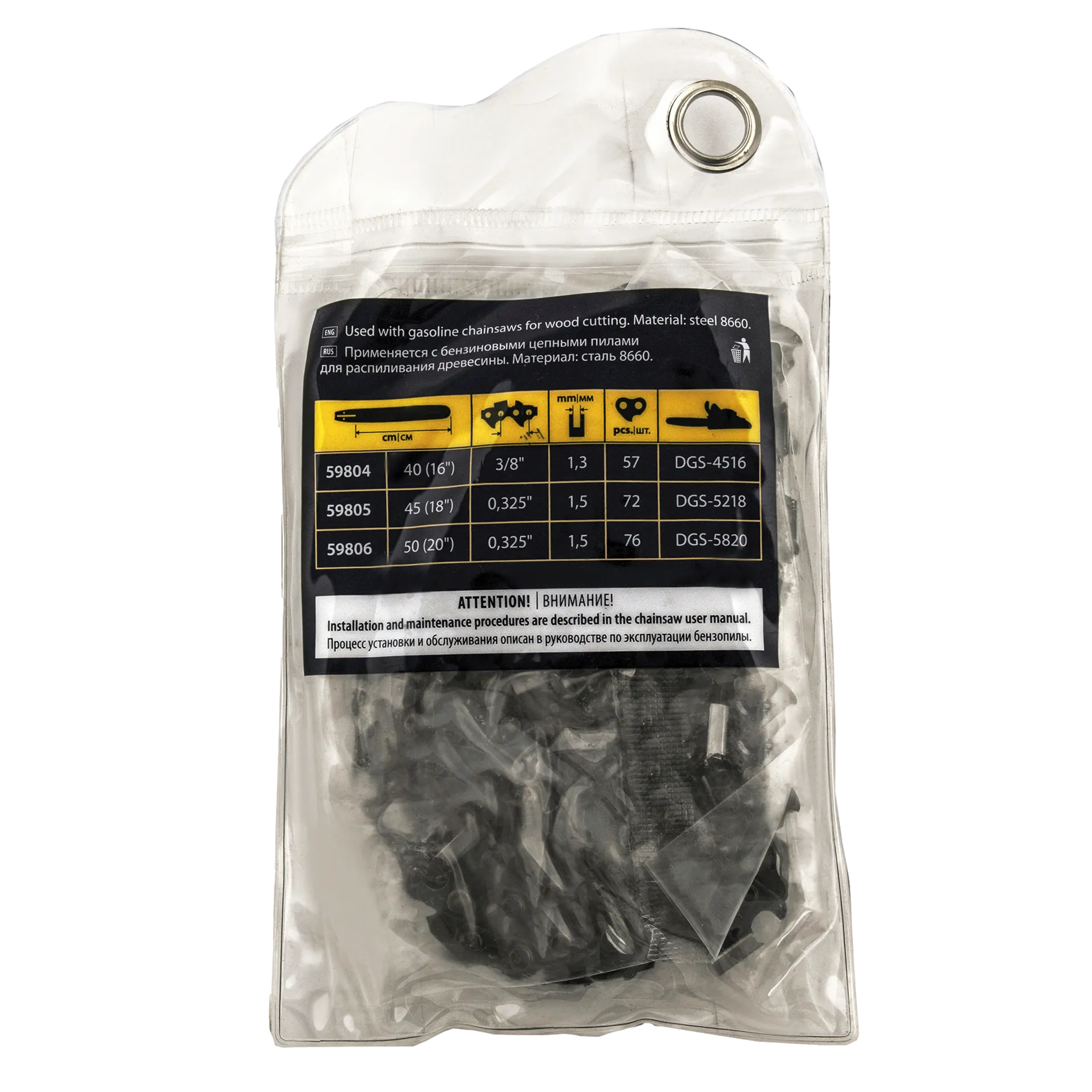 - Безопасное хранение и транспортировка — защитная упаковка предотвращает контакт с острыми звеньями.