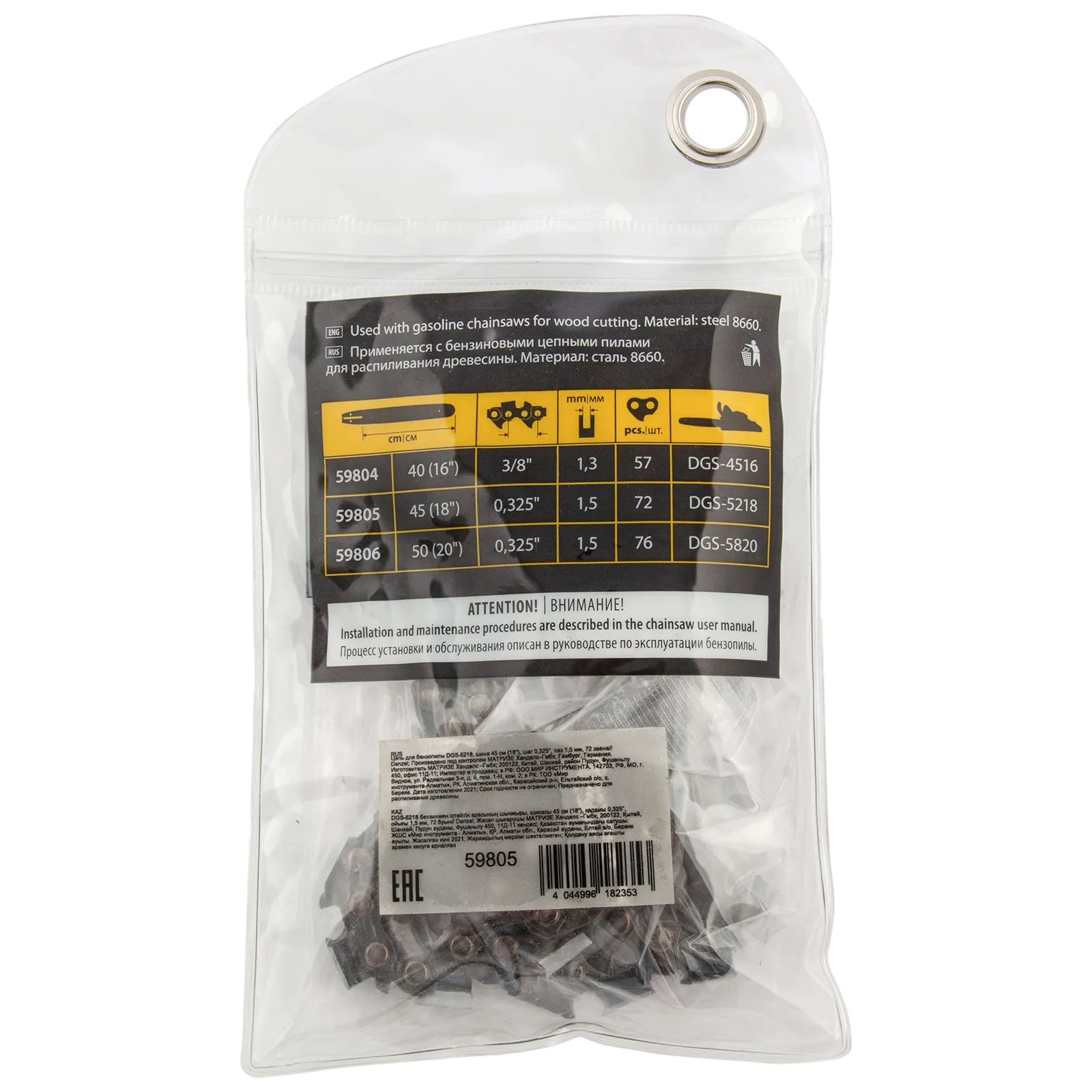 - Безопасное хранение и транспортировка — защитная упаковка предотвращает контакт с острыми звеньями.