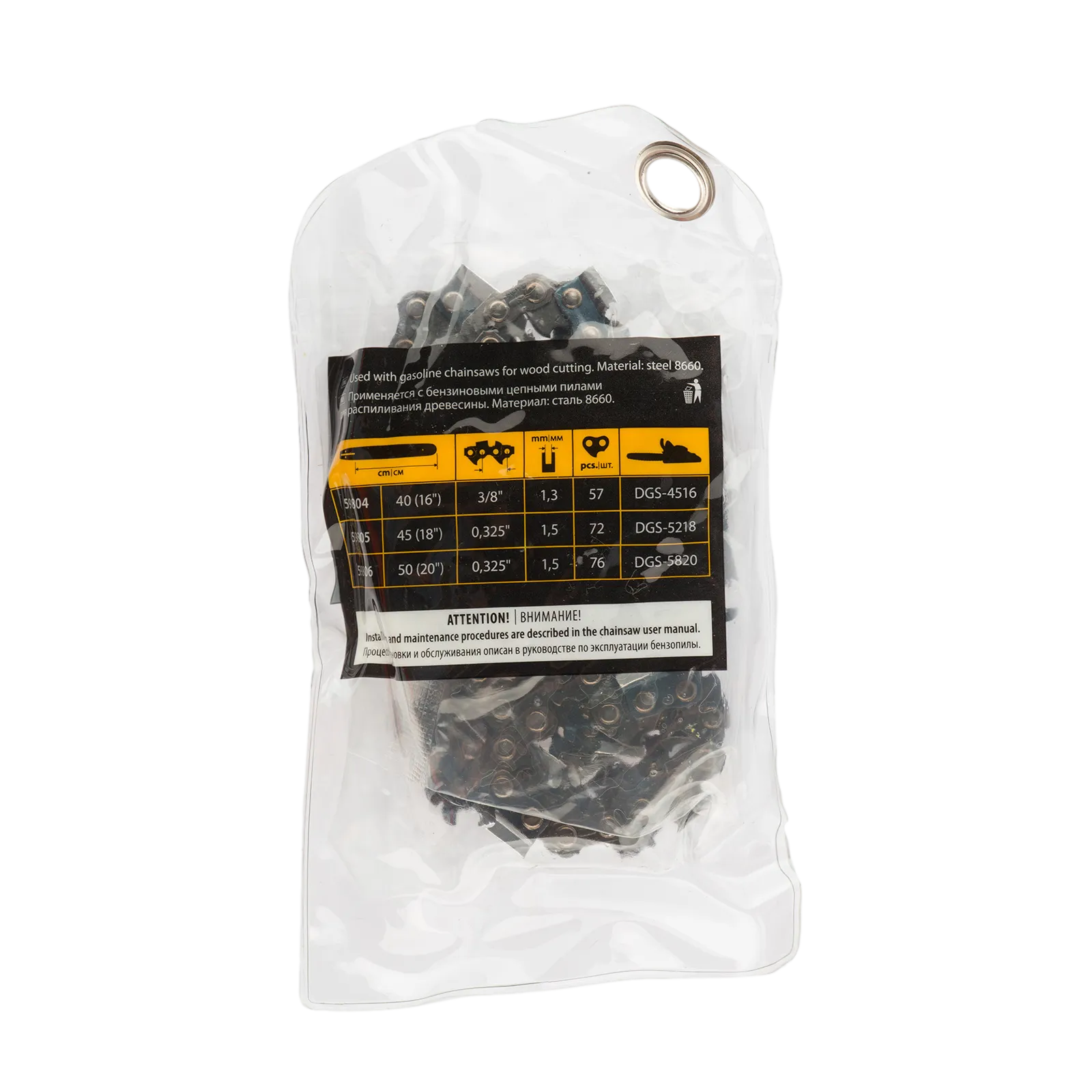 - Безопасное хранение и транспортировка — защитная упаковка предотвращает контакт с острыми звеньями.