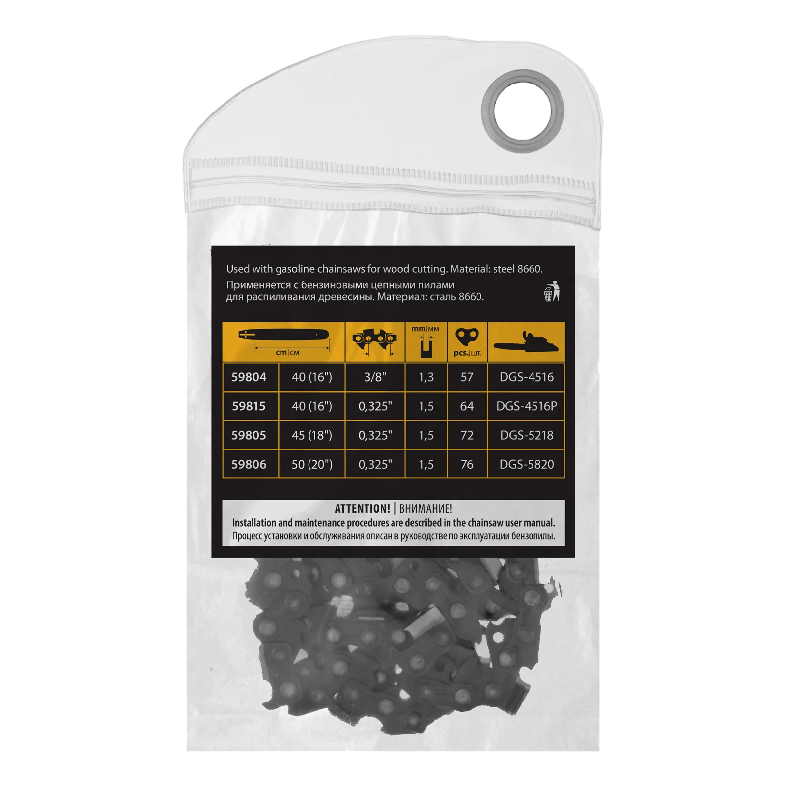 Цепь Denzel 59815 DGS-4516P состоит из 64 звеньев с шагом 0,325", надевается на пильную шину длиной 40 см (16") с шириной паза 1,5 мм. Оптимальна для обработки деревянных заготовок в частной мастерской, распиловки бревен, срезания сучьев и веток в саду, пригодится также на охоте и рыбалке.
