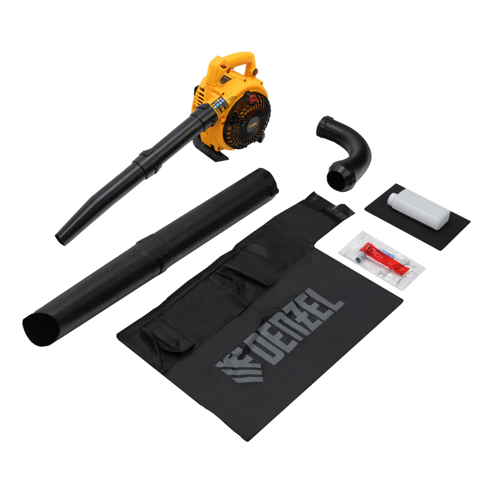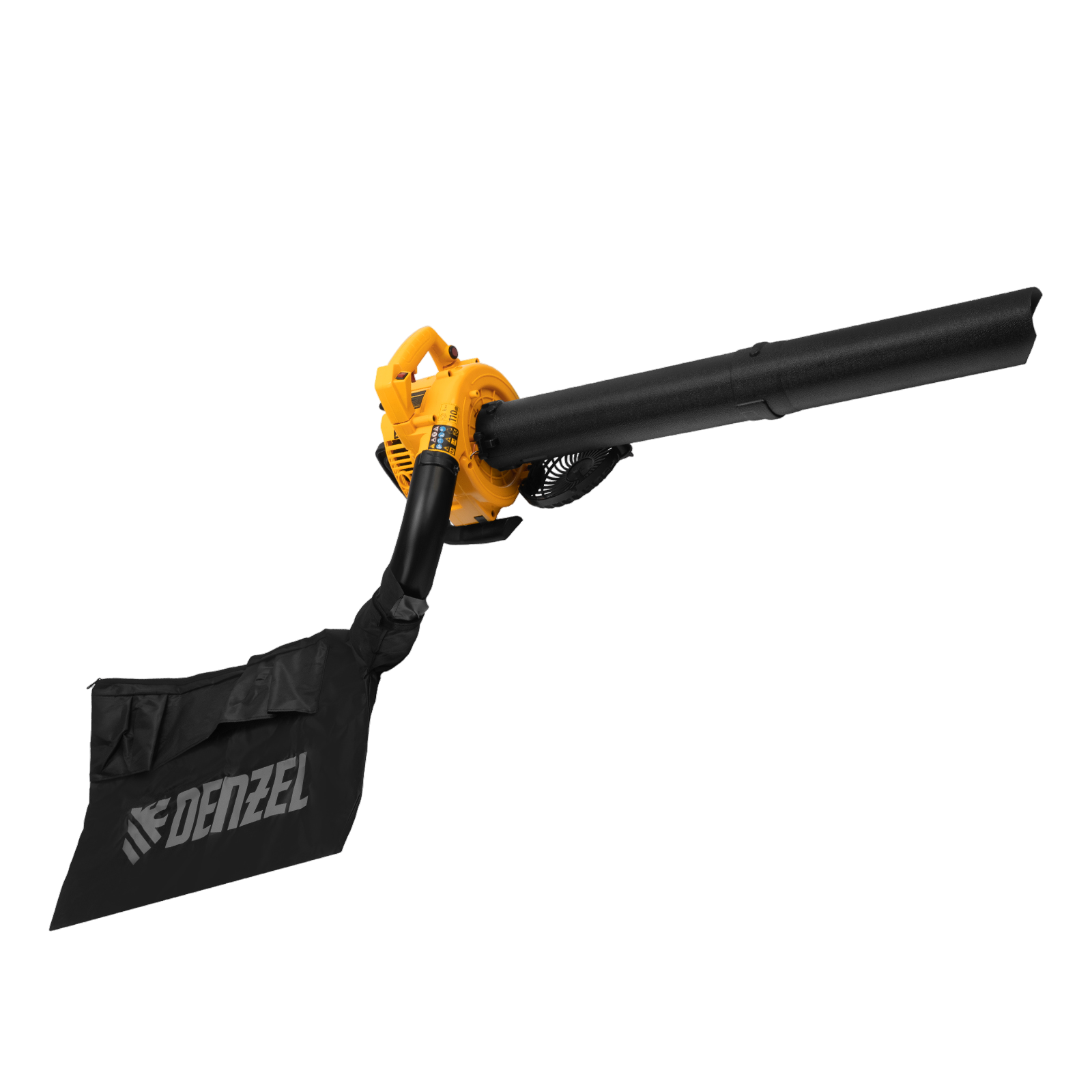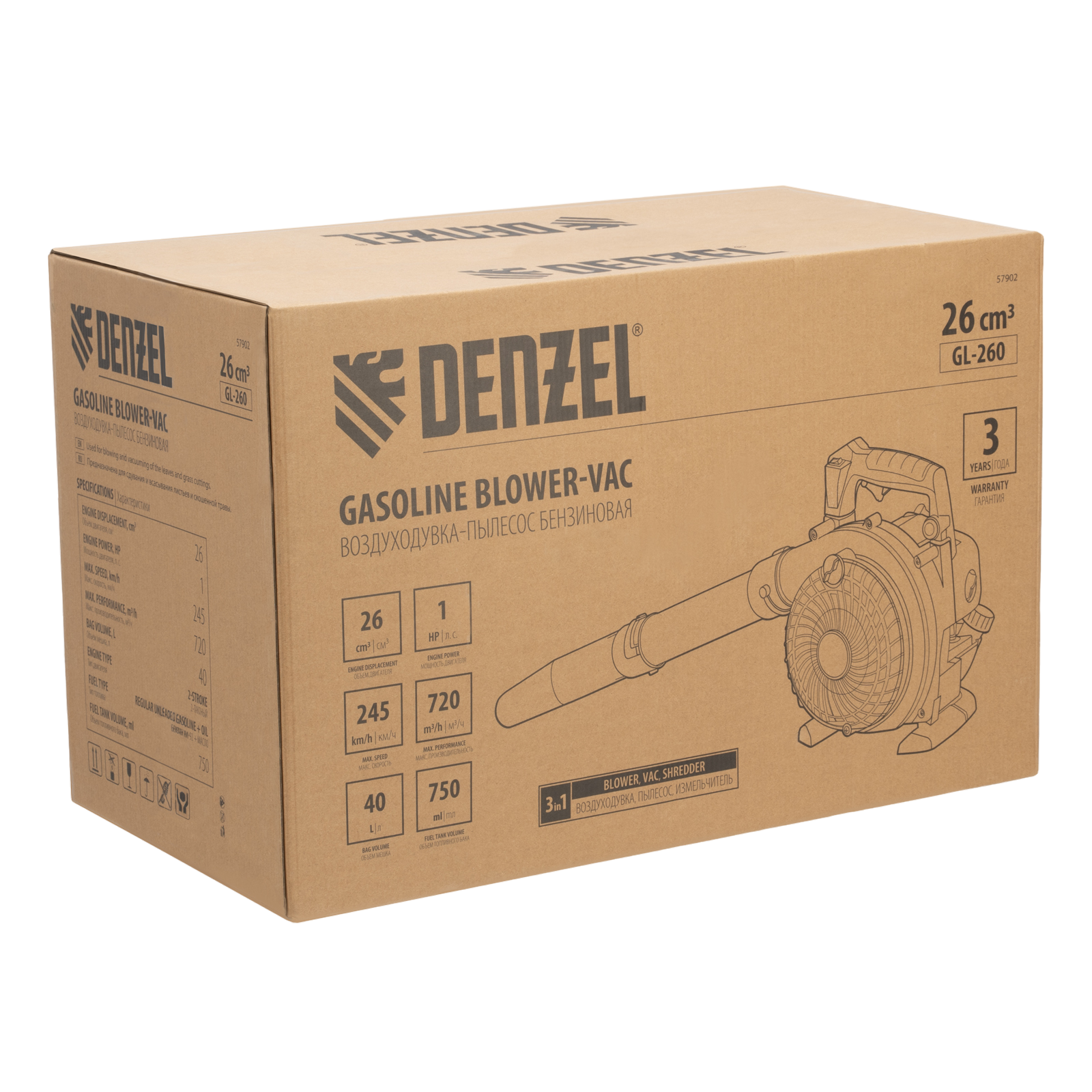 Бензиновая воздуходувка-пылесос Denzel GL-260 57902 с двухтактным двигателем объемом 26 см3 и мощностью 1 л.с. предназначена для очищения территории от листьев и скошенной травы. Скорость потока воздуха составляет 245 км/ч, что обеспечивает высокую эффективность работы.;Инструмент работает как в режиме обдува, так и всасывания: при этом мусор измельчается в мешок объемом 40 л, входящий в комплект поставки. Такое решение избавляет от необходимости вручную собирать листву и траву после уборки. Предусмотрена функция измельчения мусора, что позволяет использовать его в качестве мульчи для удобрения растений.