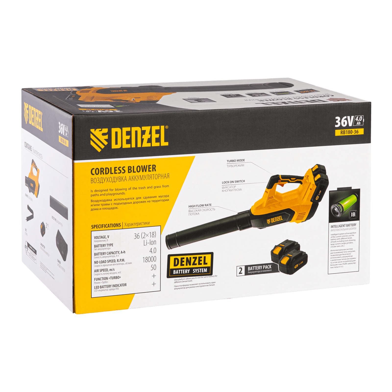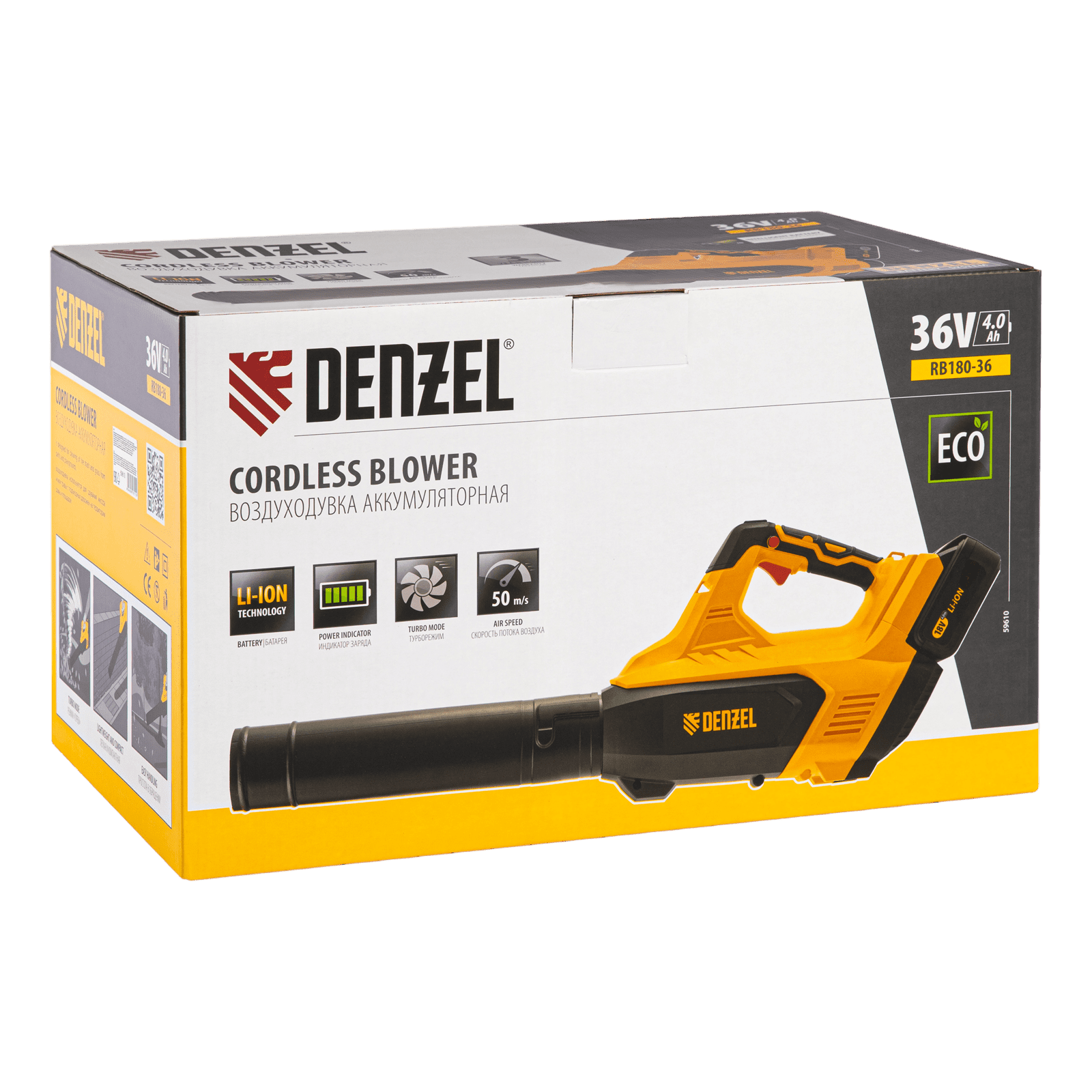 Аккумуляторная воздуходувка Denzel RB180-36 59610 производительностью 820 куб. м/ч предназначена для очистки придомовых территорий от опавшей листвы, скошенной травы и опилок. Высокая скорость воздушного потока 180 км/ч обеспечивает эффективную работу и позволяет убирать также мелкий строительный мусор и небольшие ветки.;Благодаря аккумуляторам Li-ion общим напряжением 36 В и емкостью 4 Ач можно работать в любом месте вне зависимости от наличия электросети. Воздуходувка не выделяет вредных выхлопов и не требует сложного технического обслуживания, что делает ее использование максимально удобным и безопасным.