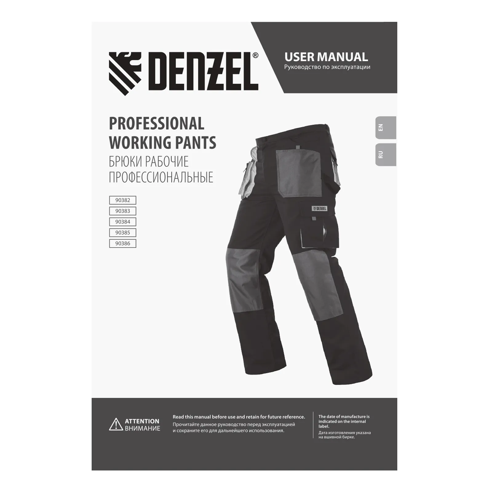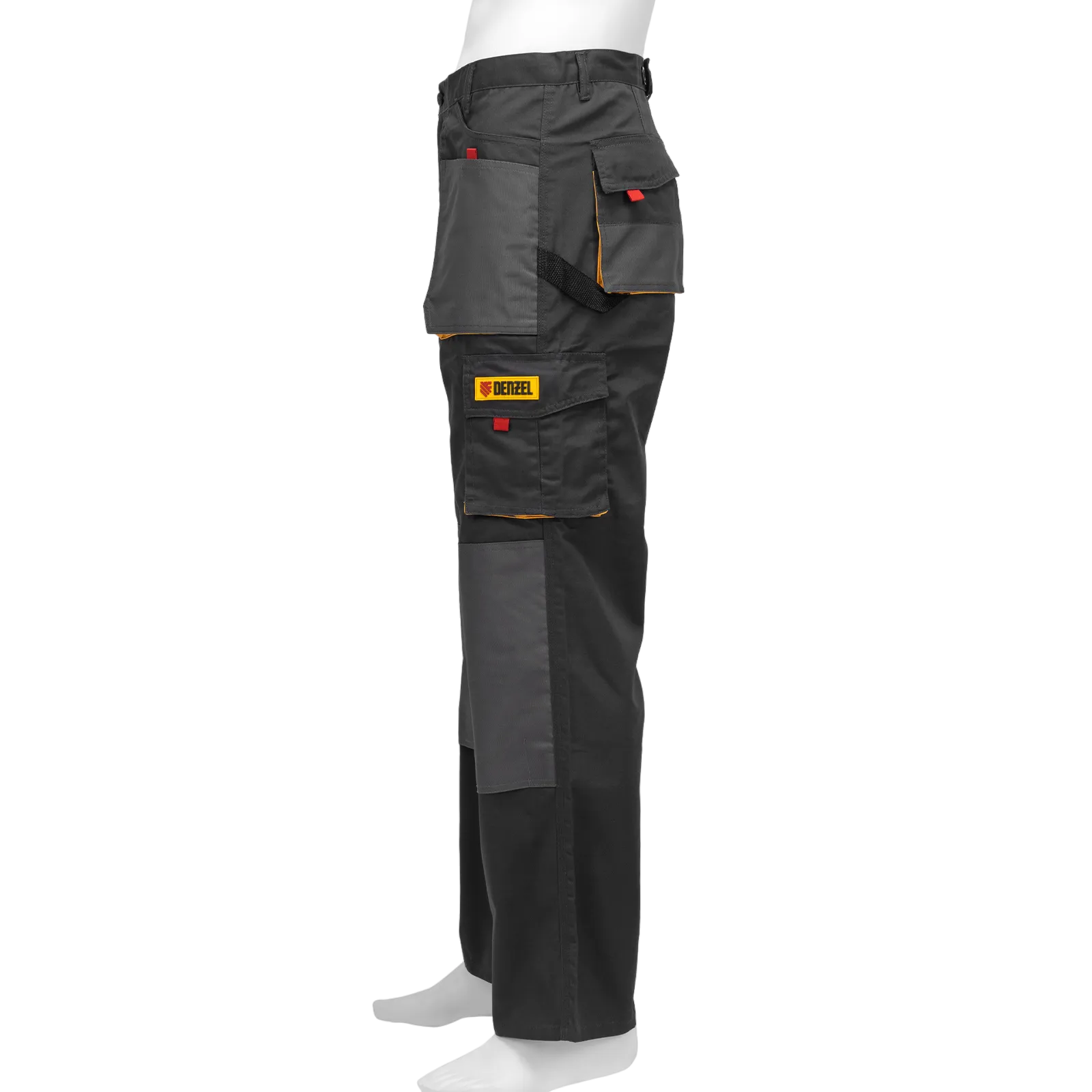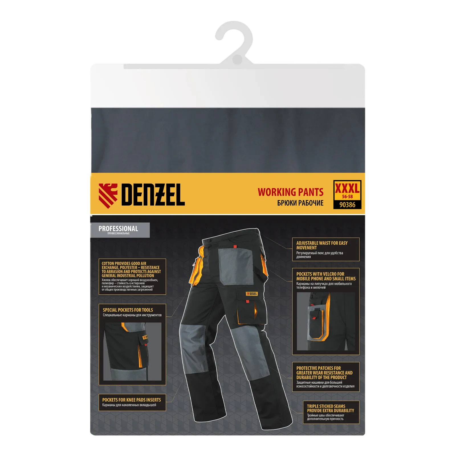 Рабочие брюки Denzel 90386 размера XXXL рассчитаны на рост 188-191 см и используются для выполнения профессиональных строительных, ремонтных, сантехнических и производственных работ в теплое время года или в отапливаемом помещении. Защищают пользователя от общих производственных загрязнений, нетоксичной пыли, ветра и незначительных механических воздействий. Изготовлены из ткани плотностью 260 г/м² (65% полиэфир, 35% хлопок). За счет наличия хлопковых волокон в составе ткань хорошо пропускает воздух и приятна на теле, полиэфир обеспечивает устойчивость к истиранию. Брюки выполнены в практичном темно-сером цвете.