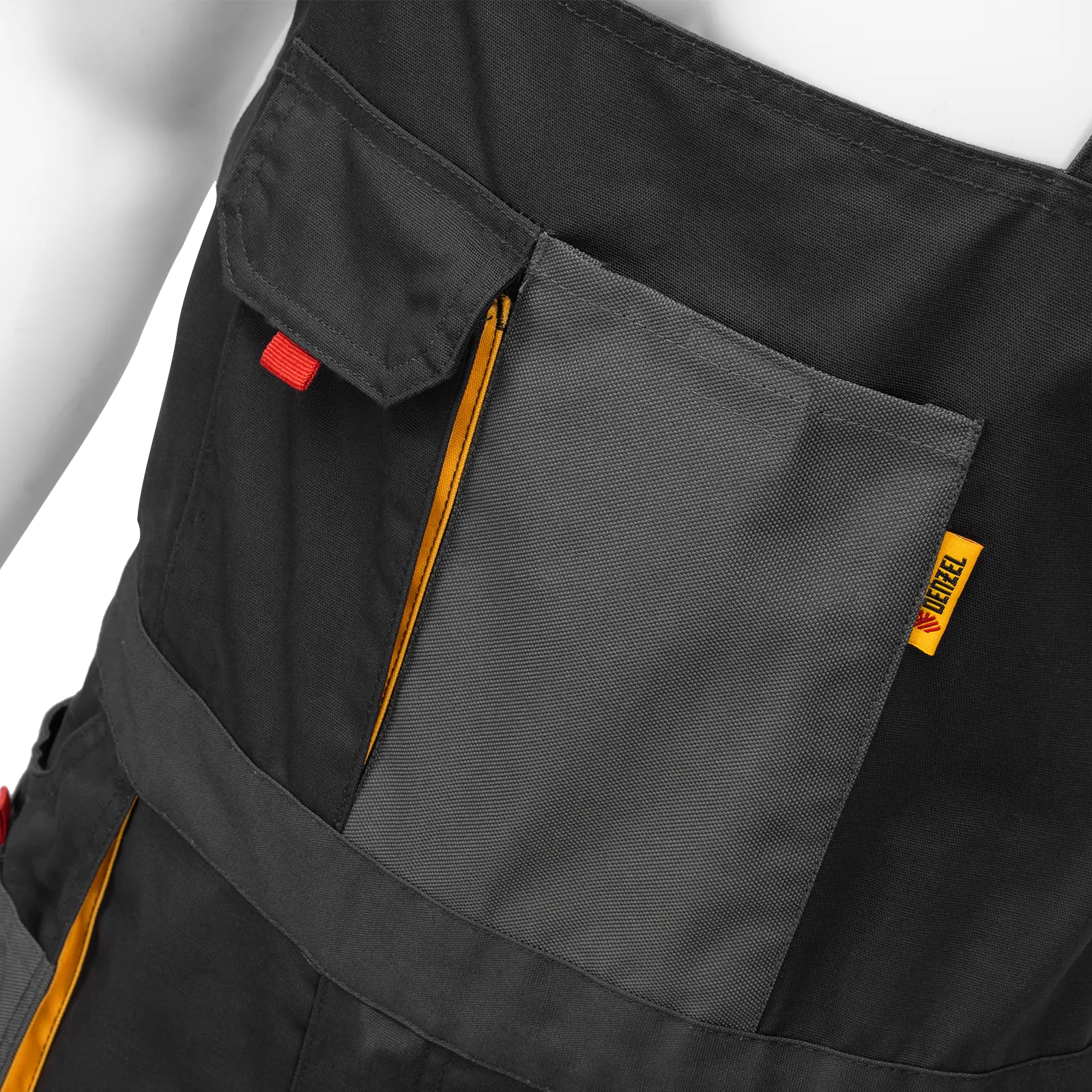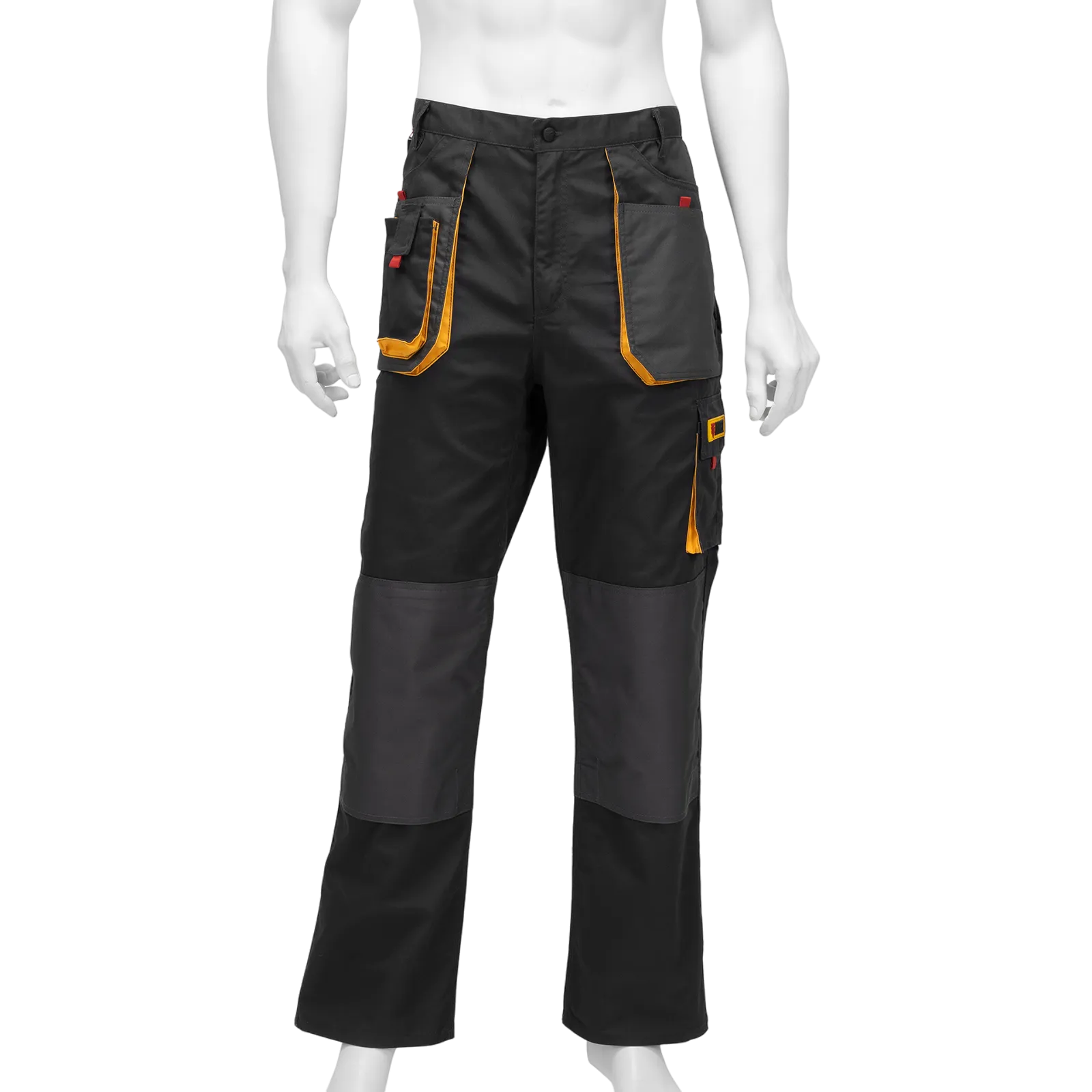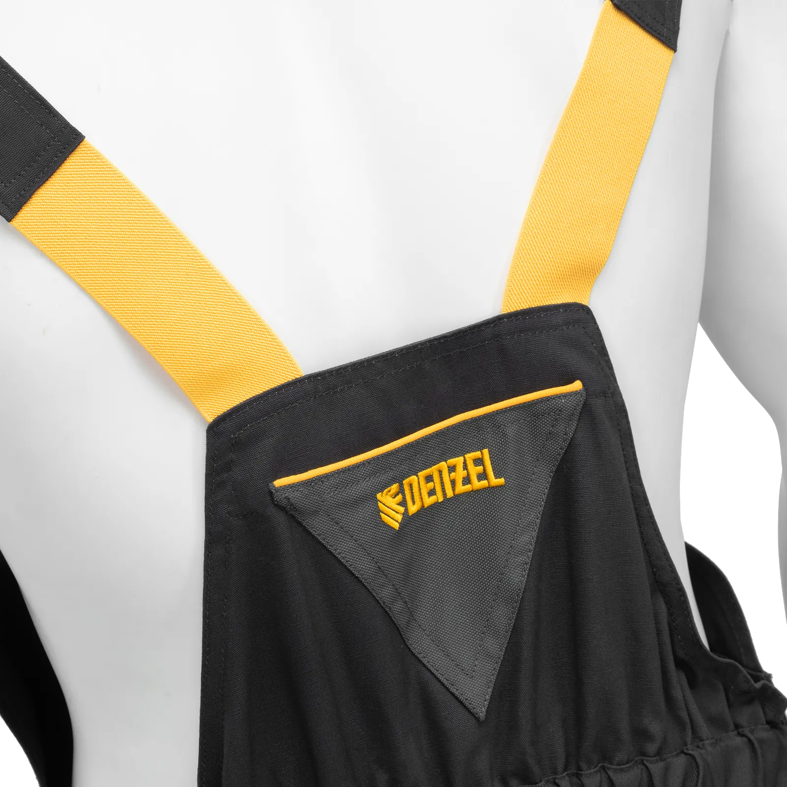 Рабочие брюки Denzel 90386 размера XXXL рассчитаны на рост 188-191 см и используются для выполнения профессиональных строительных, ремонтных, сантехнических и производственных работ в теплое время года или в отапливаемом помещении. Защищают пользователя от общих производственных загрязнений, нетоксичной пыли, ветра и незначительных механических воздействий. Изготовлены из ткани плотностью 260 г/м² (65% полиэфир, 35% хлопок). За счет наличия хлопковых волокон в составе ткань хорошо пропускает воздух и приятна на теле, полиэфир обеспечивает устойчивость к истиранию. Брюки выполнены в практичном темно-сером цвете.