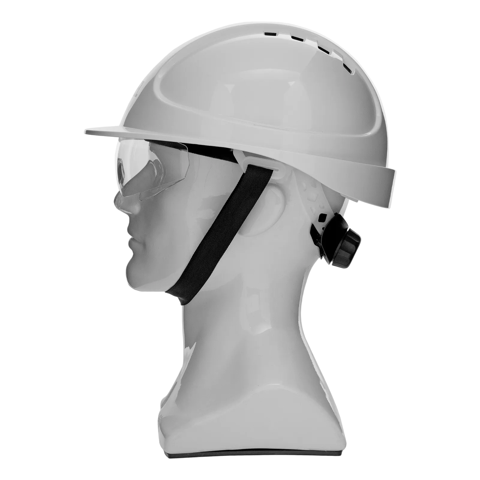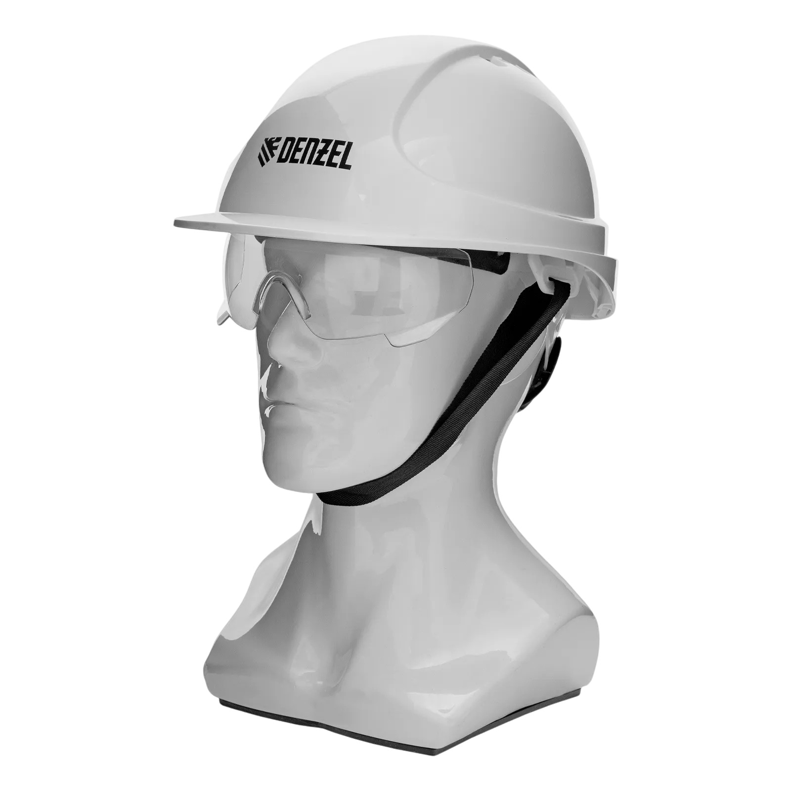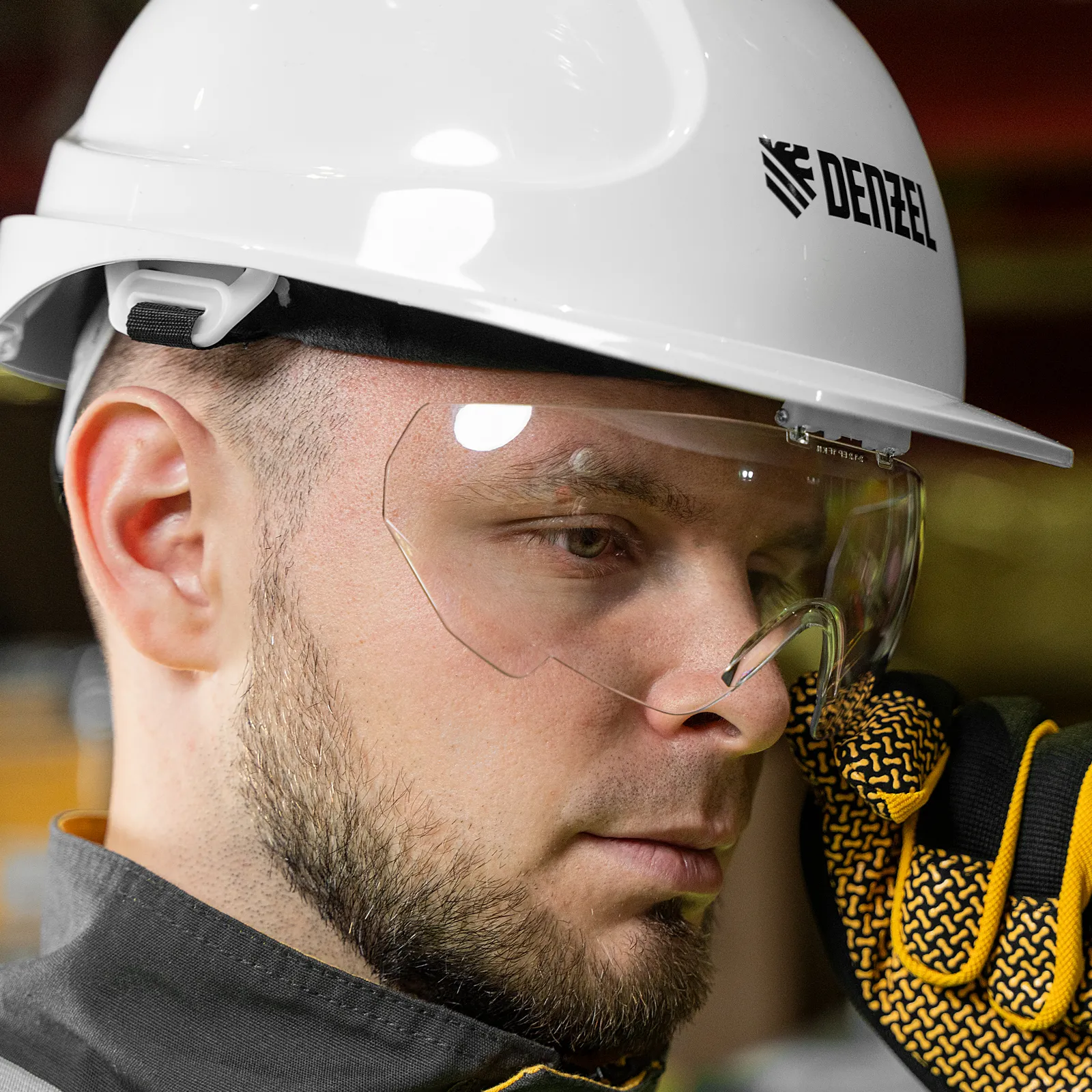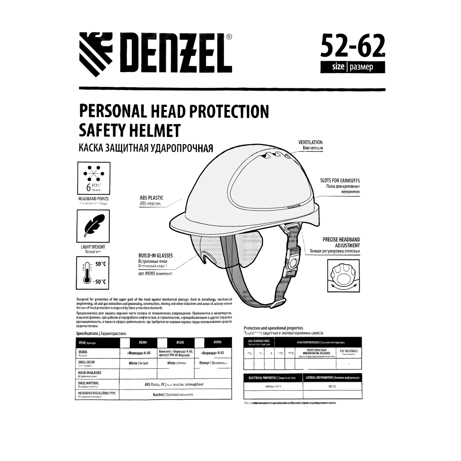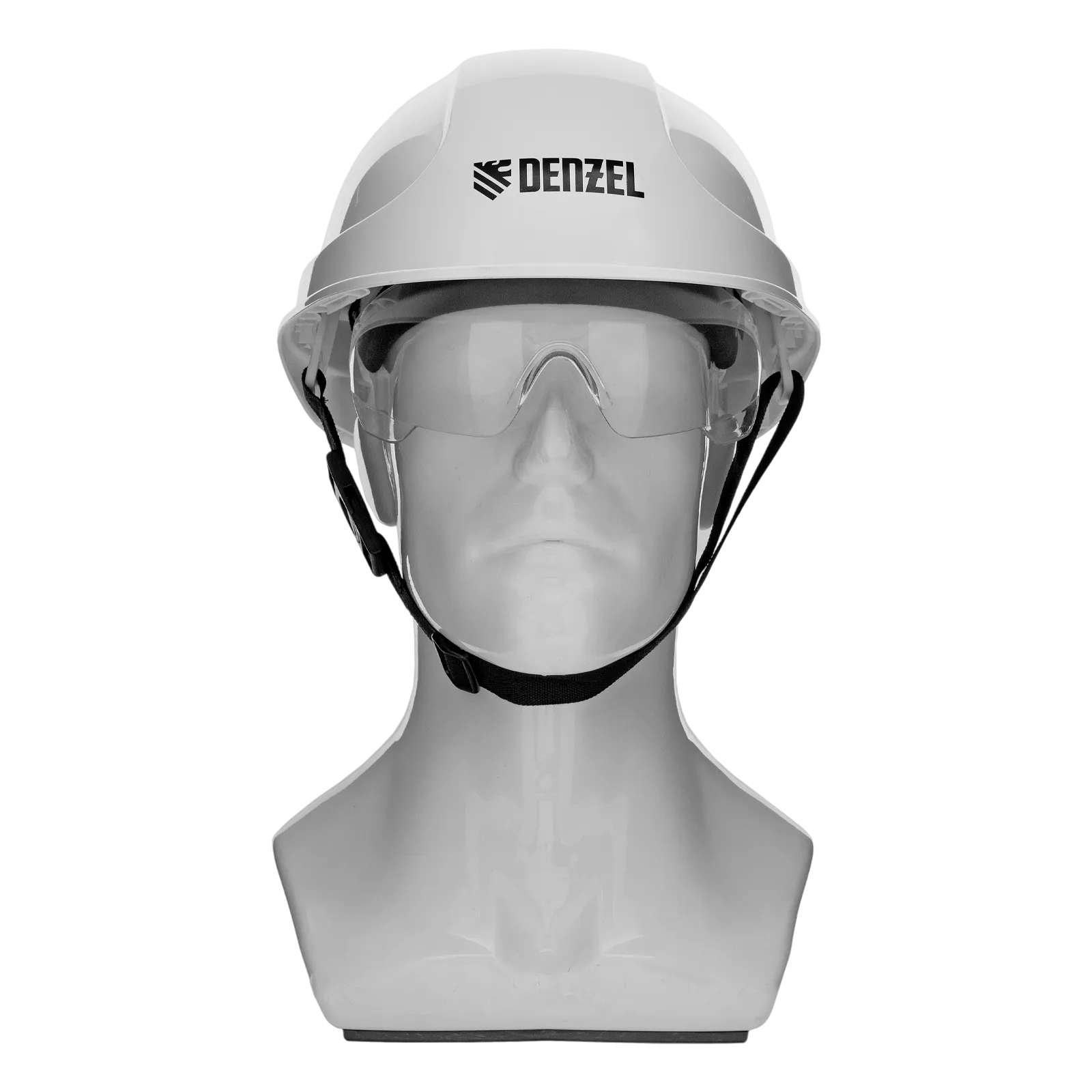 Защитная ударопрочная каска Denzel «Форвард» К-05 89205 белого цвета, со встроенными очками ОЧК-5, изготовлена из ABS-пластика и поликарбоната и предназначена для защиты головы работника от механических воздействий и влаги. Удлиненная задняя часть защищает затылок, дополнительную защиту обеспечивают открытые очки с антизапотевающим покрытием. Они легко вытягиваются из оголовья и так же легко убираются обратно. Каска сочетает в себе современный функциональный дизайн, надежность и практичность. Несмотря на небольшой вес, обеспечивает максимальную защиту и комфорт пользователя. Необходима на строительной площадке и на производстве.