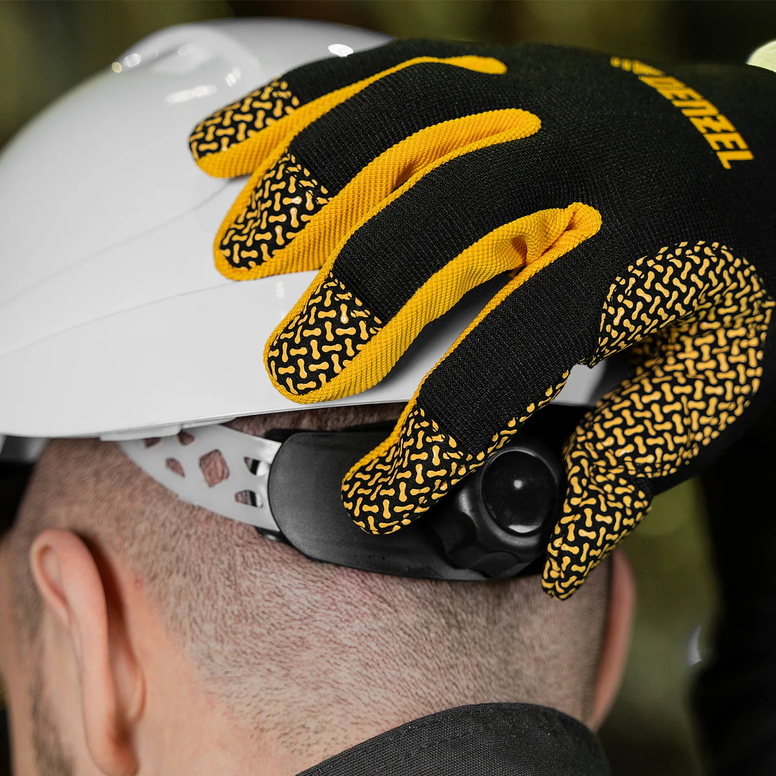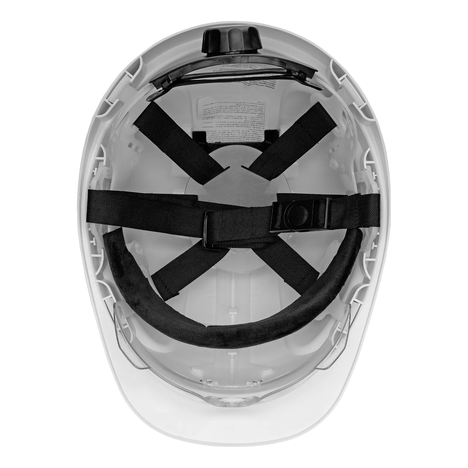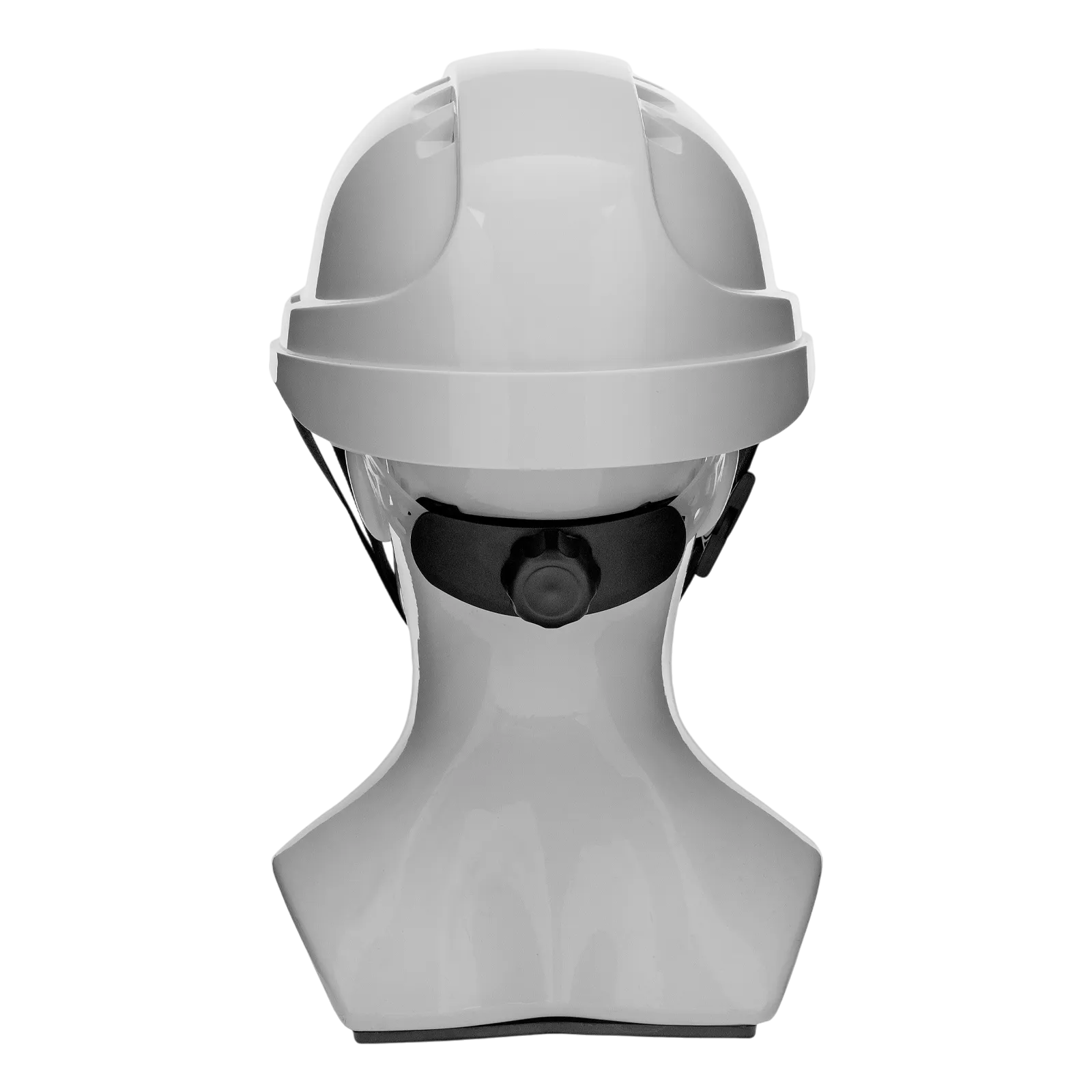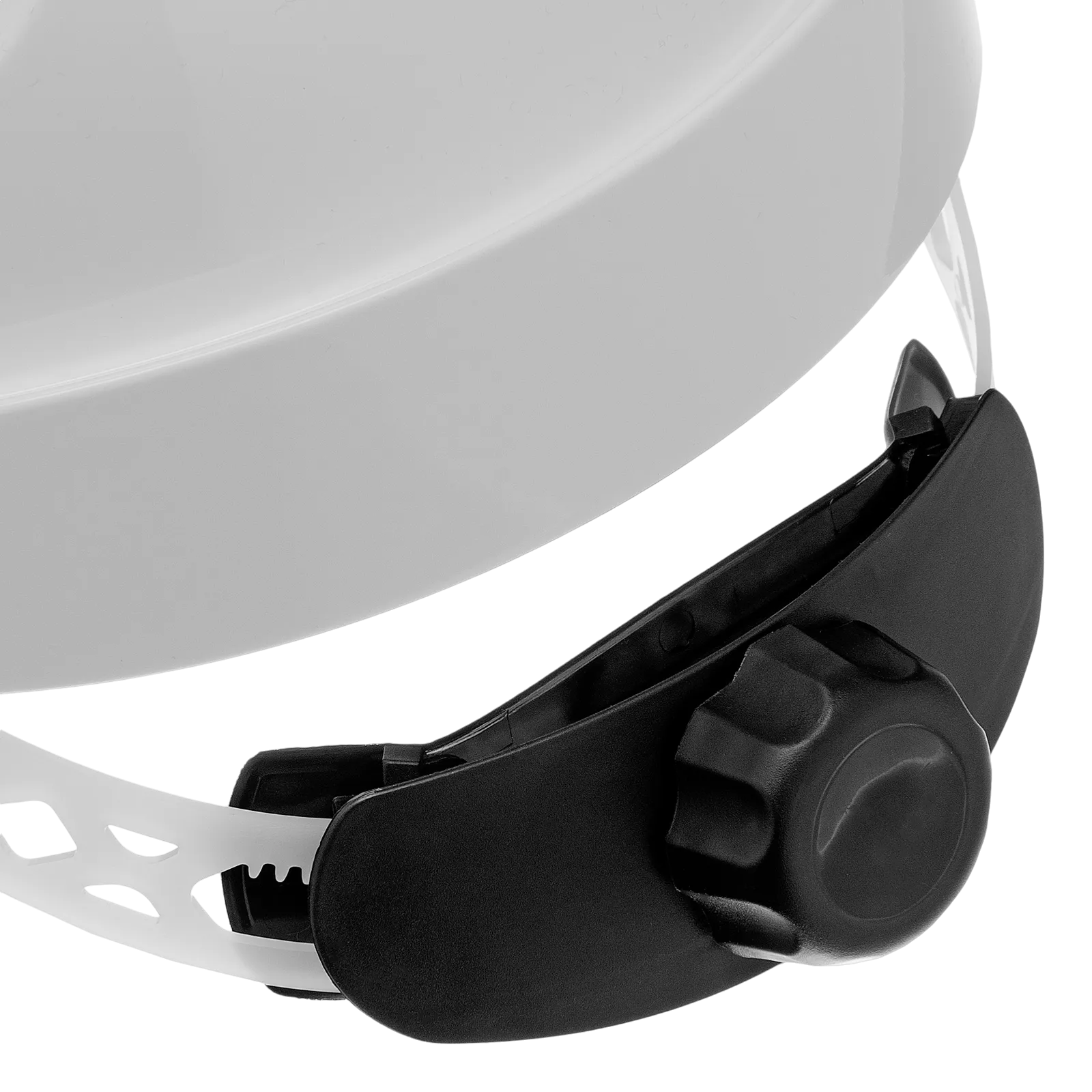 - Удобная посадка — наголовное крепление с храповиком позволяет плавно подгонять и точно регулировать размер оголовья от 52 до 62 см, каска комфортно прилегает к затылочной части головы за счет мягкой эластичной вставки.