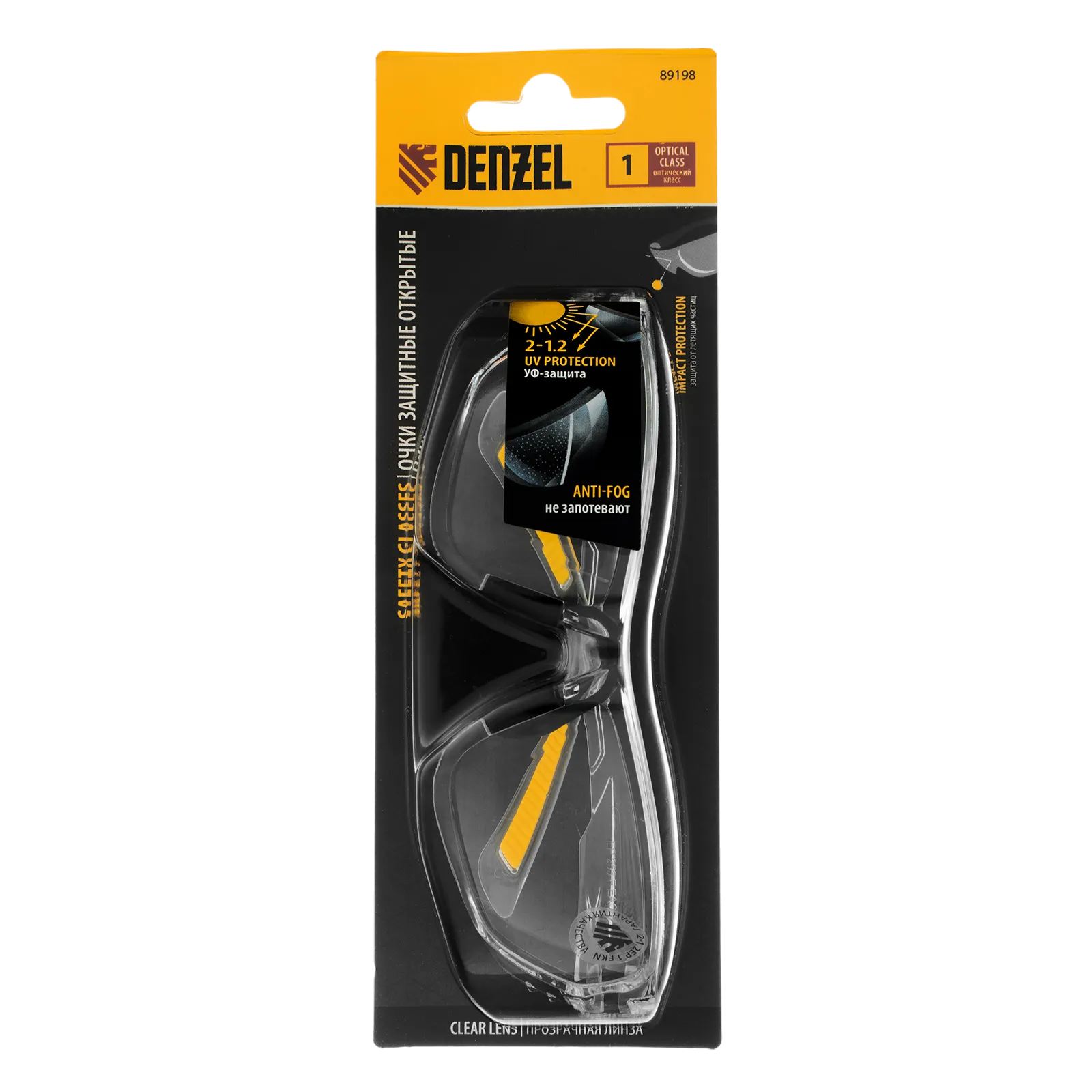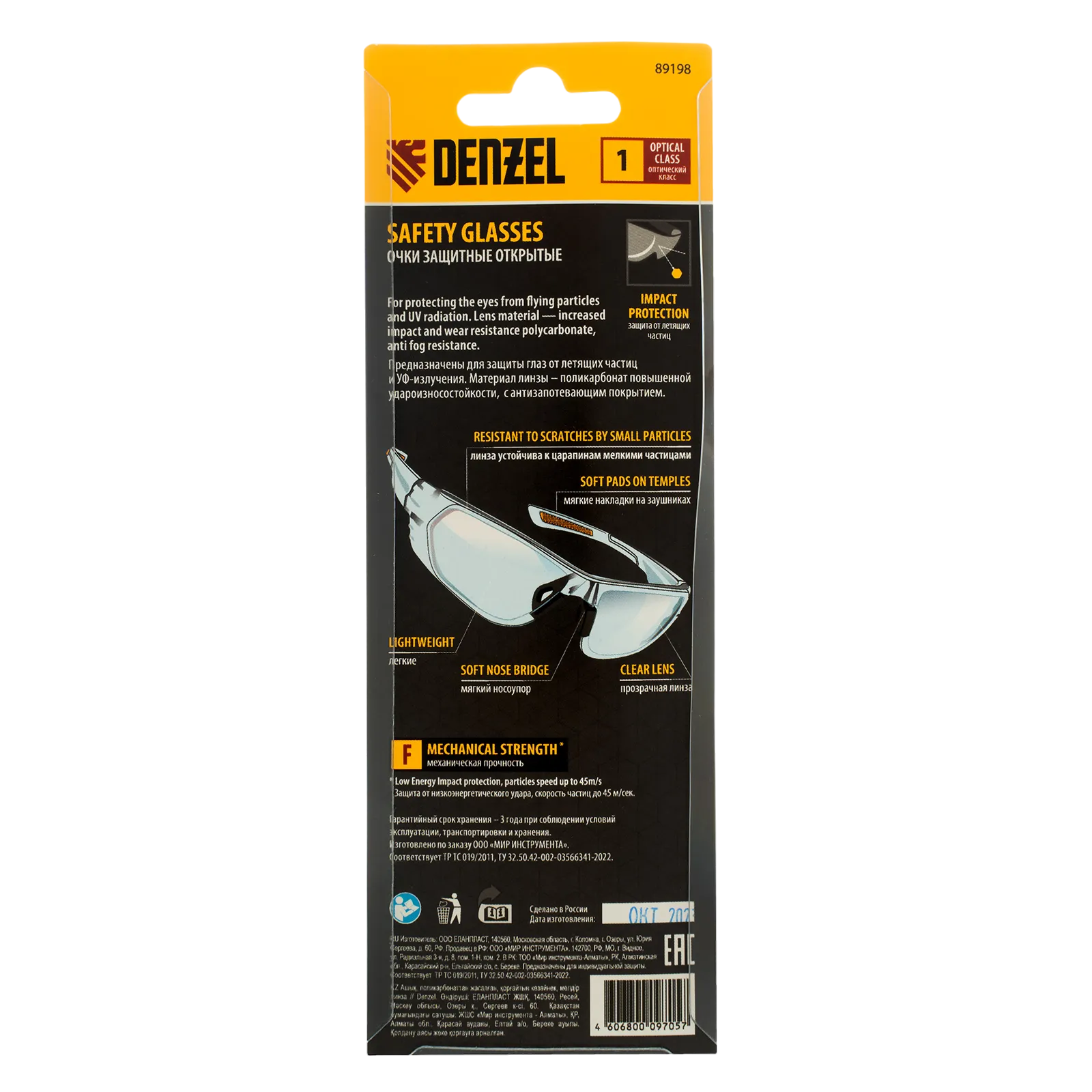 Очки защитные открытые Denzel 89198 с поликарбонатными прозрачными линзами предназначены для защиты глаз от механических повреждений и УФ-излучения. Очкам присвоен класс механической прочности F, они обеспечивают защиту от высокоскоростных частиц с низкоэнергетическим ударом (скорость частиц до 45 м/с). Легкие универсальные очки используются во время работы с электро- и бензоинструментом, на производстве и в быту.