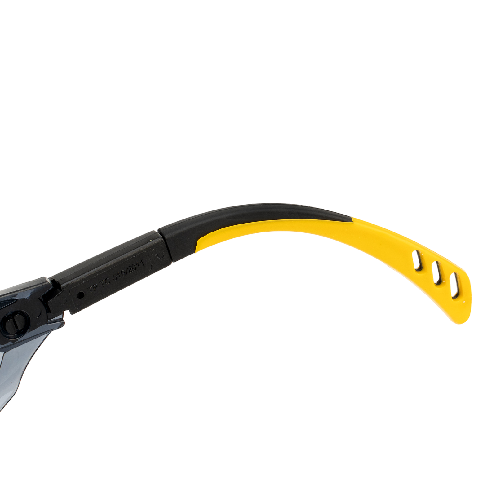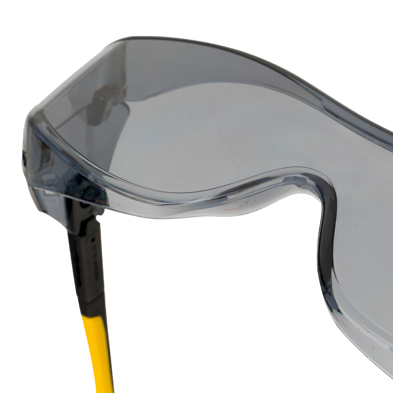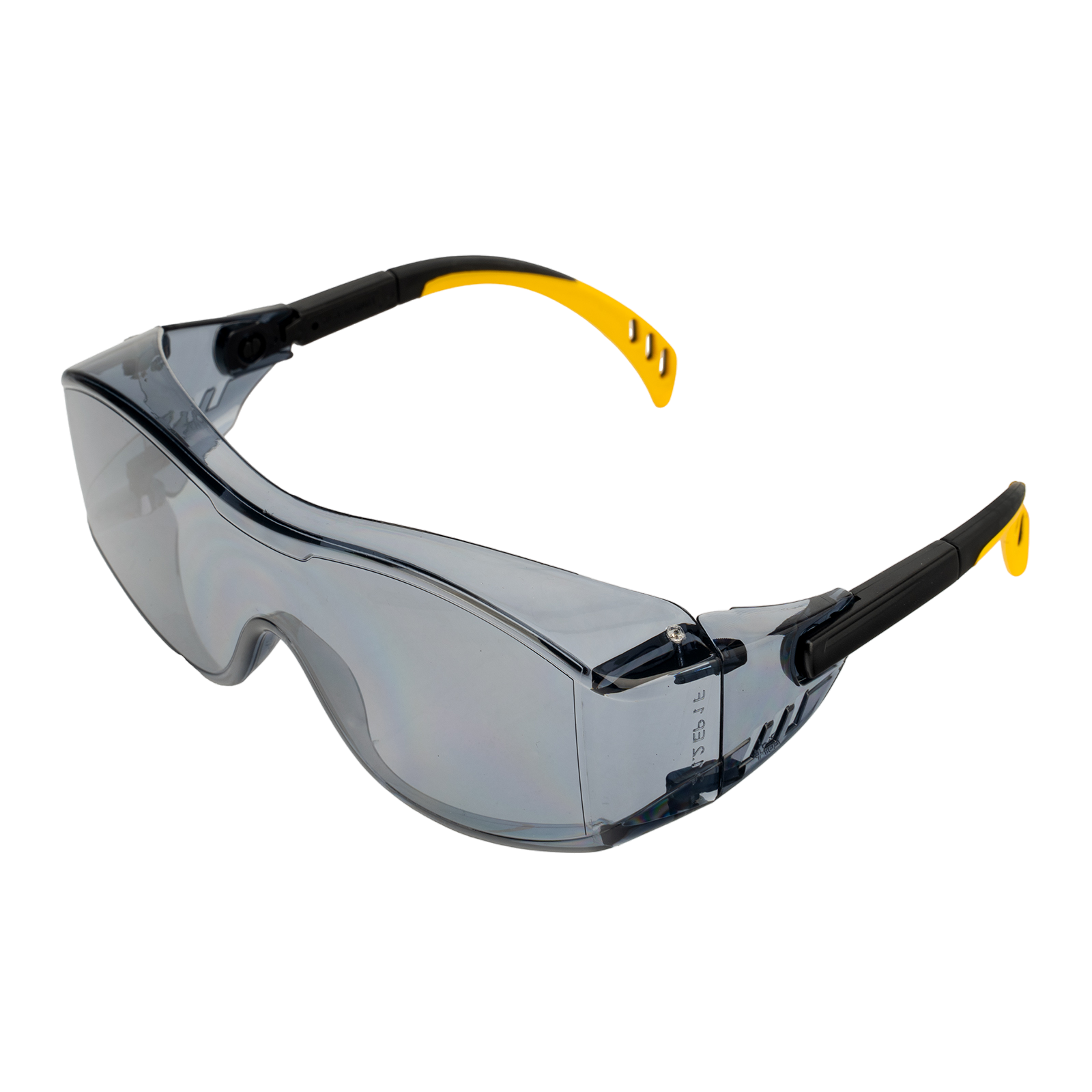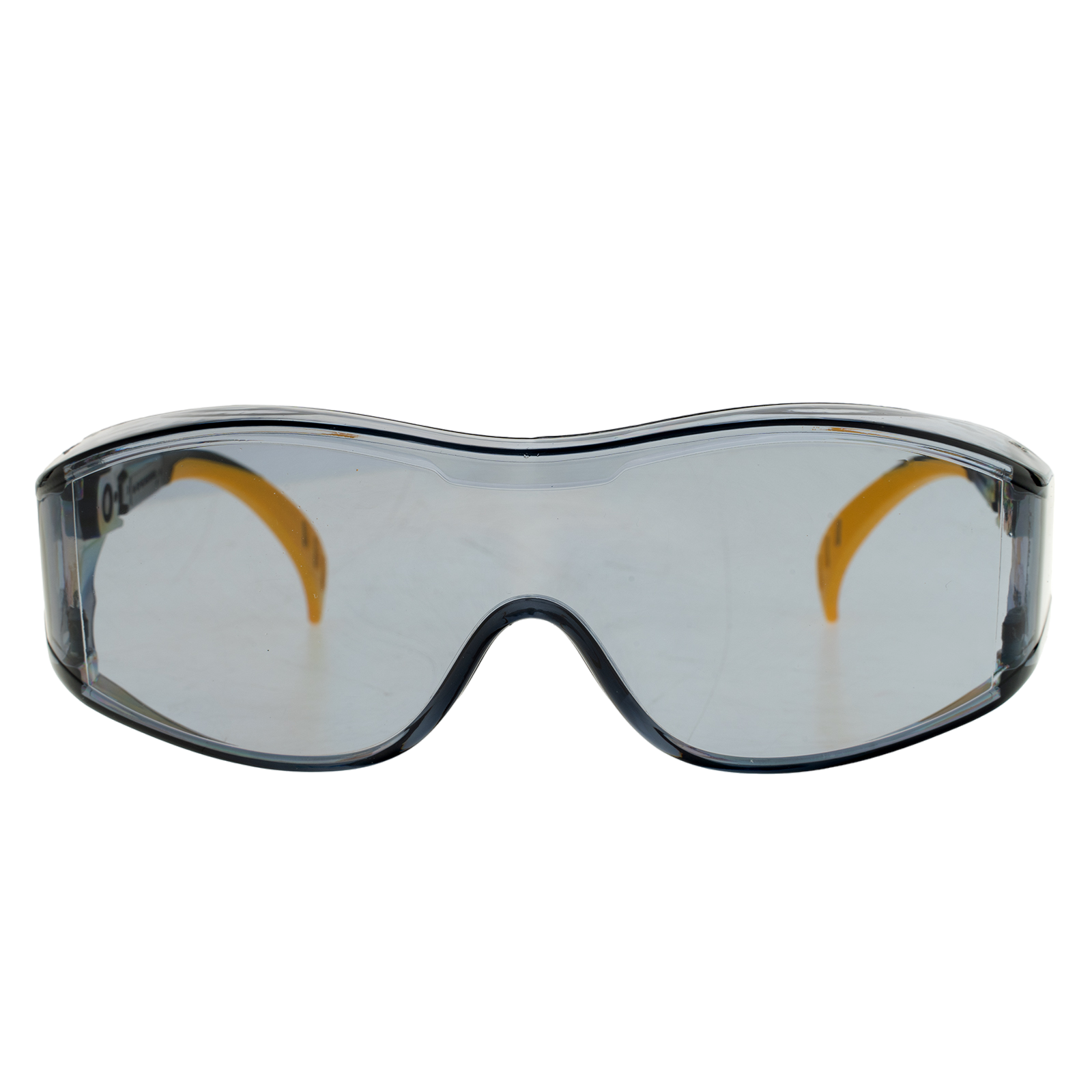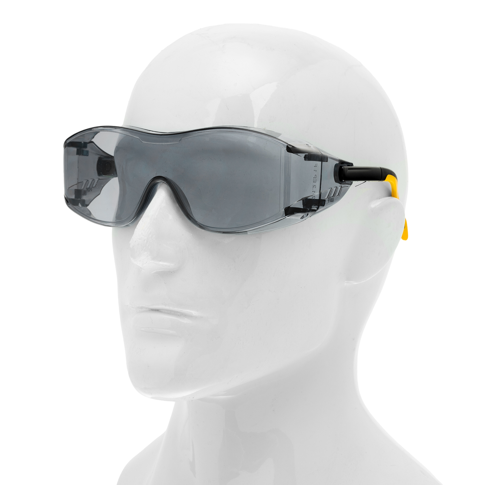 - Продуманная конструкция — особая форма линз обеспечивает боковую и надбровную защиту, а также позволяет носить защитные очки вместе с коррригирующими.