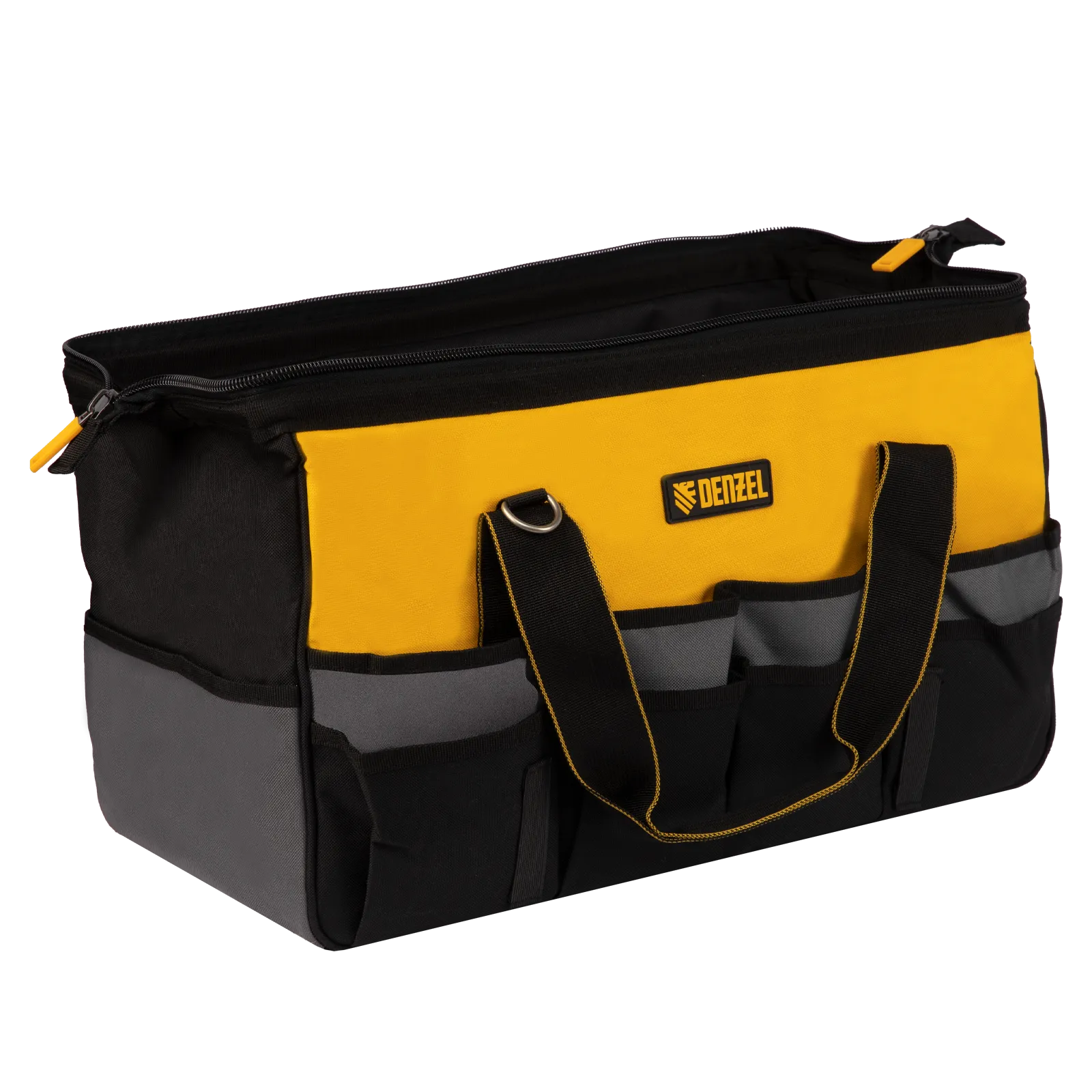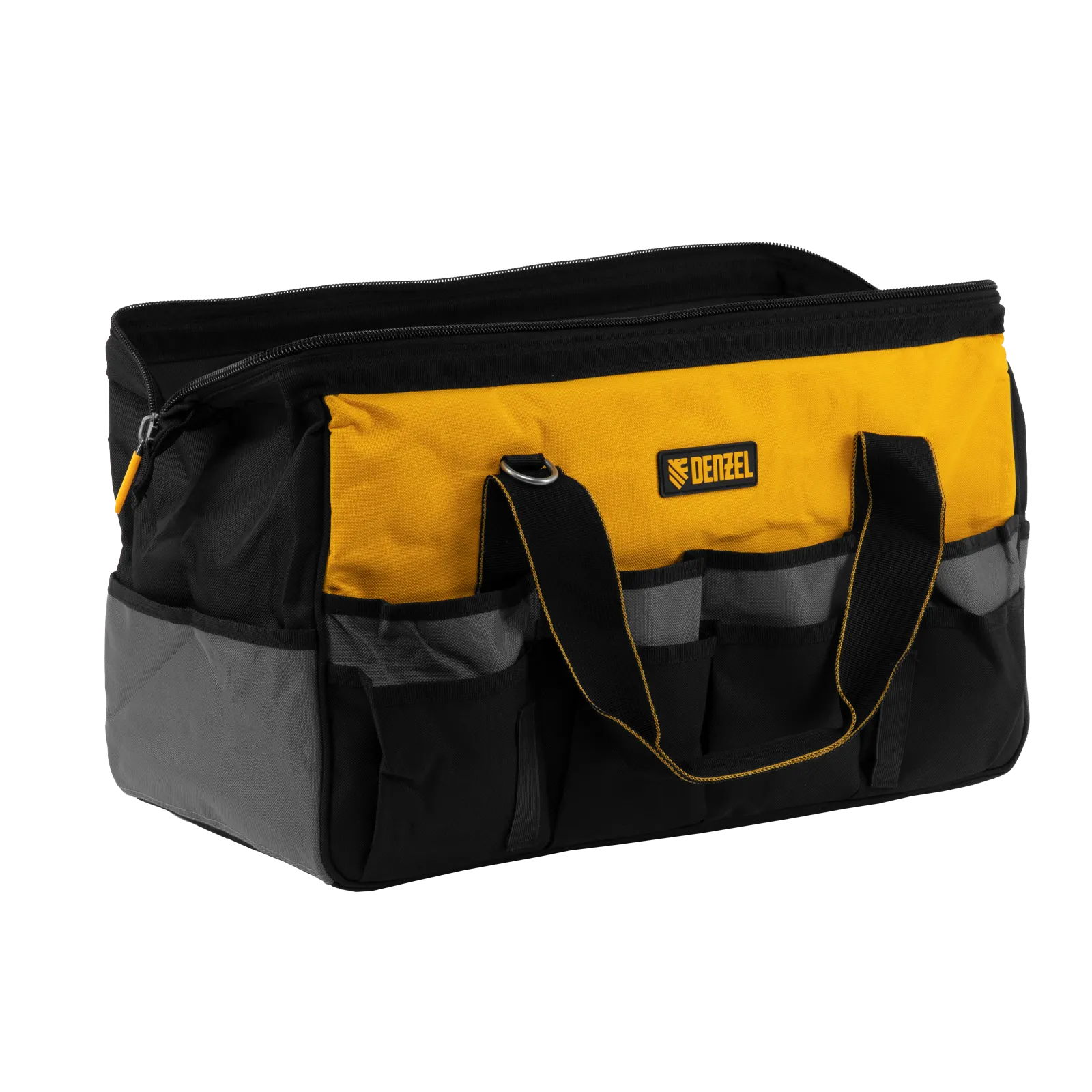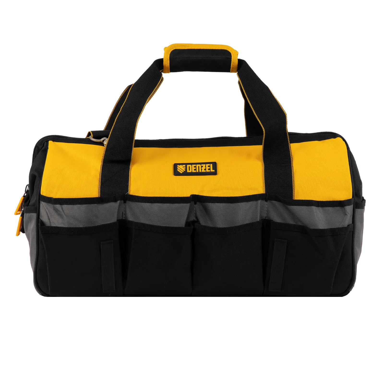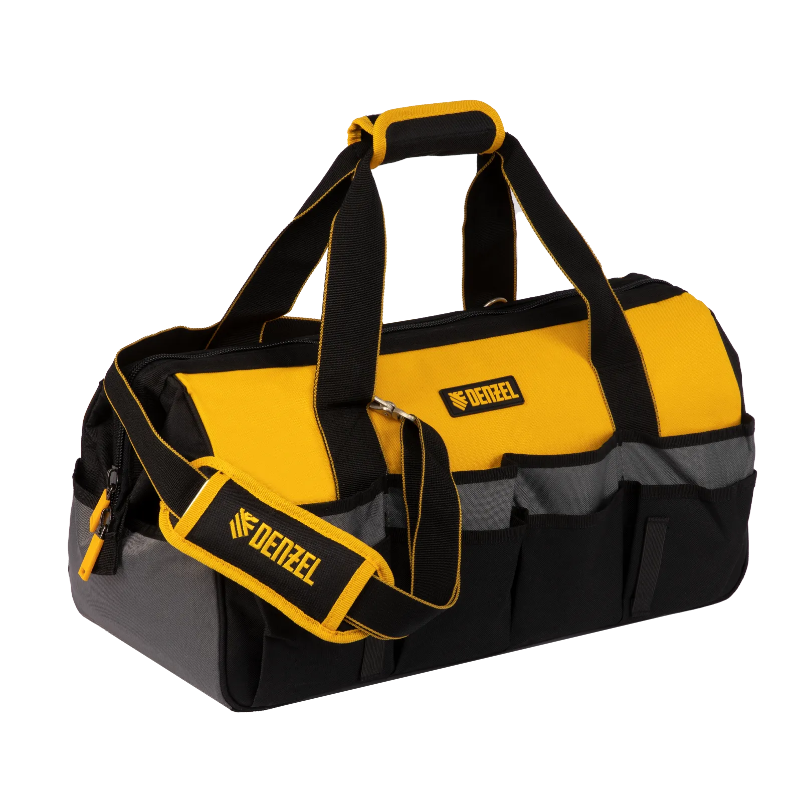 Сумка Denzel 90293 габаритами 500 х 245 х 300 мм с 20 карманами (в том числе съемным органайзером на 10 карманов) и наплечным ремнем, вмещает большое количество инструментов и используется для их хранения и транспортировки. Пригодится монтажнику, сантехнику, мастеру на выезде и автовладельцу.