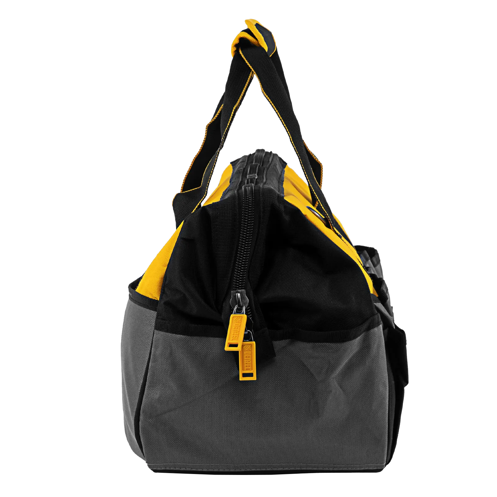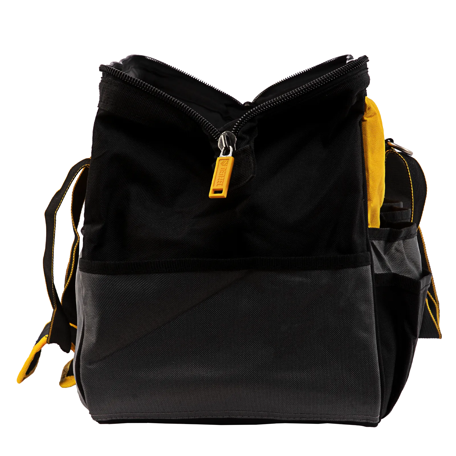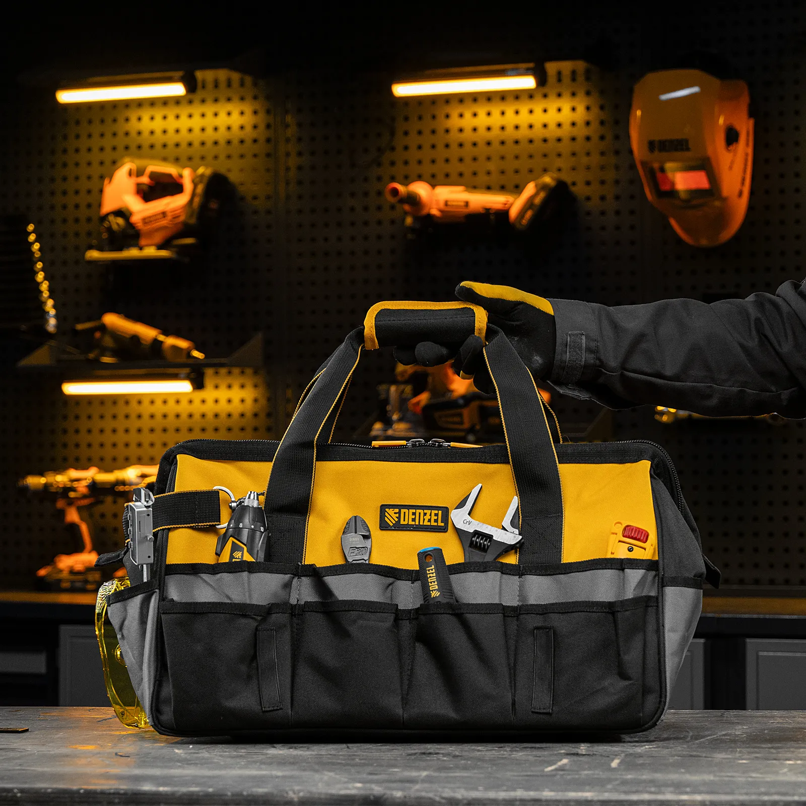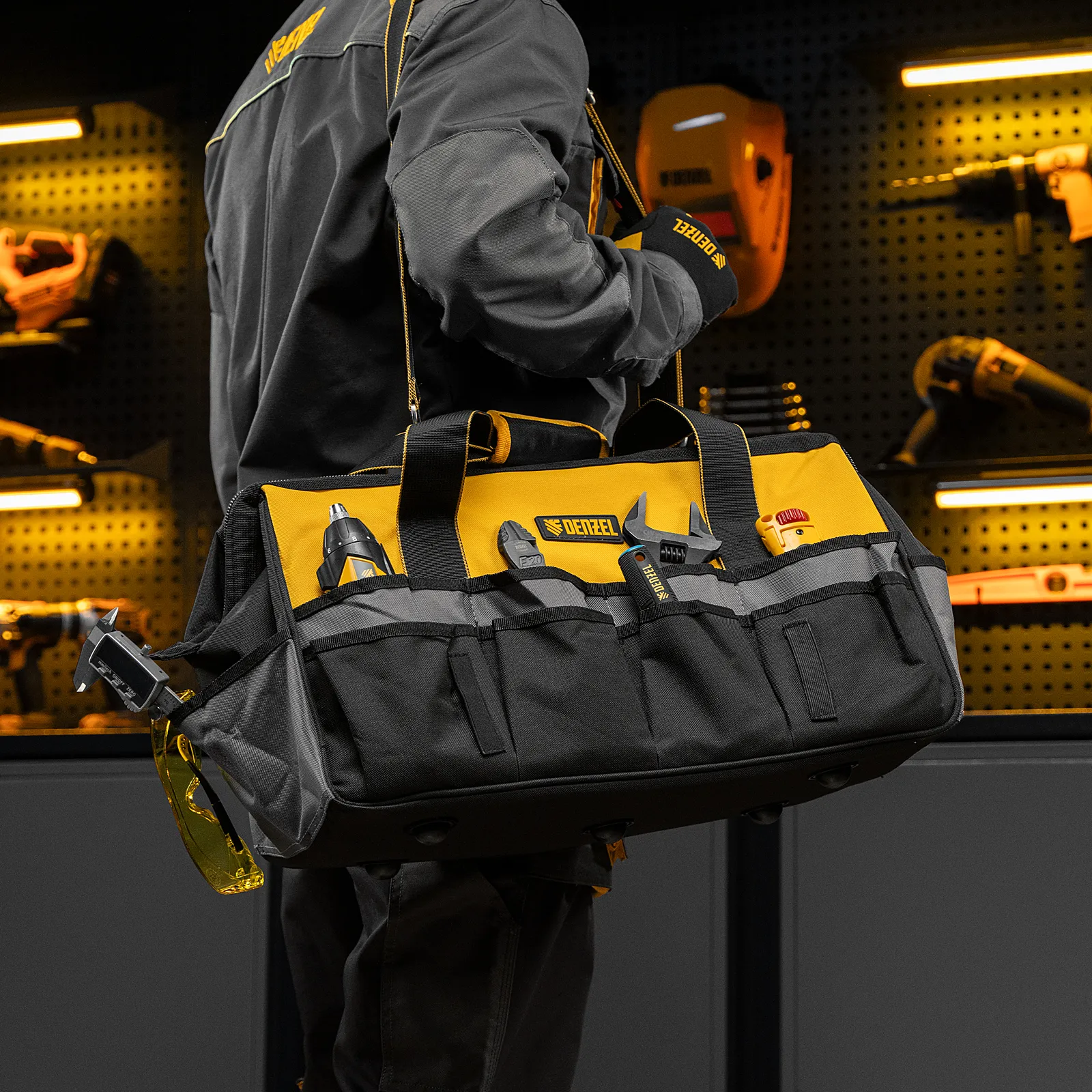 Сумка Denzel 90293 габаритами 500 х 245 х 300 мм с 20 карманами (в том числе съемным органайзером на 10 карманов) и наплечным ремнем, вмещает большое количество инструментов и используется для их хранения и транспортировки. Пригодится монтажнику, сантехнику, мастеру на выезде и автовладельцу.