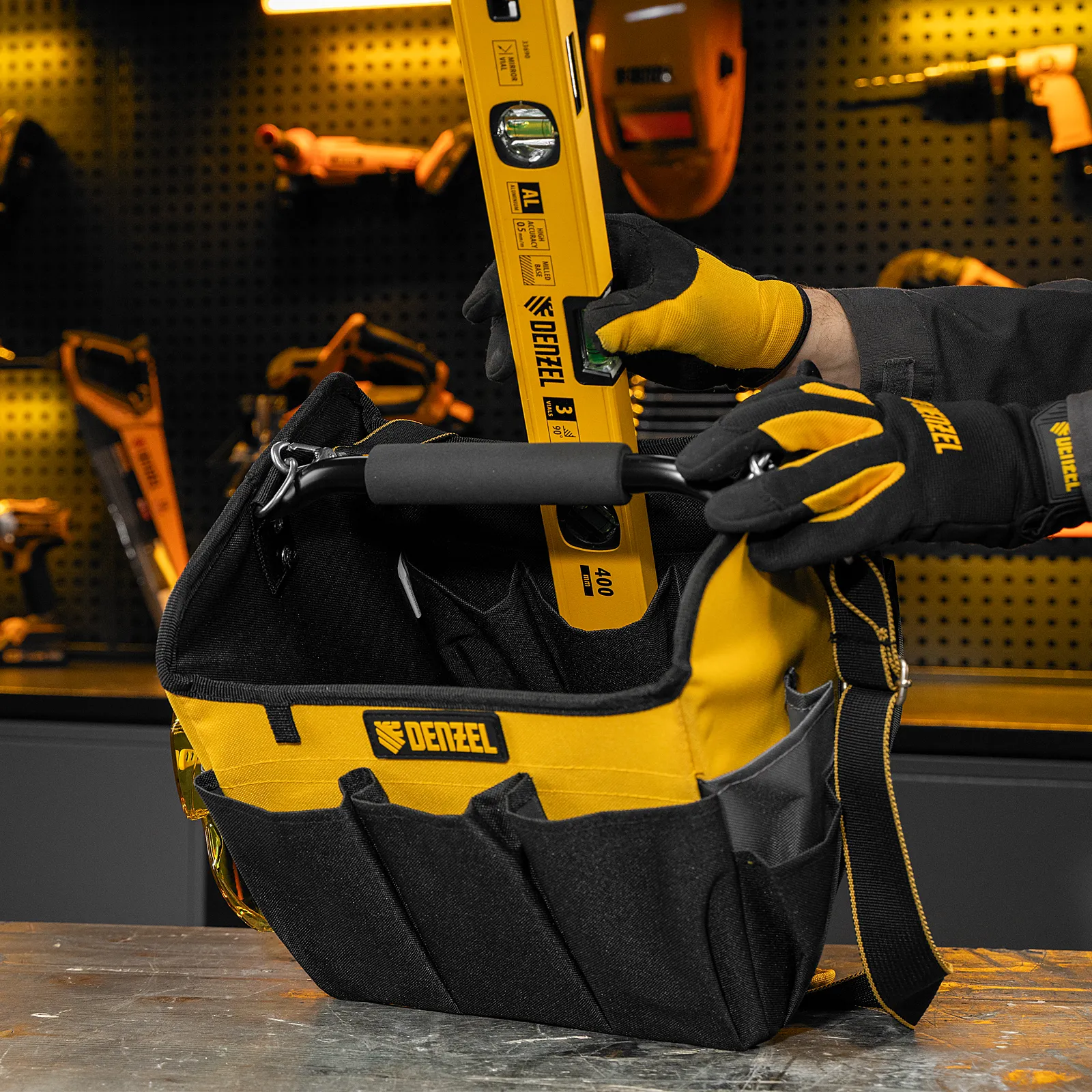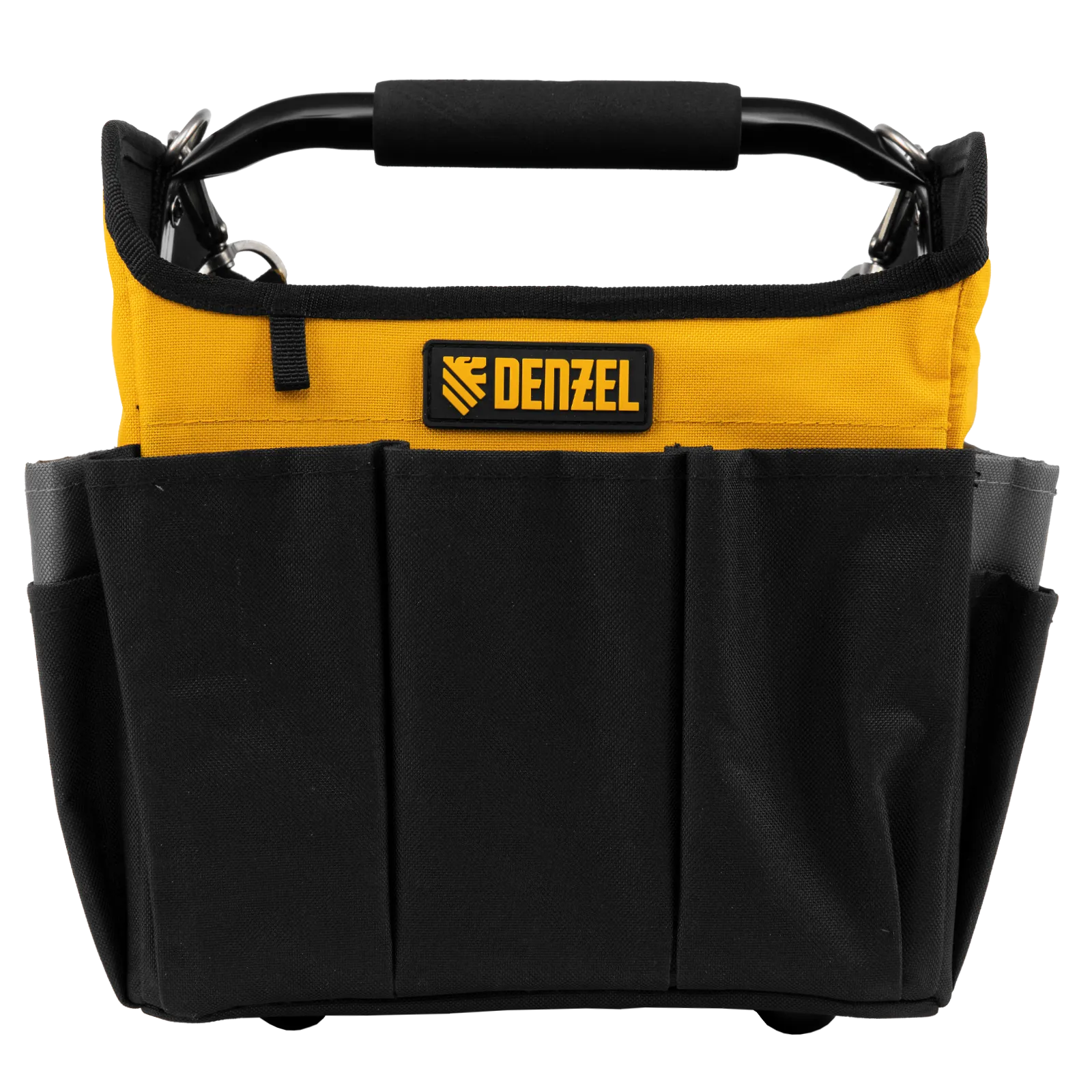 Переноска Denzel 90294 габаритами 260 х 240 х 300 мм, с наплечным ремнем, имеет вместительное основное отделение и 22 кармана. В ней можно разместить ручной и электроинструмент для хранения и транспортировки. Переноска пригодится в дороге, дома или в гараже.