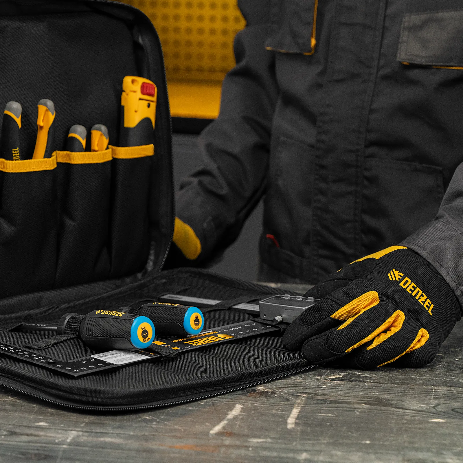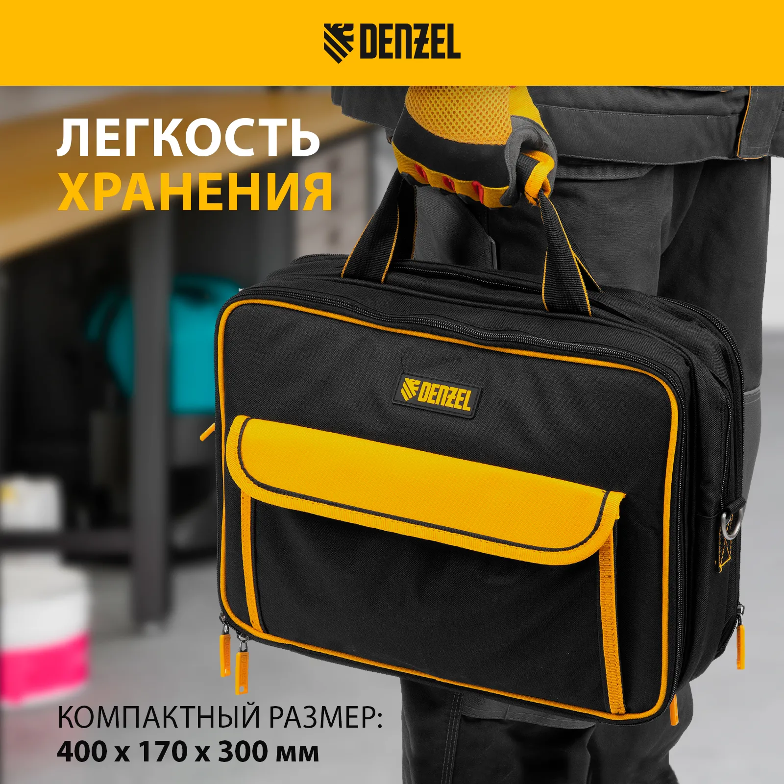 Сумка Denzel 90295 габаритами 400 х 170 х 300 мм, с наплечным ремнем, имеет 3 отделения и 28 карманов, в которых можно разместить необходимые инструменты, оснастку и расходники. Пригодится дома, в гараже и в поездке.