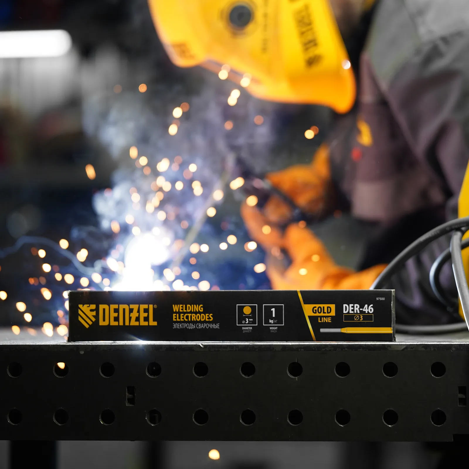Электроды Denzel GoldLine 97500 марки DER-46, диаметром 3 мм, с рутил-целлюлозным покрытием желтого цвета, 1 кг в упаковке, предназначены для ручной дуговой сварки заготовок из углеродистых и низколегированных конструкционных сталей толщиной 3-20 мм. Наличие целлюлозы в составе повышает защитные свойства газа, образующегося при сварке, и обеспечивает высокое качество выполняемых работ. Электроды подходят для создания нахлестных и стыковых соединений, потолочных и вертикальных швов, оптимальны для работы с короткими швами. Также допускается сварка тонкостенных деталей. Электроды просты в использовании и подойдут начинающему мастеру.