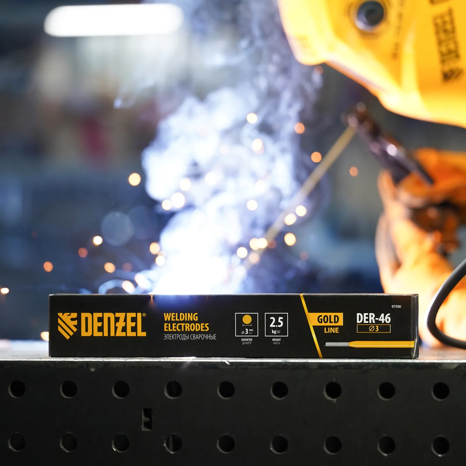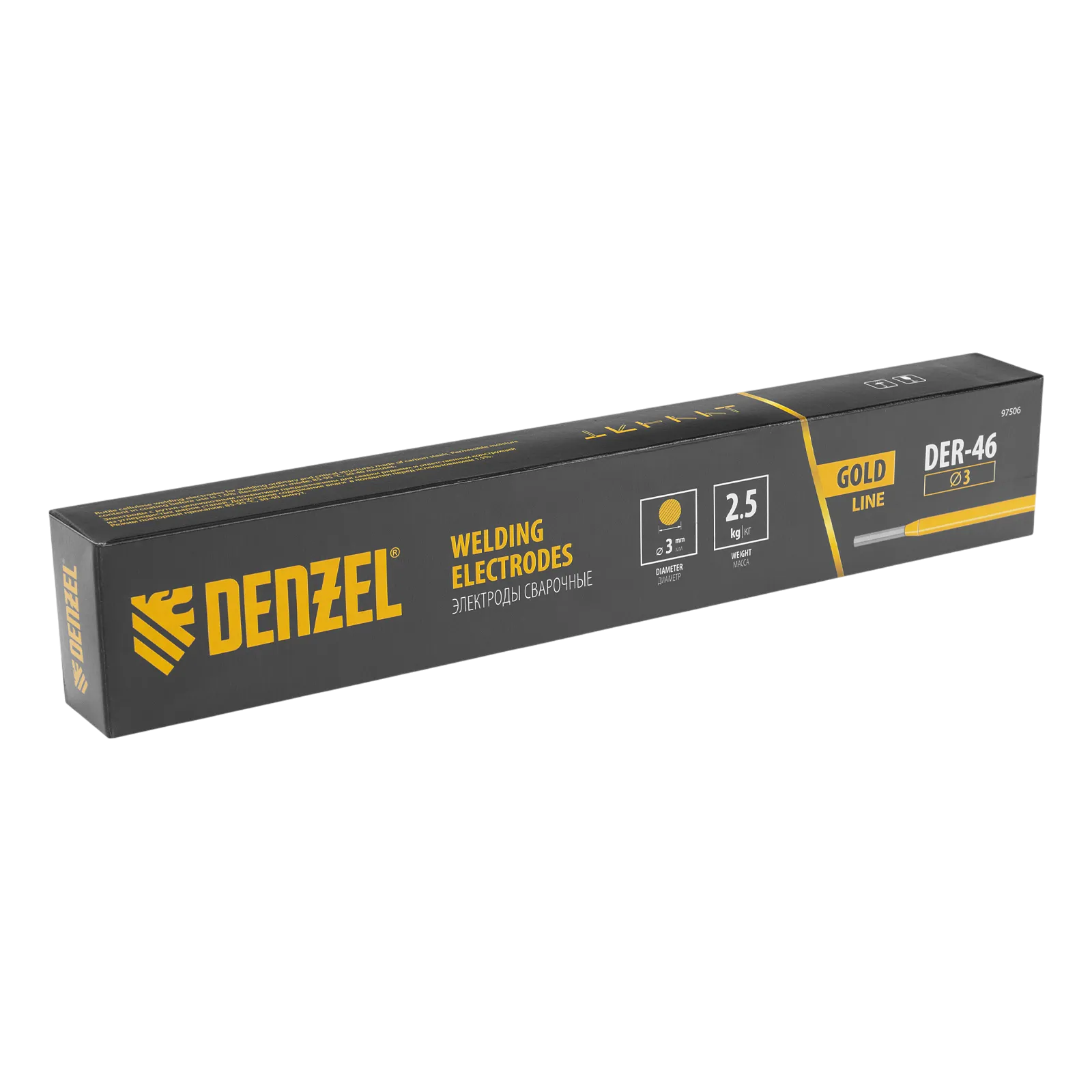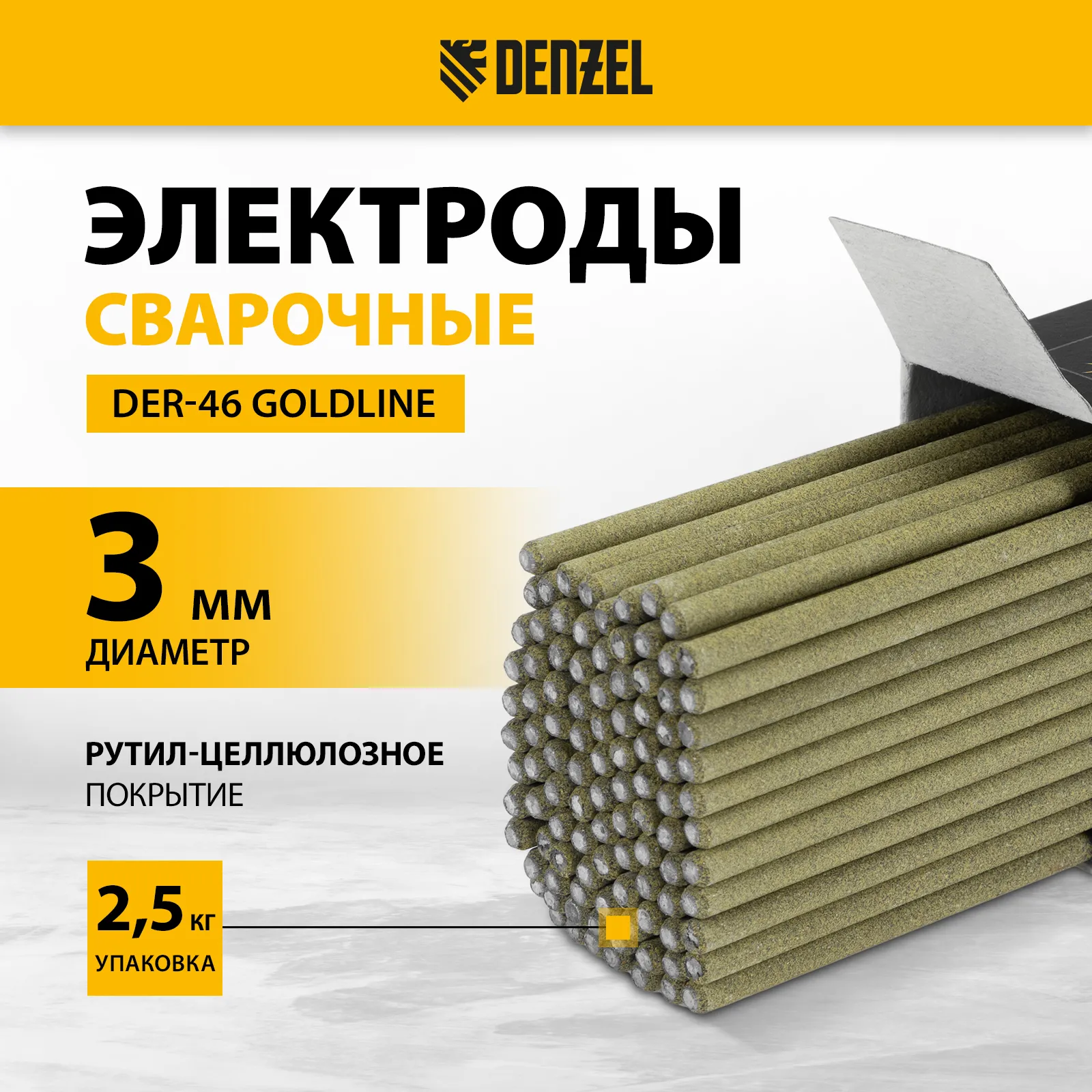 Электроды Denzel GoldLine 97506 марки DER-46, диаметром 3 мм, с рутил-целлюлозным покрытием желтого цвета, 2,5 кг в упаковке, предназначены для ручной дуговой сварки заготовок из углеродистых и низколегированных конструкционных сталей толщиной 3-20 мм. Наличие целлюлозы в составе повышает защитные свойства газа, образующегося при сварке, и обеспечивает высокое качество выполняемых работ. Электроды подходят для создания нахлестных и стыковых соединений, потолочных и вертикальных швов, оптимальны для работы с короткими швами. Также допускается сварка тонкостенных деталей. Электроды просты в использовании и подойдут начинающему мастеру.