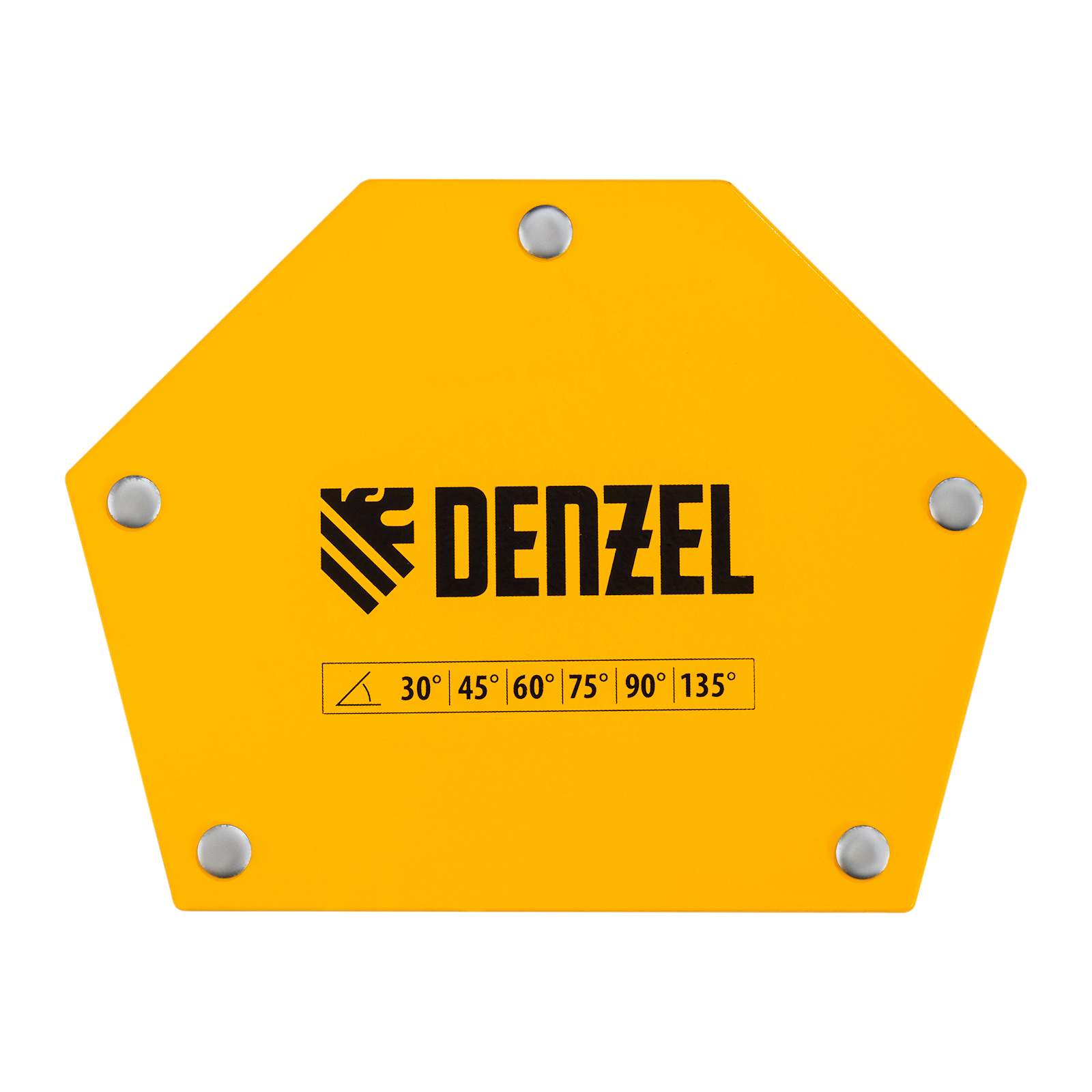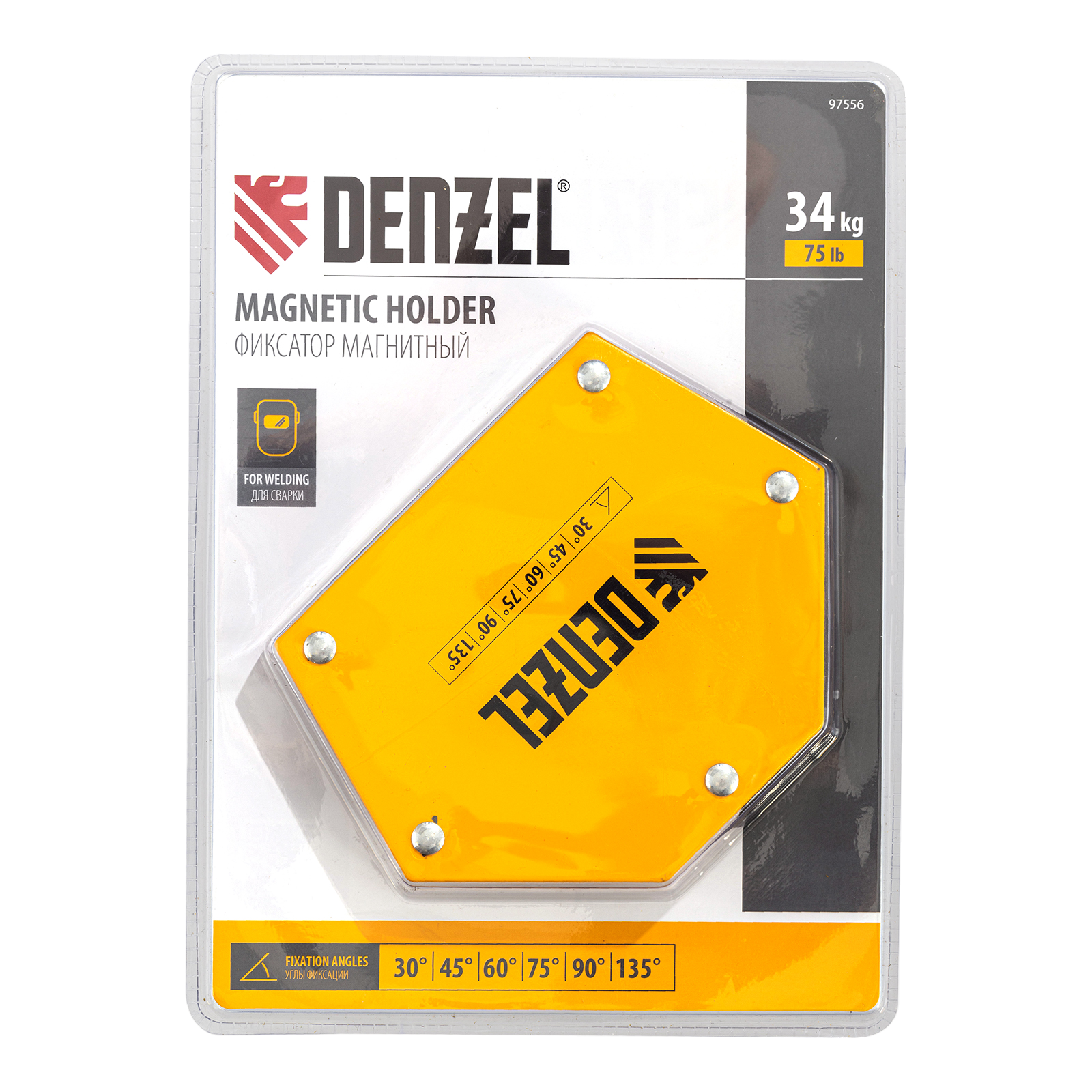 Фиксатор магнитный Denzel 97556 выдерживает усилие 75 LB (34 кг), позволяет соединять металлические детали разного размера под углом 30°, 45°, 60°, 75°, 90° и 135° и используется при проведении сварочных работ.
