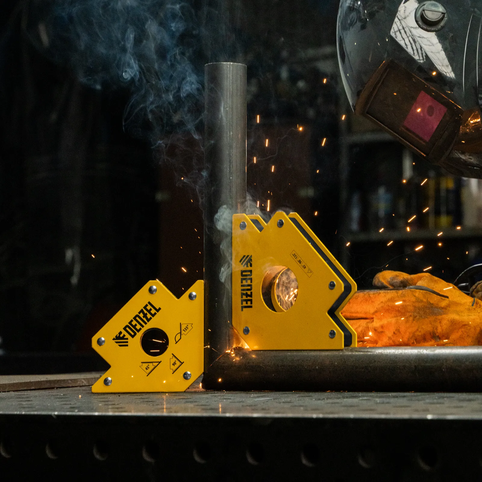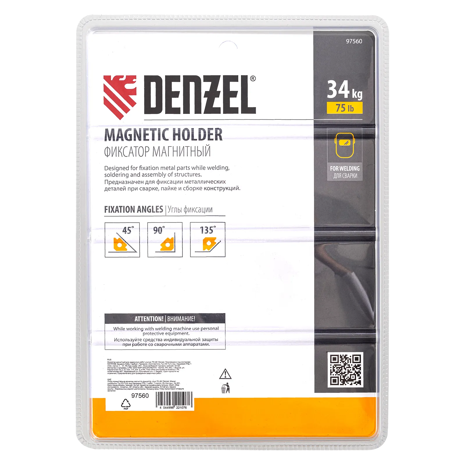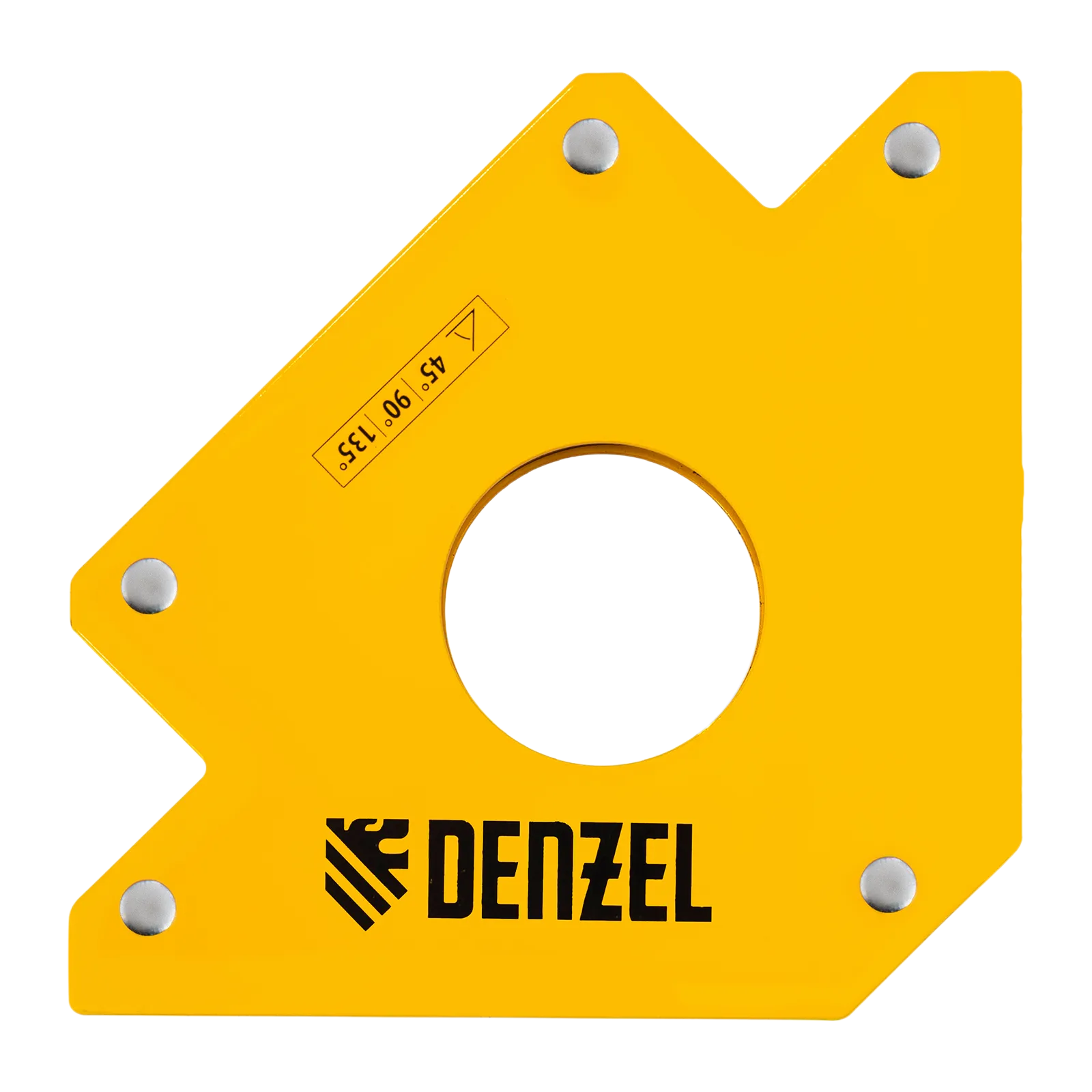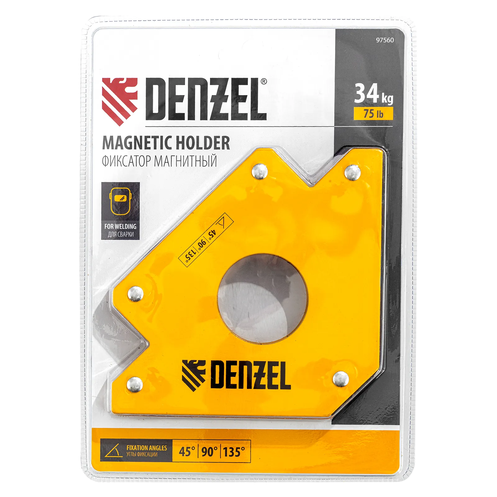 Фиксатор магнитный Denzel 97560 выдерживает усилие 75 LB (34 кг) и используется при проведении сварочных работ. Надежно фиксирует детали разного размера под углом 45°, 90° и 135° без риска их смещения или падения.