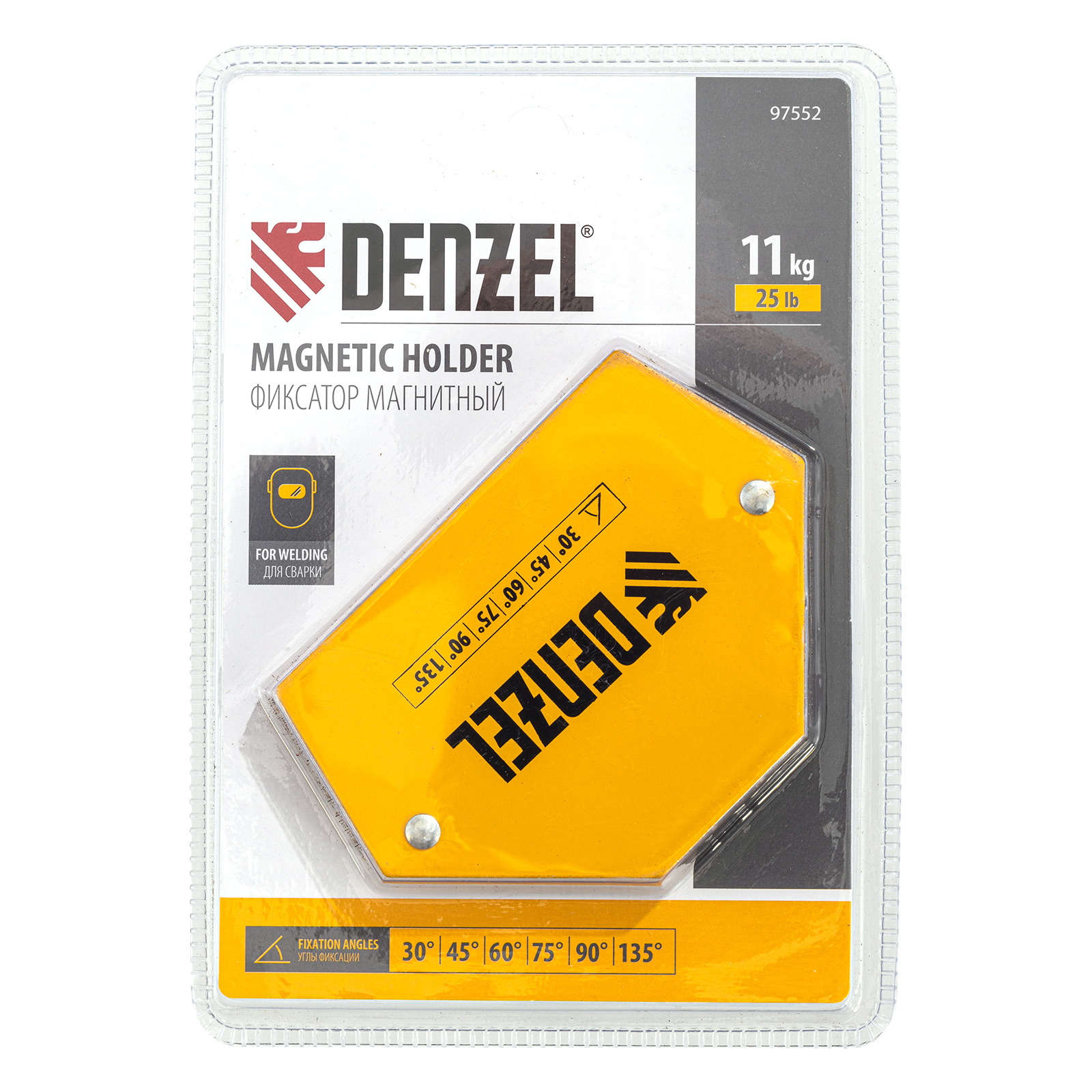 Фиксатор магнитный Denzel 97552 выдерживает усилие 25 LB (11 кг), позволяет соединять металлические детали разного размера под углом 30°, 45°, 60°, 75°, 90° и 135° и используется при проведении сварочных работ.