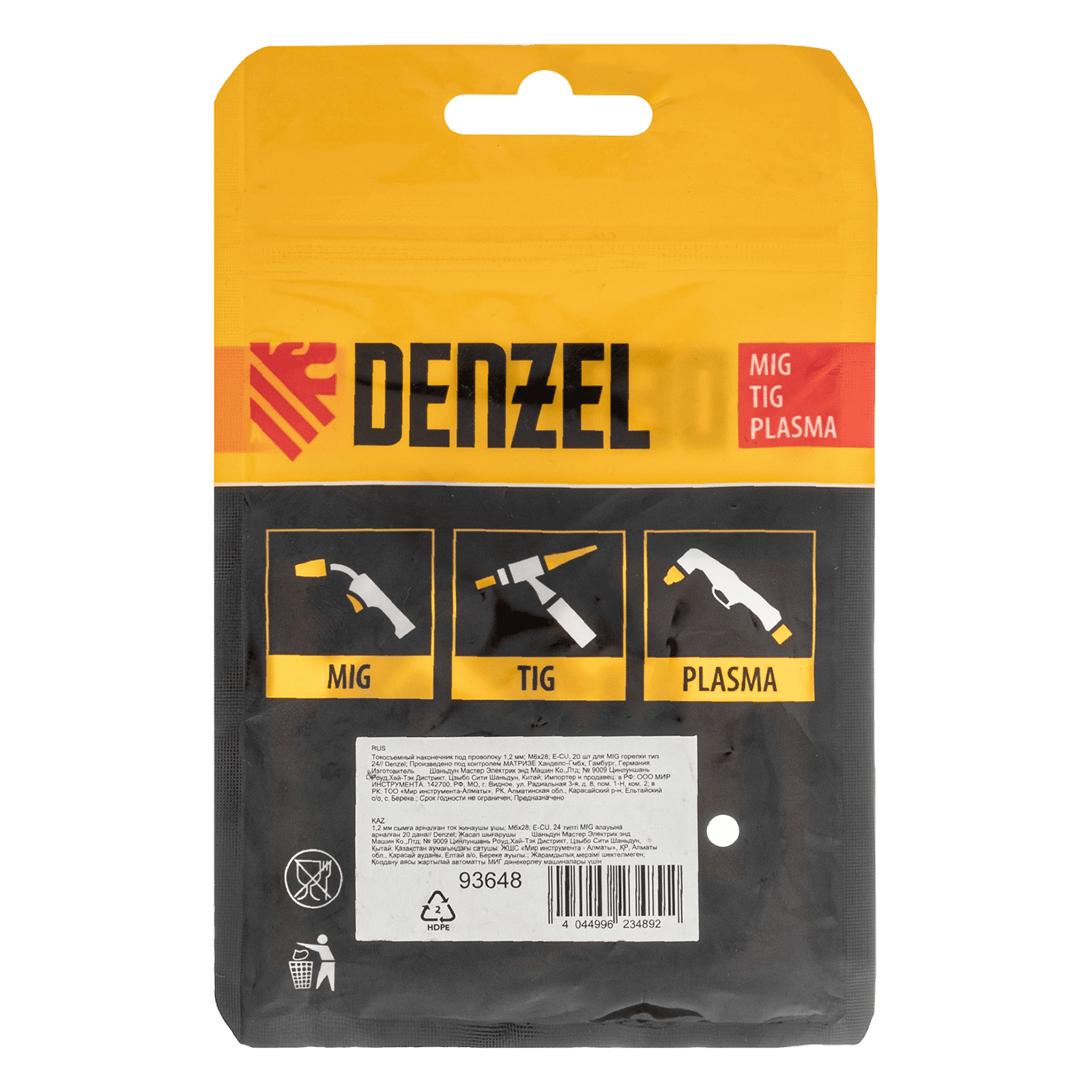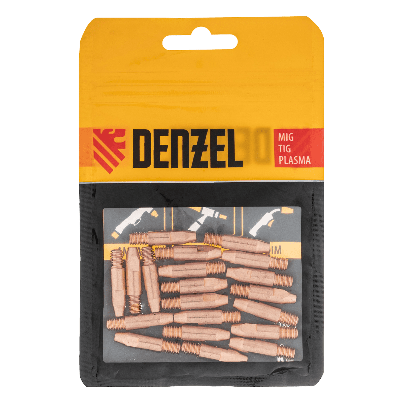 Токосъемный наконечник Denzel 93648 из меди E-CU, с резьбовым соединением M6х28, 20 шт. в упаковке, совместим со сварочными горелками типа 24 (в том числе с моделью Denzel 93642) и предназначен для подвода тока к проволоке диаметром 1,2 мм на выходе в область сварки. Используется для замены изношенной детали и позволяет быстро восстановить работоспособность горелки.