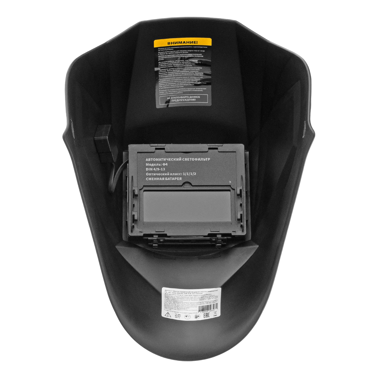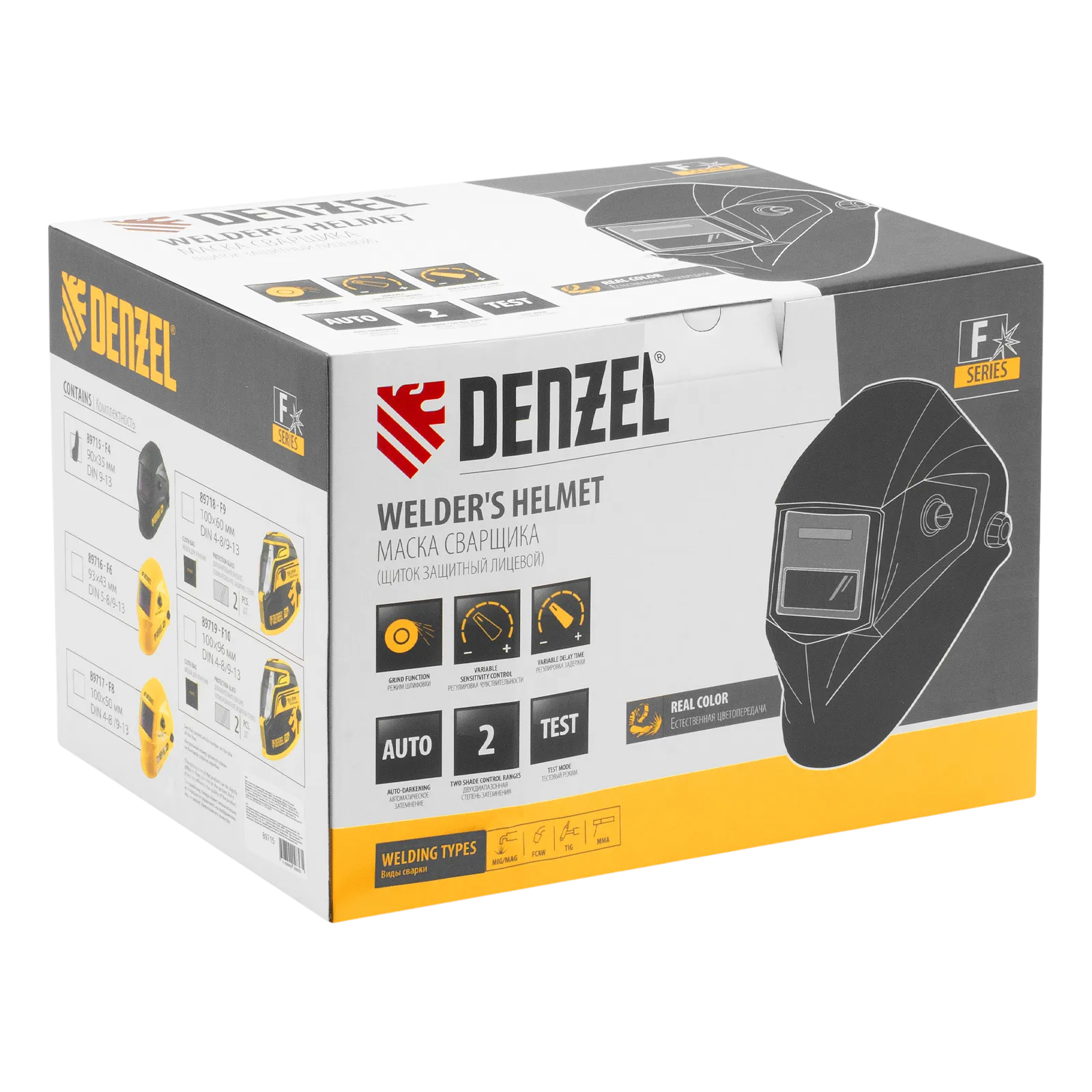Защитный лицевой щиток (маска сварщика) Denzel F4 89715 со смотровым окном размером 90 x 35 мм и функцией затемнения DIN 4/9-13 используется во время проведения сварочных работ. Надежно защищает глаза и лицо пользователя от искр, брызг расплавленного металла, а также от инфракрасного и ультрафиолетового излучения. Корректную работу светофильтра обеспечивают два фотодатчика. Щиток подходит для проведения сварочных работ в режимах MMA, MIG/MAG, TIG, а также для выполнения плазменно-дуговой сварки, плазменной и дуговой резки.