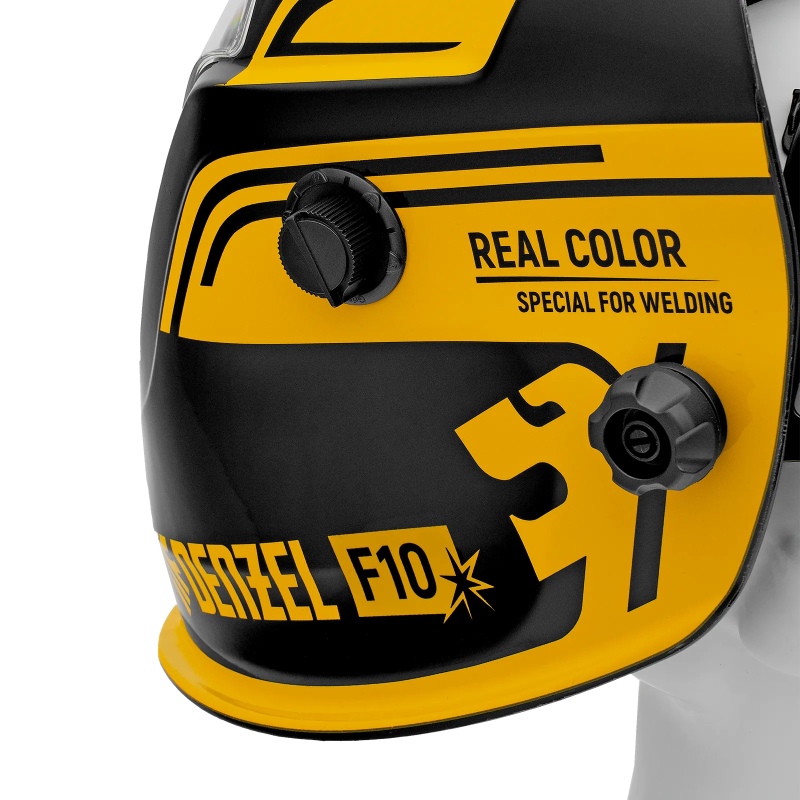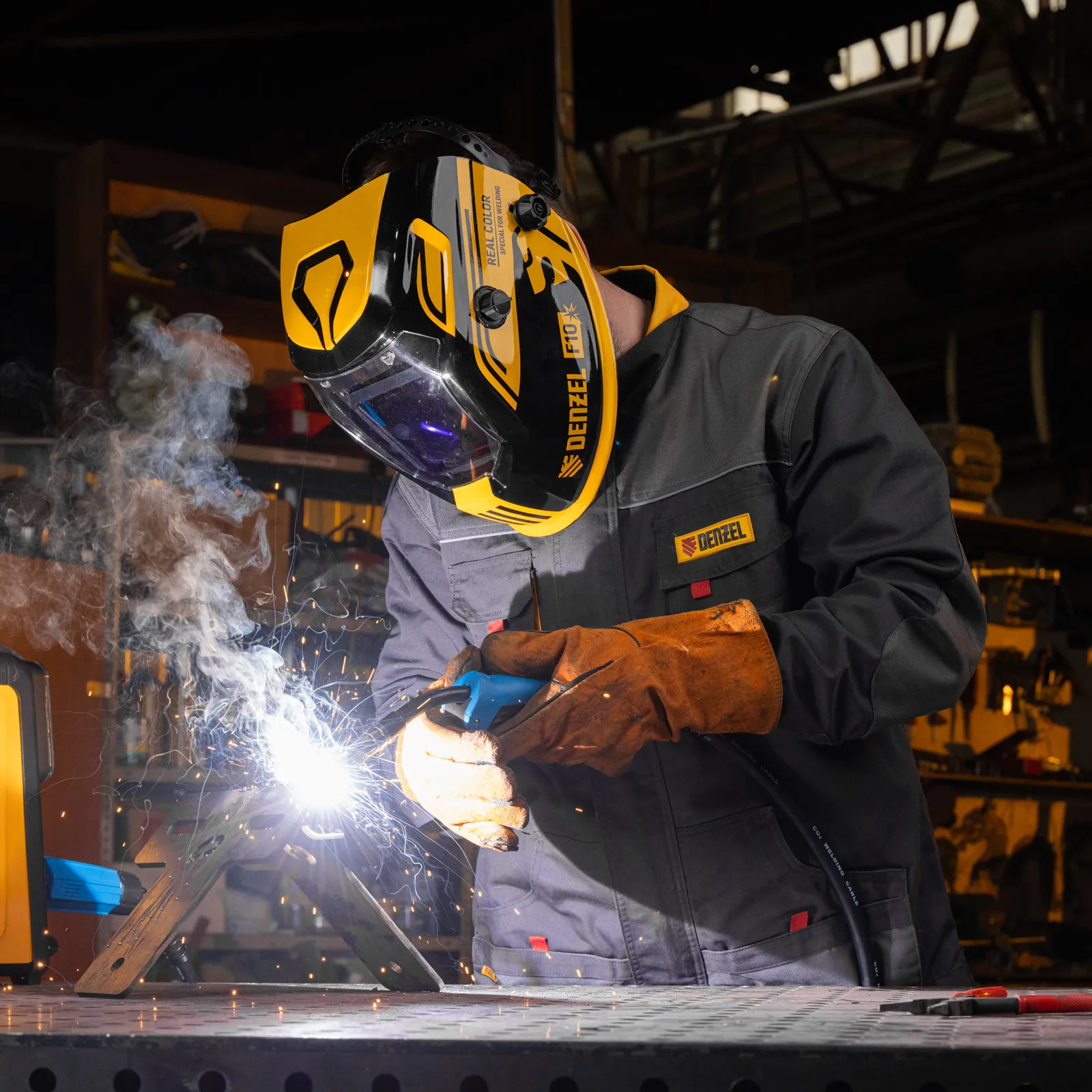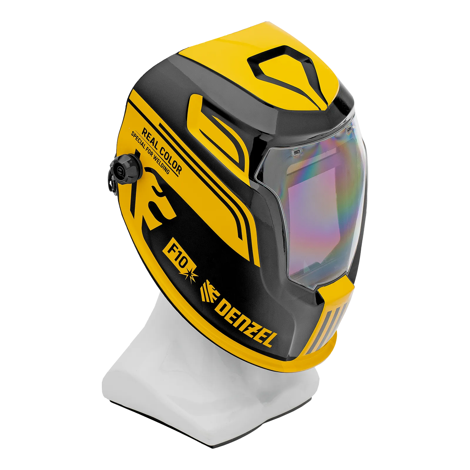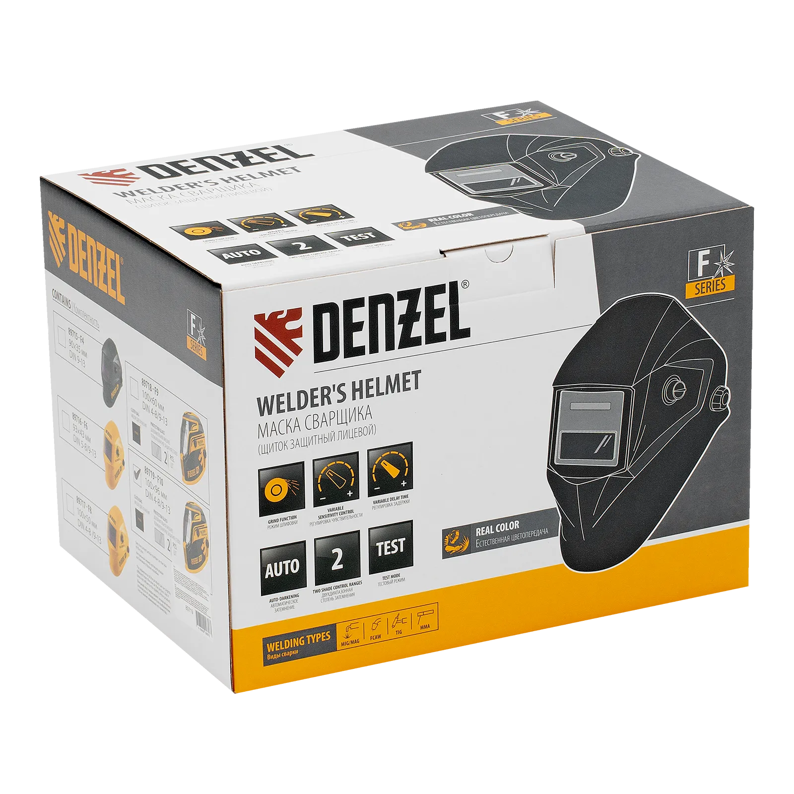 Защитный лицевой щиток (маска сварщика) Denzel F10 89719 со смотровым окном размером 100 x 96 мм, системой Real Color и функцией затемнения в диапазоне DIN 4-8/9-14, предназначен для защиты глаз, лица пользователя, области шеи и частично области плеч от искр, брызг расплавленного металла, а также инфракрасного и ультрафиолетового излучения. Используется во время проведения сварочных работ в различных режимах (MMA, MIG/MAG, TIG). 4 оптических датчика обеспечивают эффективную работу светофильтра. Благодаря системе «хамелеон» экран автоматически темнеет при поджиге дуги (время реагирования 1/25000 с) и светлеет после окончания сварки.