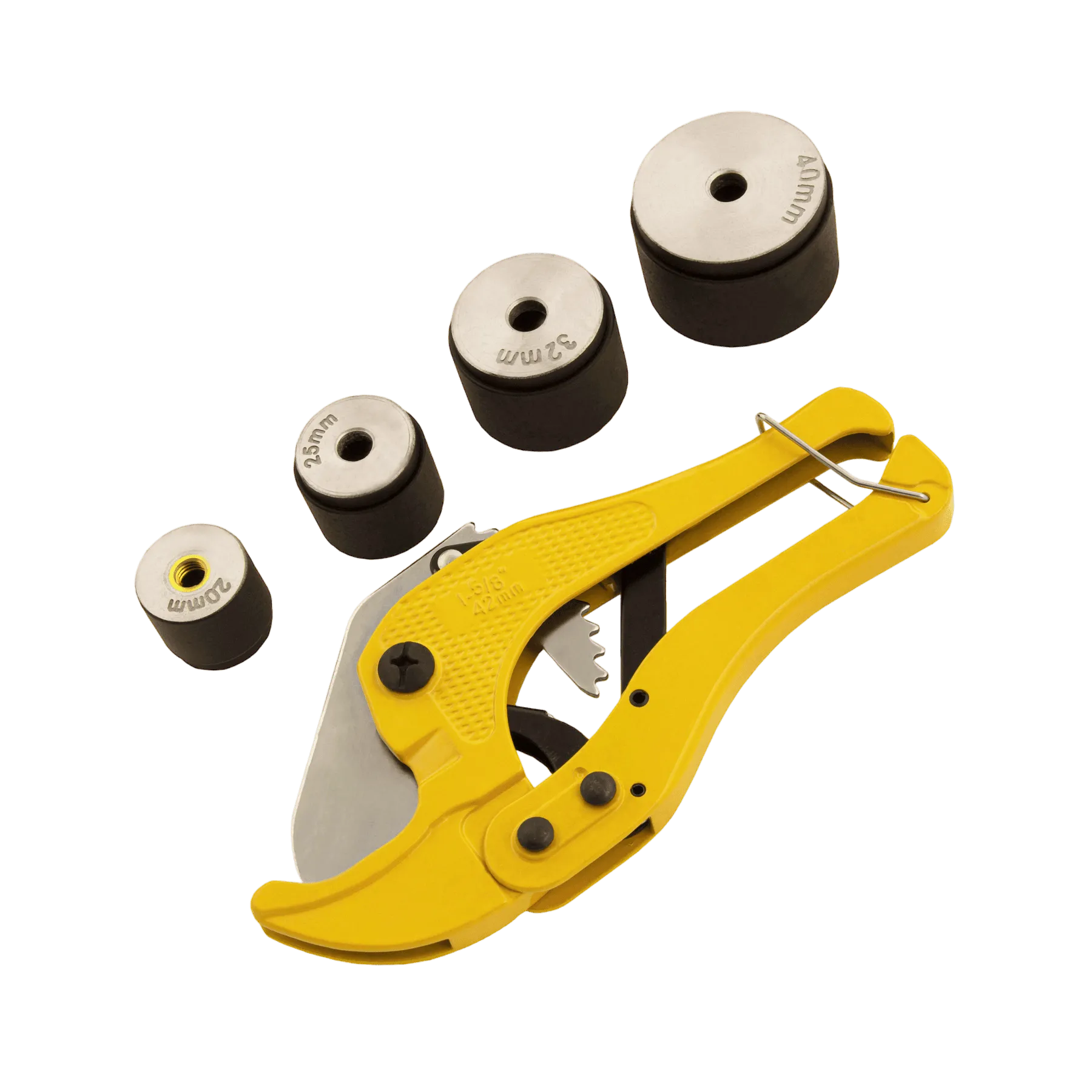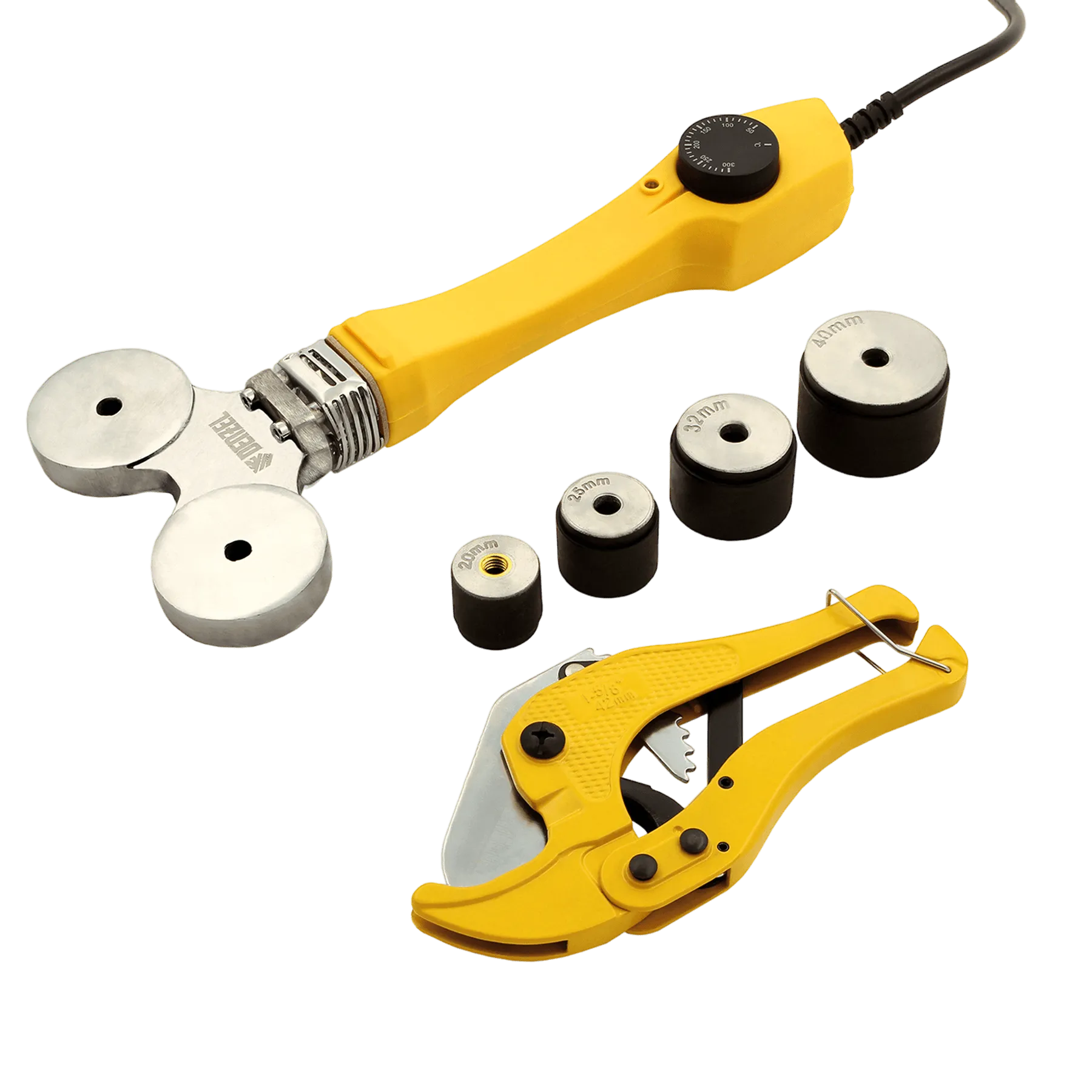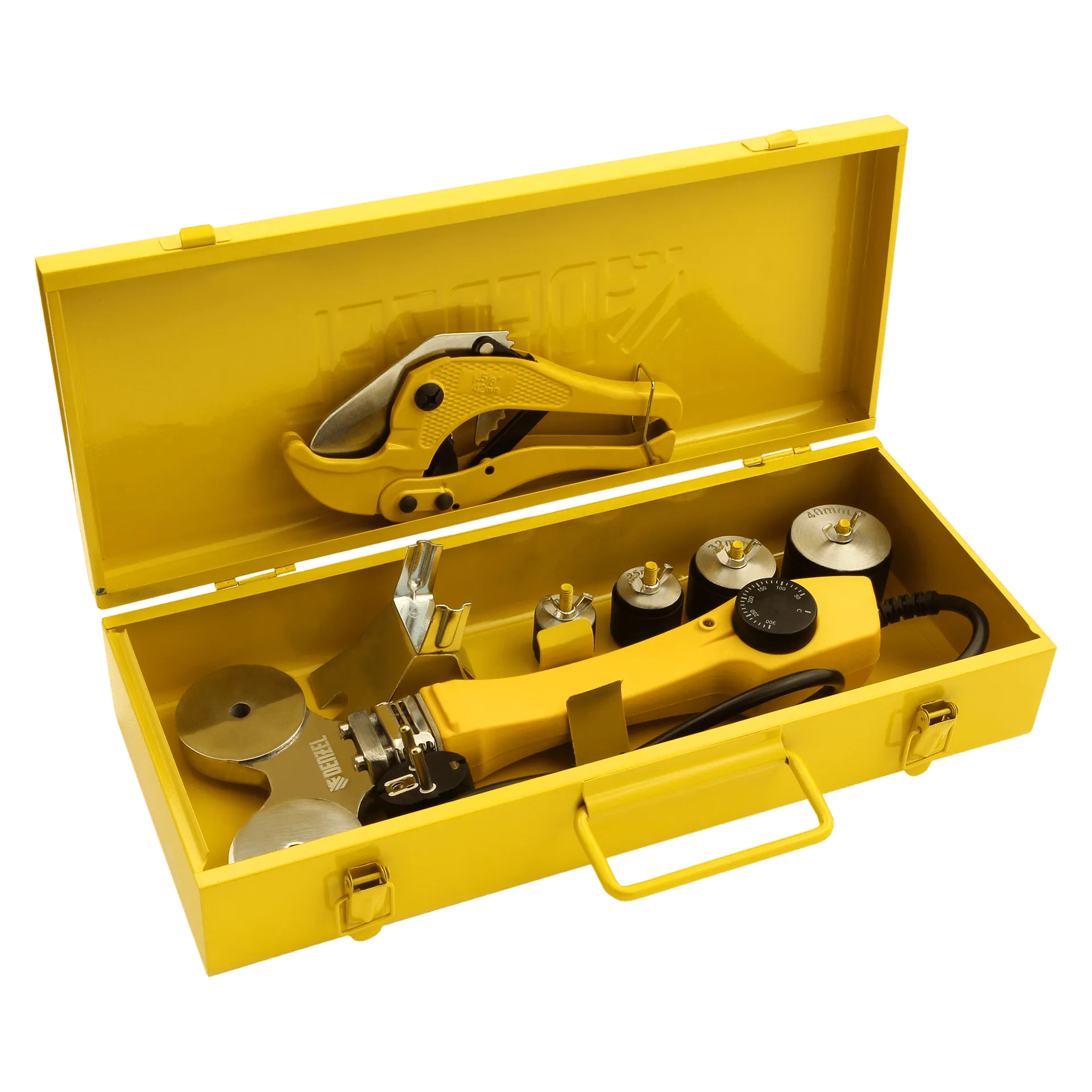 - Широкий комплект поставки — к аппарату прилагаются 4 насадки для соединения труб диаметром 20, 25, 32 и 40 мм, имбусовый ключ и труборез.