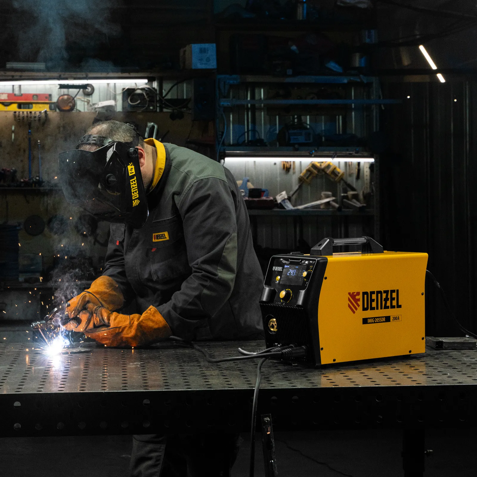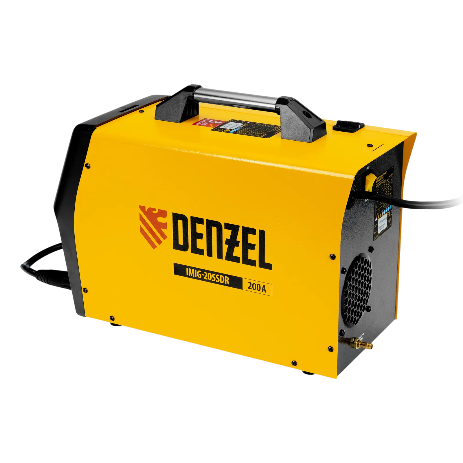 Инверторный аппарат полуавтоматической сварки Denzel IMIG-205SDR 94364 работает с максимальным сварочным током 200 A и совместим с катушками массой от 1 до 5 кг, продолжительность включения составляет 60%. Аппарат разработан с использованием передовой инверторной технологии IGBT, что обеспечивает стабильный сварочный ток на выходе и высокий КПД при низком энергопотреблении. Возможна работа при нестабильном напряжении в сети. Синергетическое управление упрощает подбор параметров сварки в зависимости от конкретной задачи: аппарат предлагает оптимальные значения напряжения, скорости подачи проволоки и т.д.