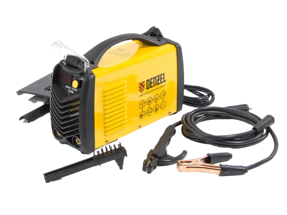 Аппарат инверторной дуговой сварки Denzel MMA-160ID 94345 с проводом длиной 2 м характеризуется величиной ПВР 60% и позволяет работать с максимальным сварочным током 160 А электродами диаметром 1,6-3,2 мм. Представляет собой компактный аппарат для бытового использования на даче, в гараже или мастерской. Уверенно работает даже при нестабильном входном напряжении в диапазоне 150-250 В, удобен для сварки в малодоступных местах.