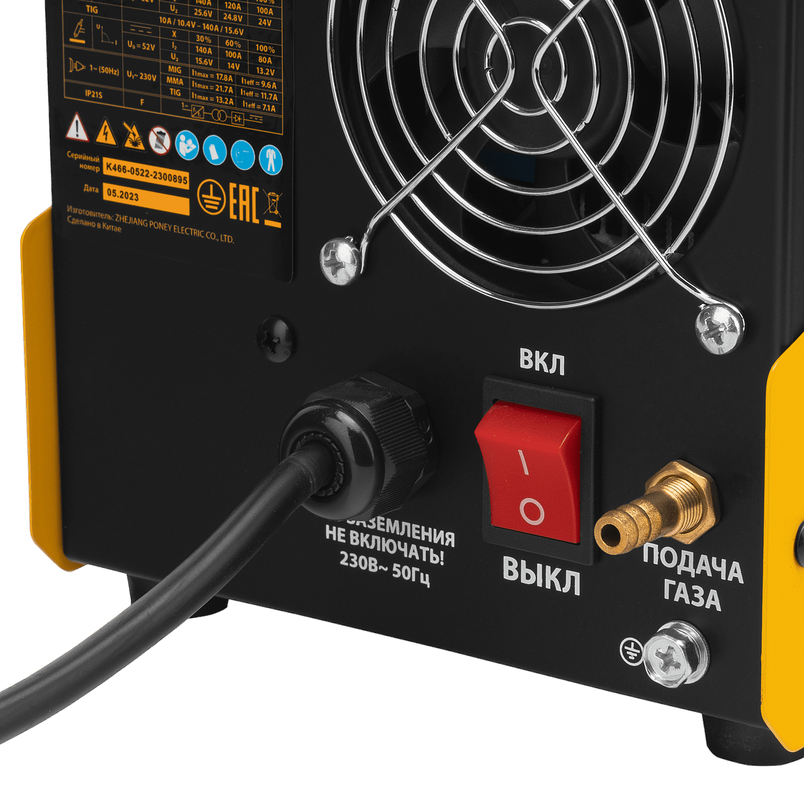 - Много рабочих режимов — MMA (ручная дуговая сварка покрытым элетродом 1,6-4 мм), MIG/MAG (полуавтоматическая сварка в среде защитного газа проволокой диаметром 0,8/0,9 мм), FCAW (сварка порошковой проволокой без подачи газа), LIFT TIG (аргонодуговая сварка вольфрамовым неплавящимся электродом, горелка в комплект не входит).