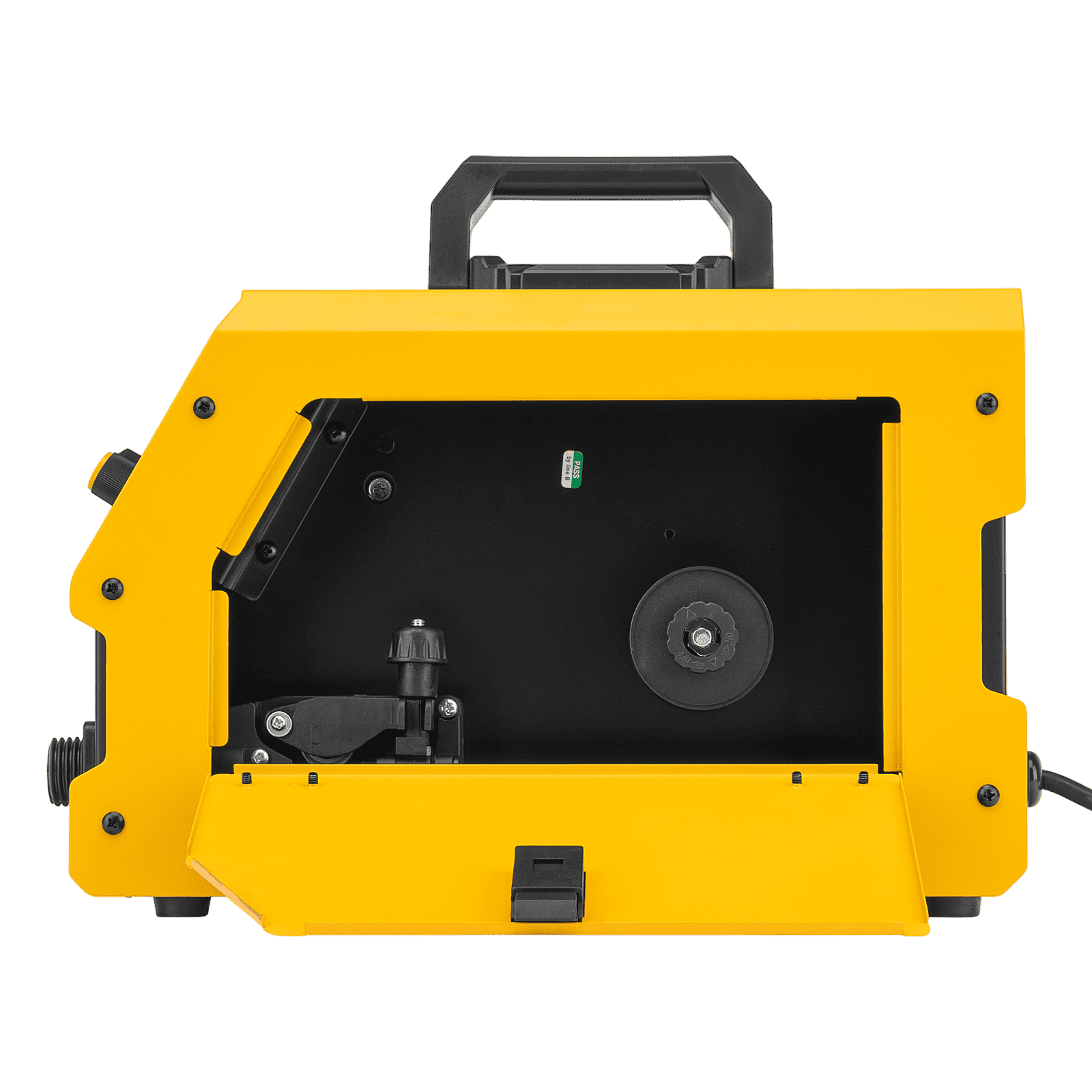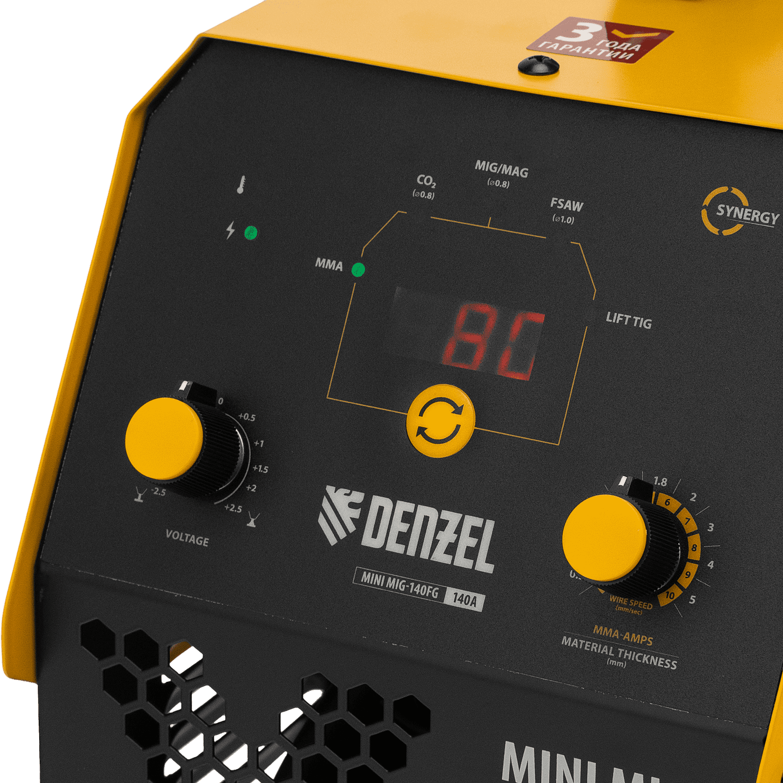 - Синергетическое управление — в режимах MIG и FCAW происходит автоматическая корректировка скорости подачи проволоки и напряжения сварочной дуги.