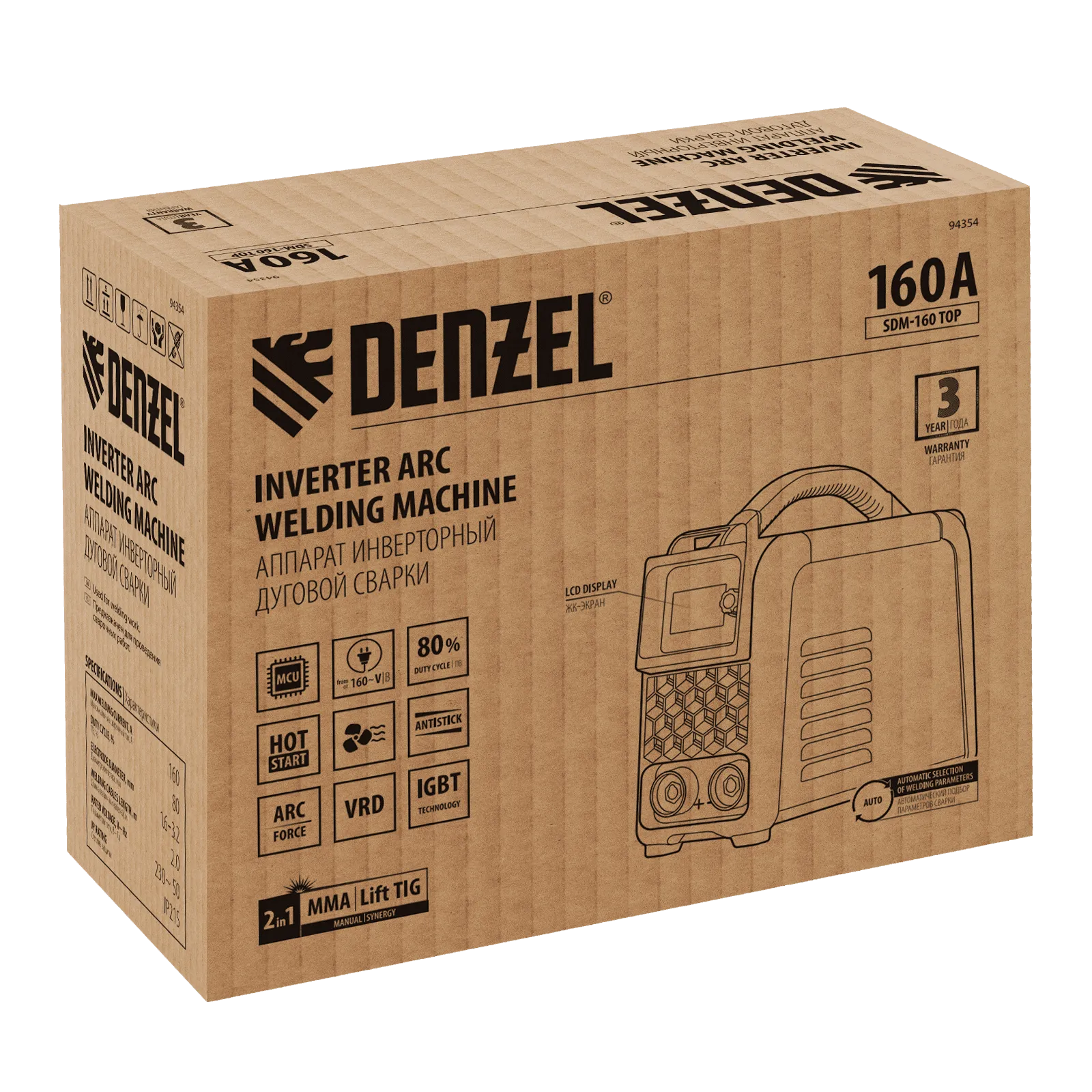 Инверторный аппарат дуговой сварки Denzel SDM-160 Top 94354 характеризуется увеличенной продолжительностью включения 80% и работает со сварочным током до 160 А. Предназначен для сварки штучными электродами диаметром до 3,2 мм изделий из низкоуглеродистых сталей в режиме MMA, а также аргонодуговой сварки неплавящимся электродом TIG LIFT, оптимальной для заготовок из чугуна и нержавеющей стали (горелка приобретается отдельно).;Основное достоинство линейки Denzel SDM — синергетическое управление, значительно облегчающее подбор оптимальных параметров сварки. Аппарат дает возможность указать толщину свариваемого металла, после чего автоматически подбирает оптимальный сварочный ток и диаметр электрода. И наоборот: достаточно установить требуемое значение сварочного тока и на дисплее отобразится минимальная рекомендованная толщина свариваемых деталей, а также диаметр электрода. Аппарат эффективно работает даже при нестабильном напряжении, предназначен для использования в профессиональной сфере и в быту.