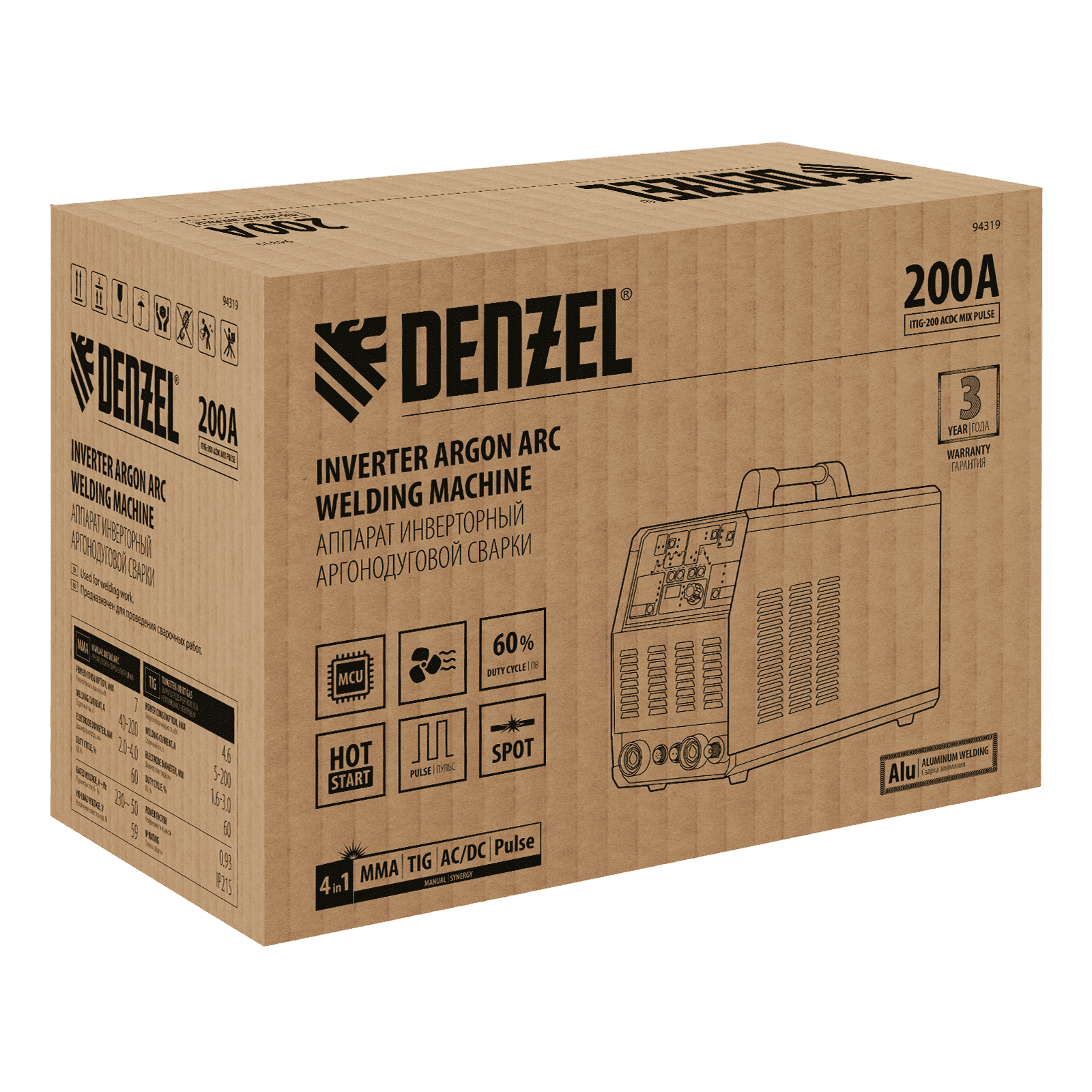 Инверторный аппарат аргонодуговой сварки Denzel ITIG-200 ACDC Mix Pulse 94319 работает с максимальным сварочным током 200 А, продолжительность включения составляет 60%. Позволяет работать с использованием как переменного, так и постоянного тока, поэтому подходит для сварки не только сплавов из стали, но и цветных металлов, таких как медь, титан, а также алюминия и его сплавов. Используется для аргонодуговой сварки неплавящимся электродом (TIG) и MMA-сварки покрытым электродом диаметром 4-5 мм. Возможны следующие режимы TIG-сварки: на постоянном токе DC, импульсным постоянным током Pulse DC, сварка переменным током AC, а также переменным током с режимом глубокого проникновения в импульсном режиме MIXTIG AC. Сварочный аппарат изготовлен с использованием передовой технологии IGBT, обеспечивает стабильный сварочный ток и высокий КПД в течение всего срока службы.