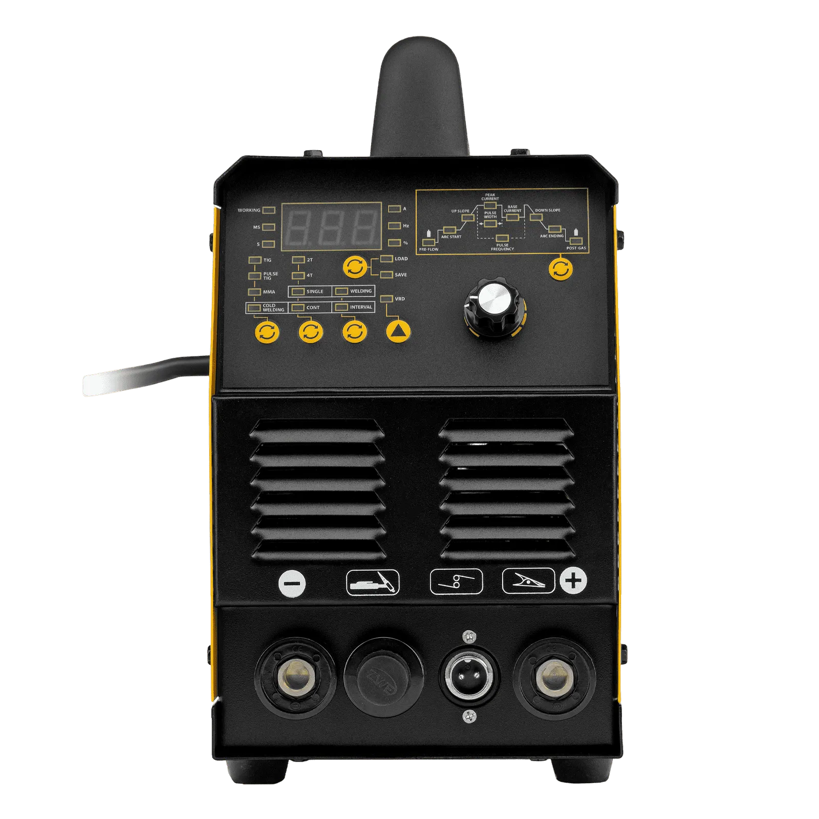 Основные функции;Выбор алгоритма включения/завершения сварочного процесса:;2Т — ориентирован на выполнение коротких и непродолжительных швов. Функционирует по принципу: нажатие кнопки, розжиг дуги, сварка, отпускание кнопки, гашение дуги.;4T — рассчитан на выполнение длинных швов. Принцип работы: первое нажатие и моментальное отпускание кнопки, розжиг дуги, сварочный процесс, второе нажатие и моментальное отпускание кнопки, гашение дуги.;Выбор режима TIG-сварки: ;Pulse TIG — сварочный аппарат чередует заданные значения пикового и базового тока. Режим позволяет лучше контролировать тепловложение, чтобы избежать перегрева или проплавления свариваемых деталей, будет полезен при сварке тонких деталей или деталей, склонных к тепловым деформациям.;Cold Weld — можно работать с очень тонким металлом, не деформируя его в процессе проведения работ за счет возможности задавать короткое время сварки (в миллисекундах).;Гибкая настройка всех параметров автоматизированного цикла сварки в широком диапазоне значений: