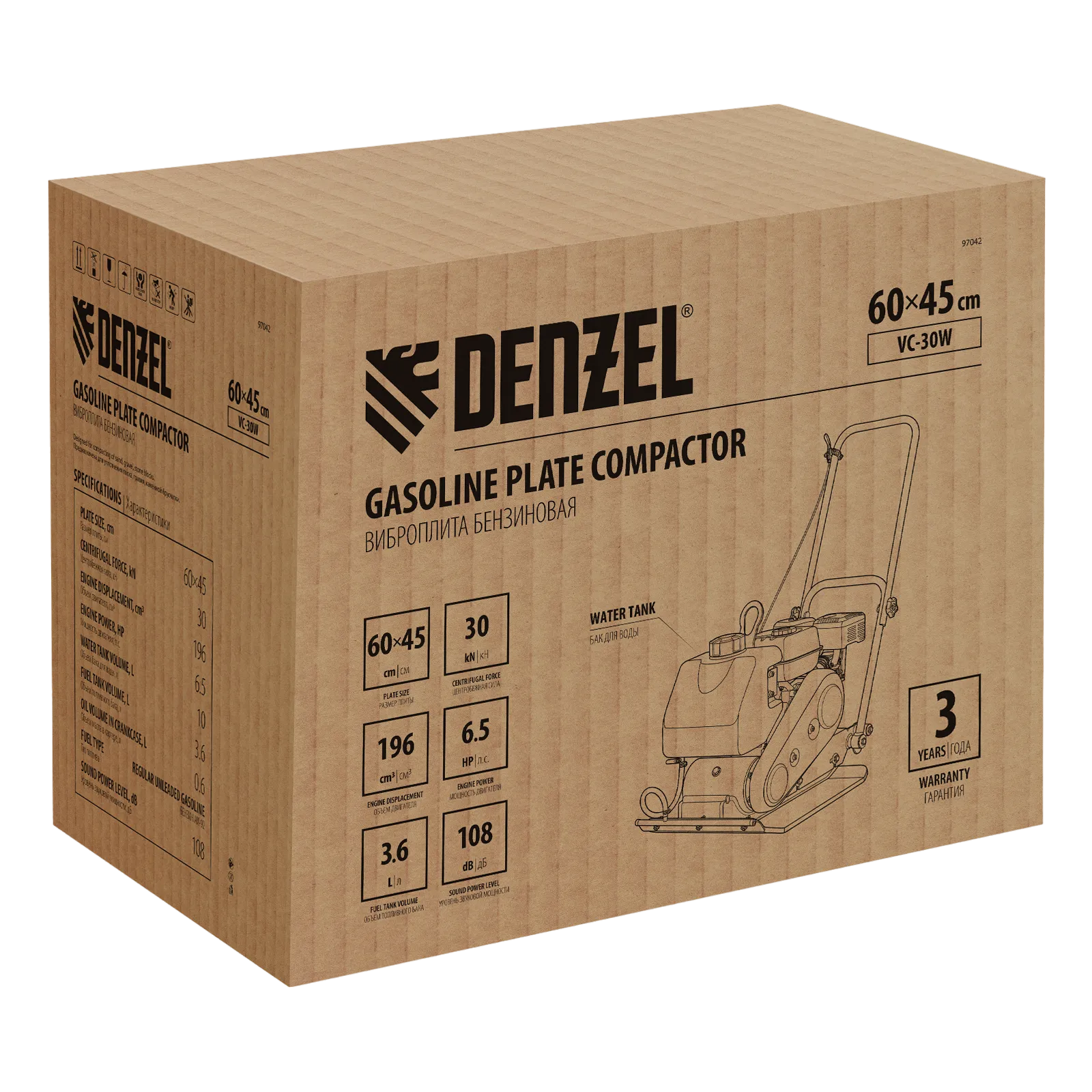 Виброплита бензиновая Denzel VC-30W 97042 с основанием размером 60 х 45 см, оснащена двигателем объемом 196 см3, баком для воды, и воздействует на поверхность с центробежной силой 30 кН. Применяется для уплотнения грунта, асфальта, щебеночного покрытия и других материалов. Ровная рабочая поверхность обеспечивает высокое качество выполняемых работ. Виброплита может использоваться на строительной площадке и при проведении дорожного ремонта.