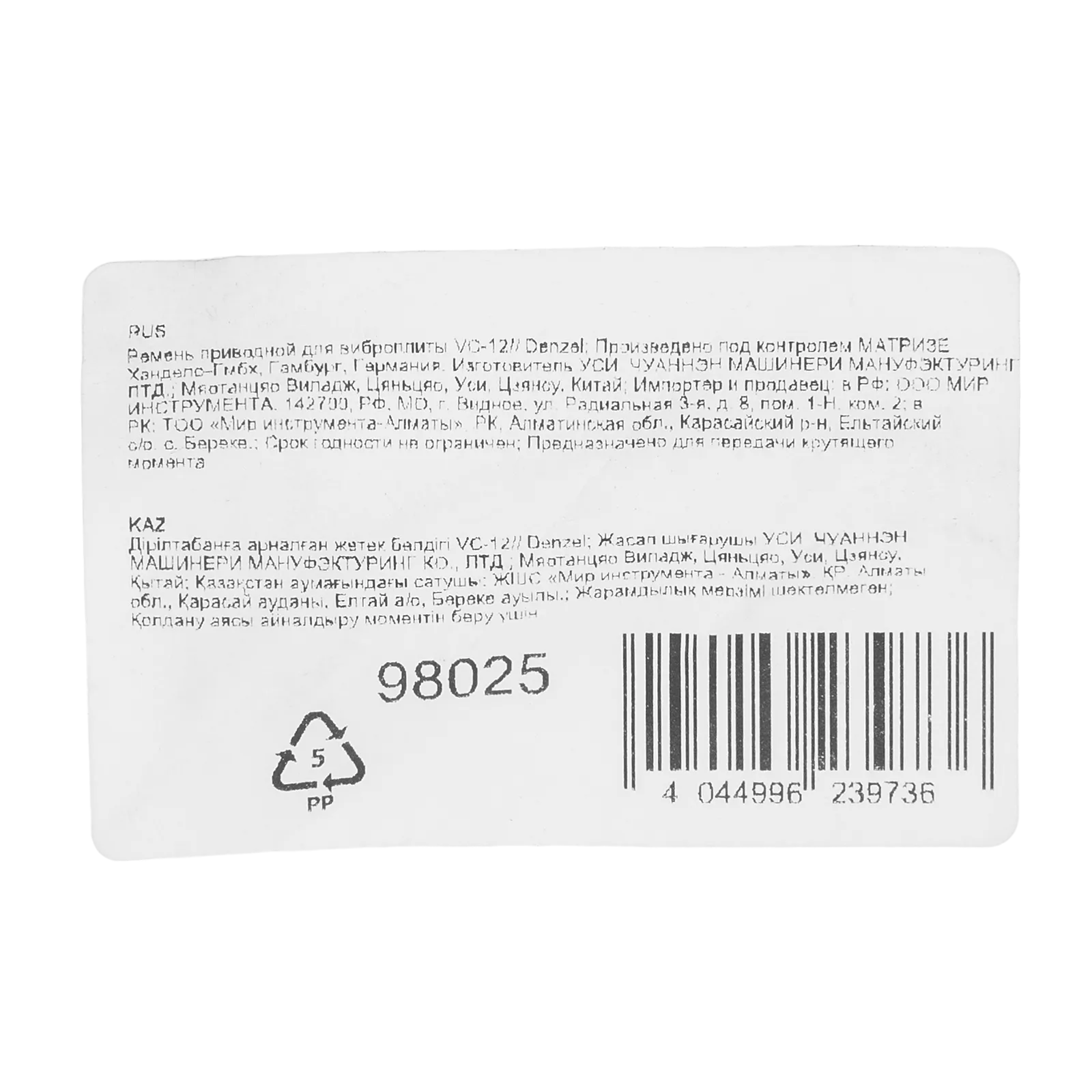 Приводной ремень Denzel 98025 передает крутящий момент с выходного вала, обеспечивая эффективное функционирование виброплиты Denzel VC-12. Позволяет восстановить работоспособность техники в случае растяжения или обрыва установленного ремня.