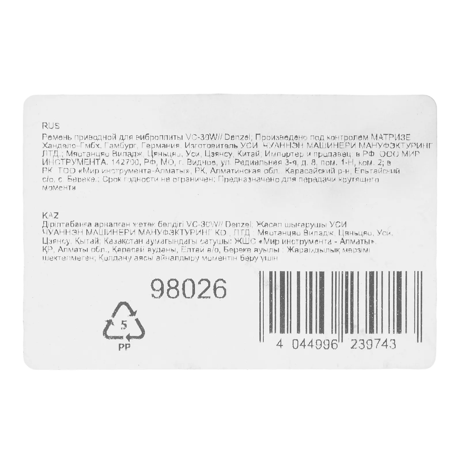 Приводной ремень Denzel 98026 передает крутящий момент с выходного вала, обеспечивая эффективное функционирование виброплиты Denzel VC-30W. Позволяет восстановить работоспособность техники в случае растяжения или обрыва установленного ремня.