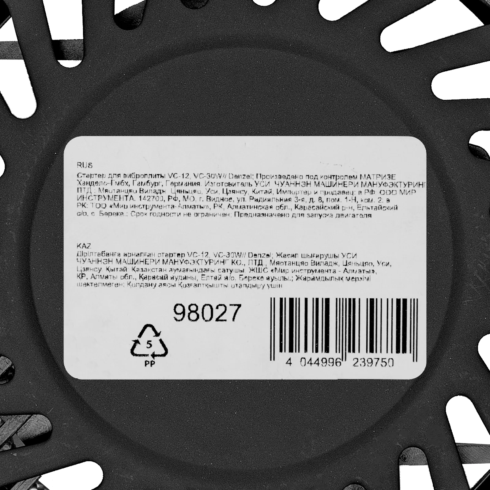 Стартер Denzel 98027 — пусковой механизм для виброплит Denzel VC-12 и VC-30W. Обеспечивает быстрый запуск двигателя. Предназначен для замены вышедшего из строя узла.